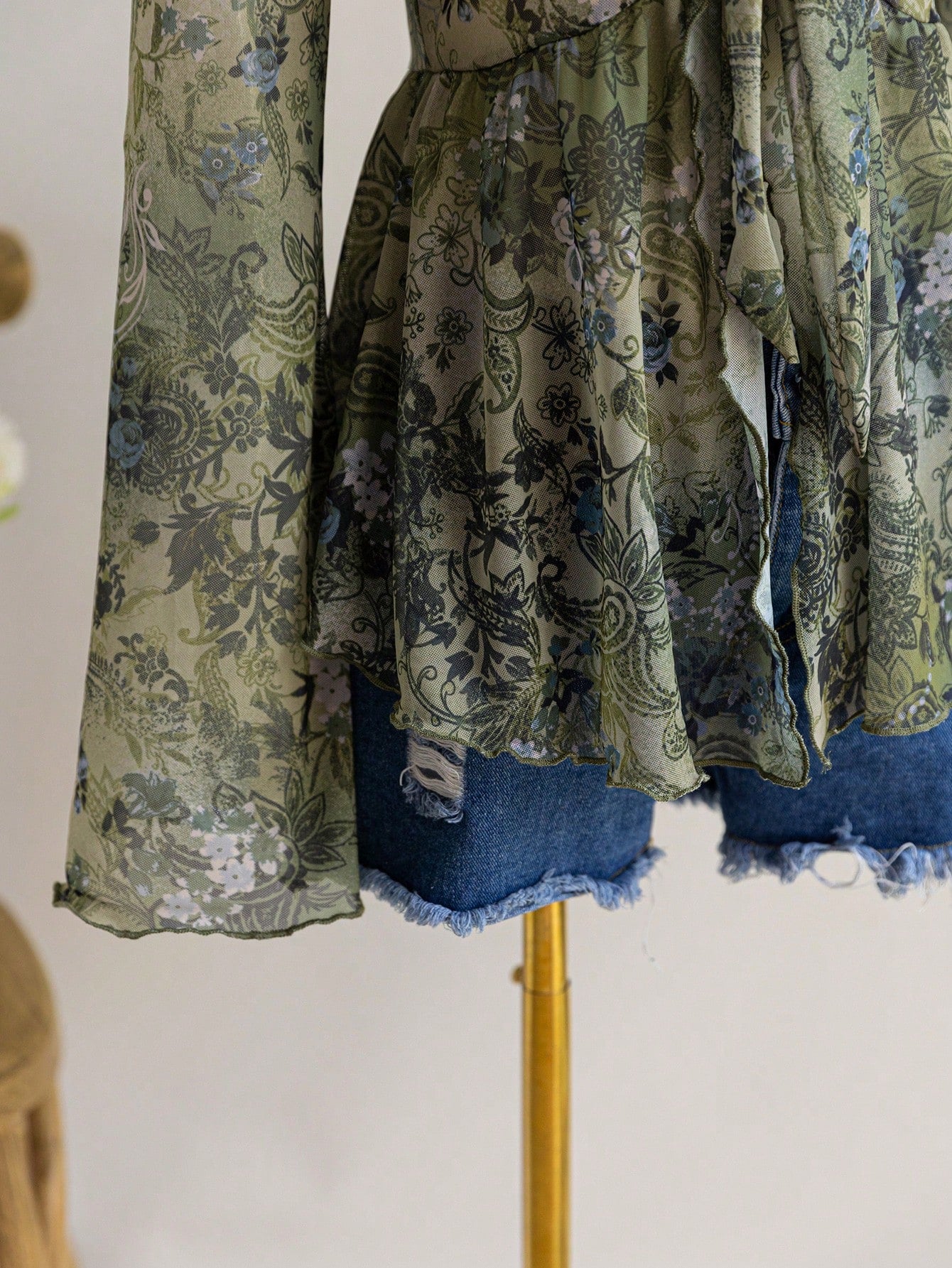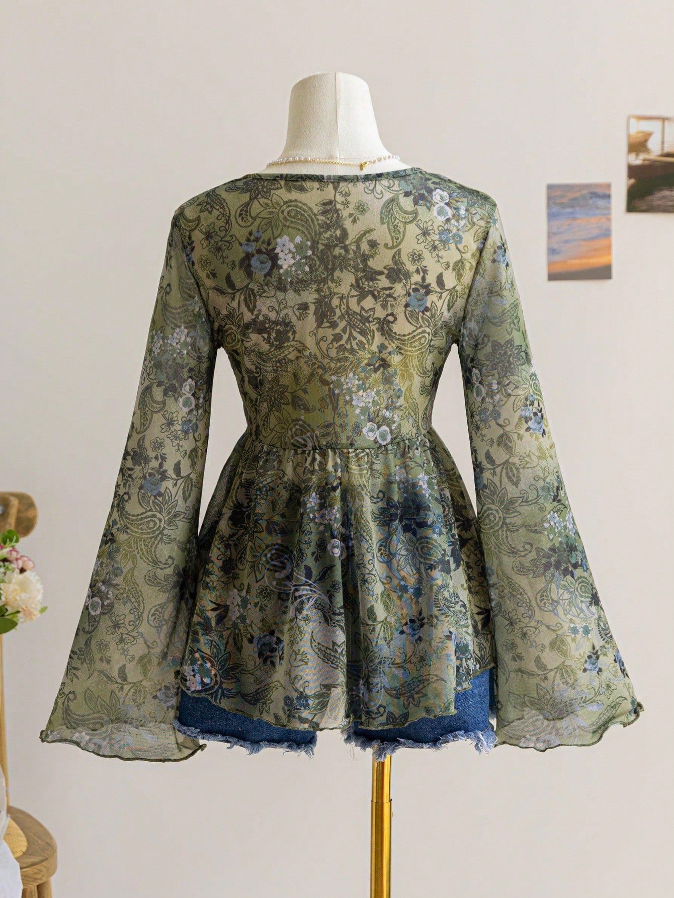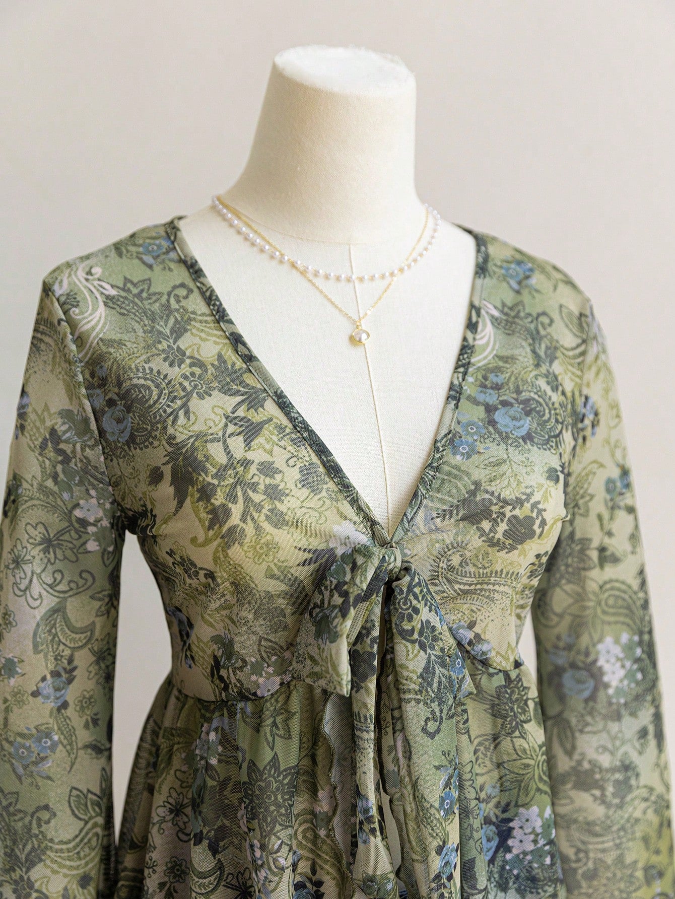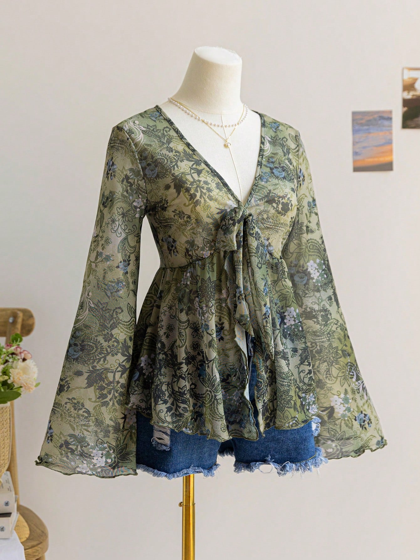 Soleia Women's Retro V-Neck Lace-Up Bowknot Flared Sleeve Asymmetrical Hem Top, Fall & Winter Women Clothes,
