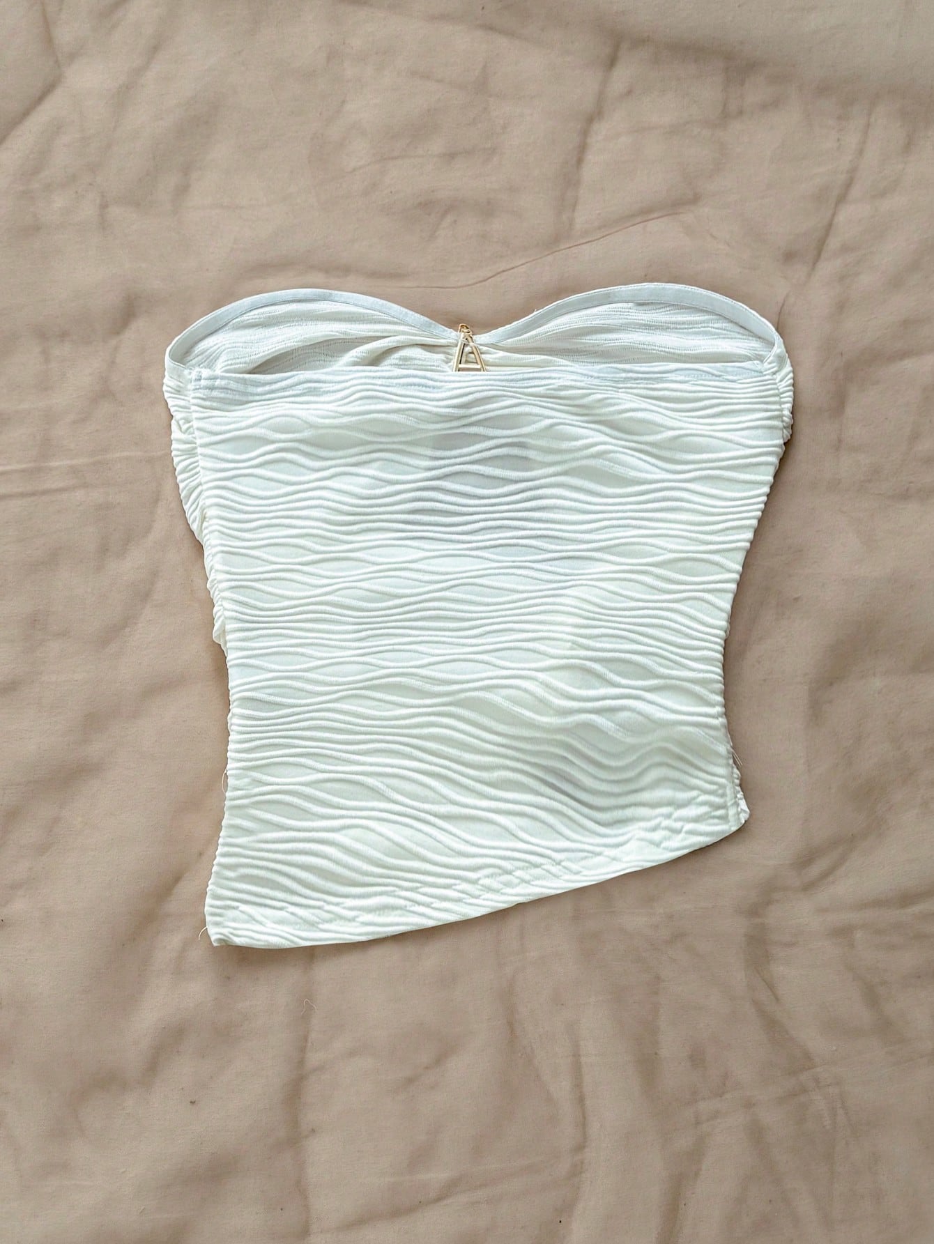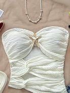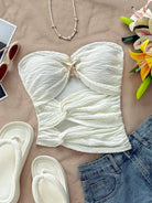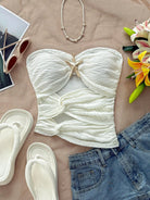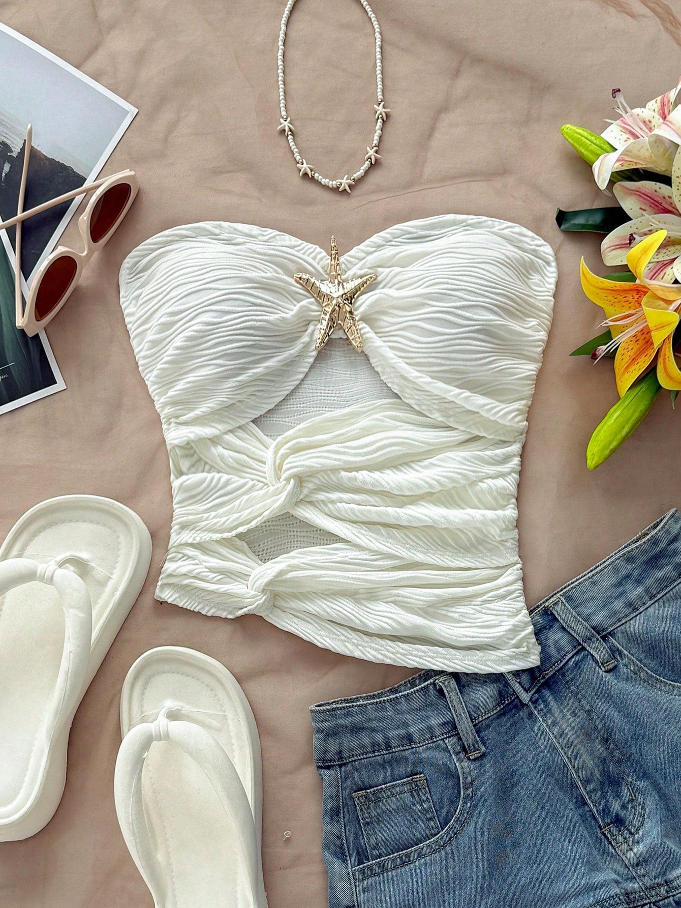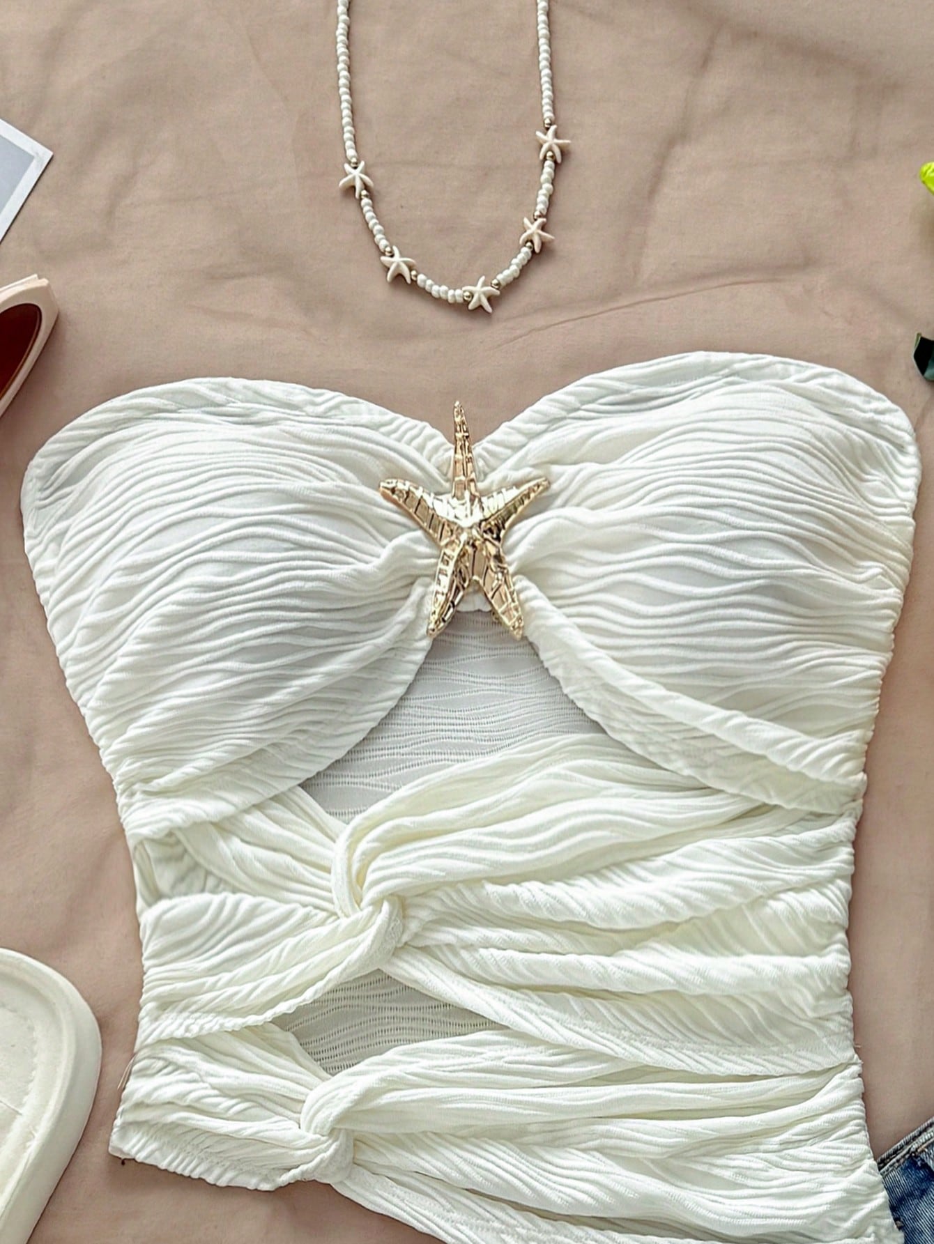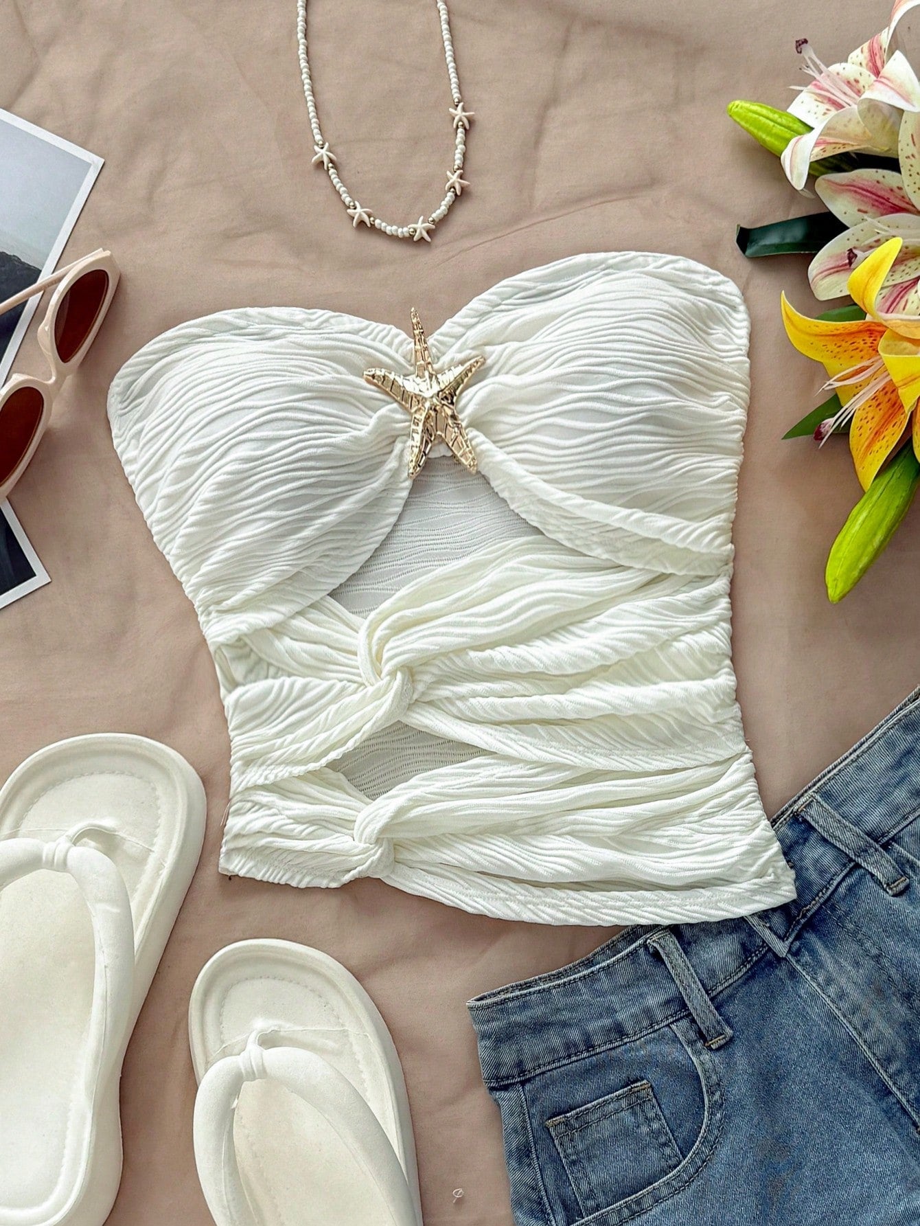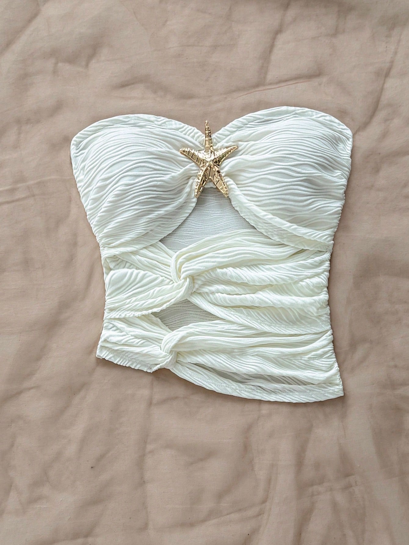 Soleia Women's Vacation White Knit Textured Fabric Fitted Strapless Top With Starfish Cutout Asymmetrical