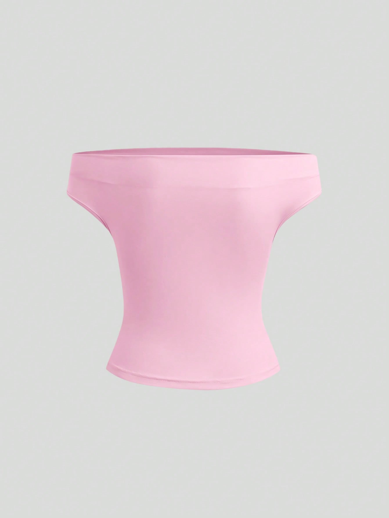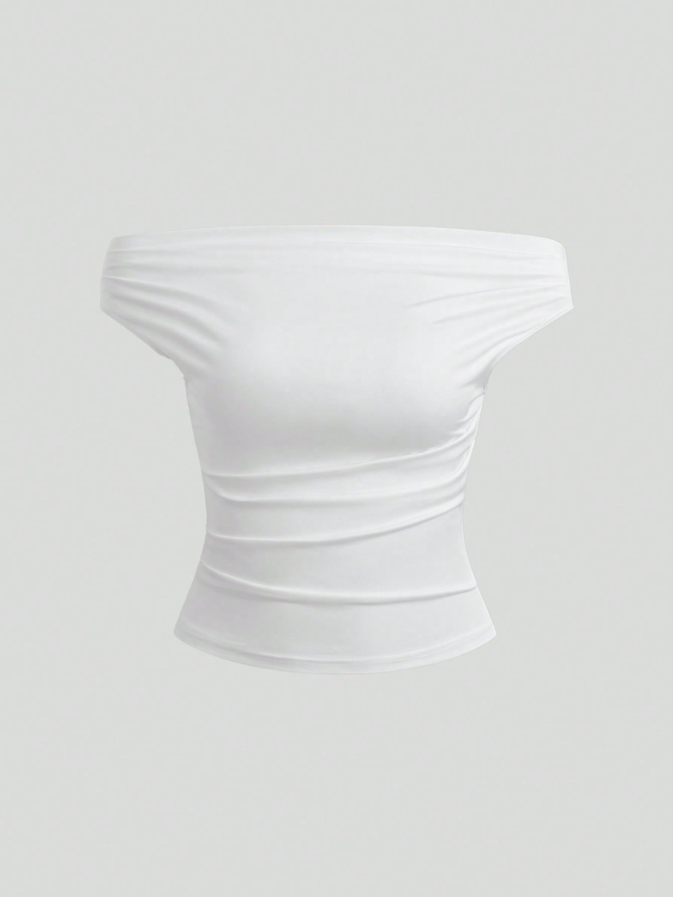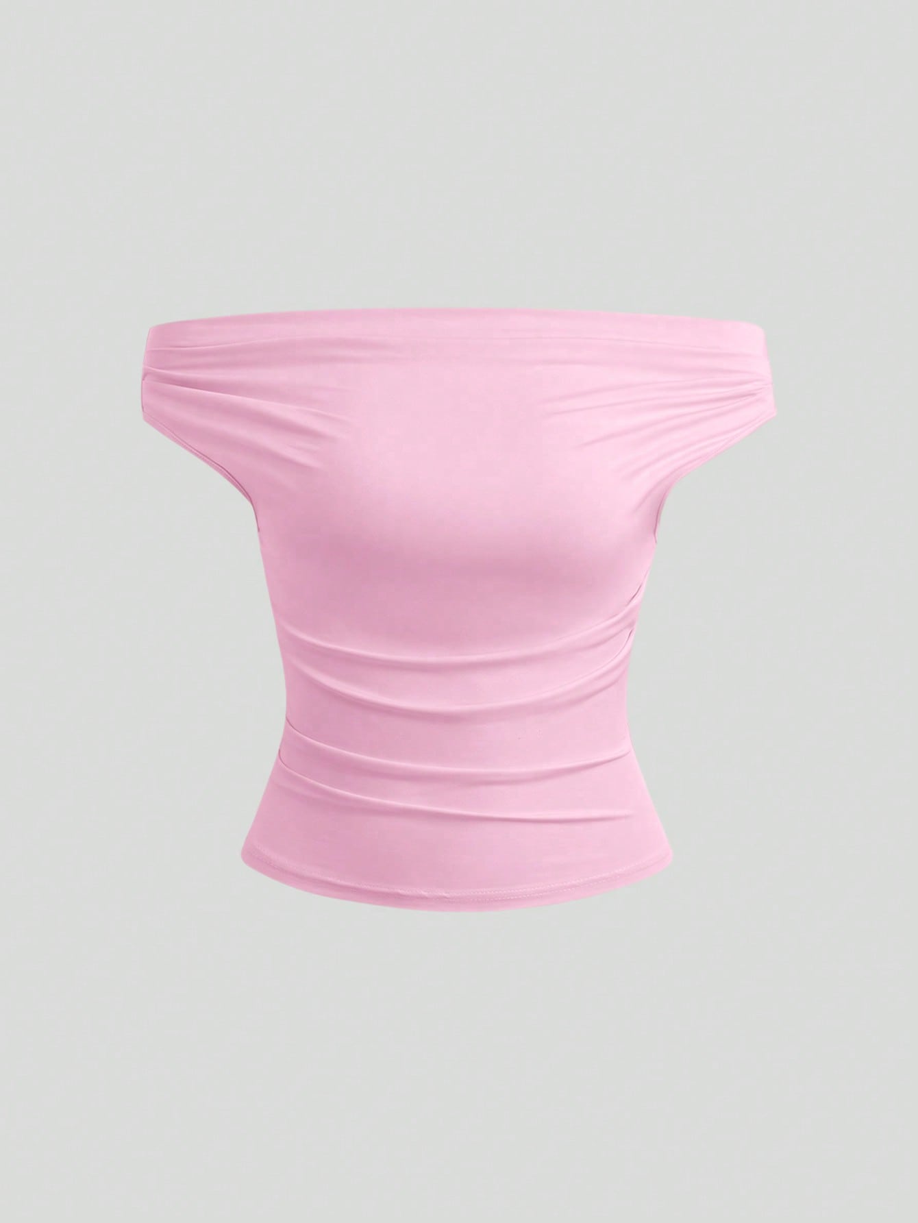 Sweetra 1pc Women's Vacation Pleated Fashionable Fitted Off Shoulder Blouse