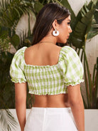 Tie Front Puff Sleeve Shirred Back Gingham Top