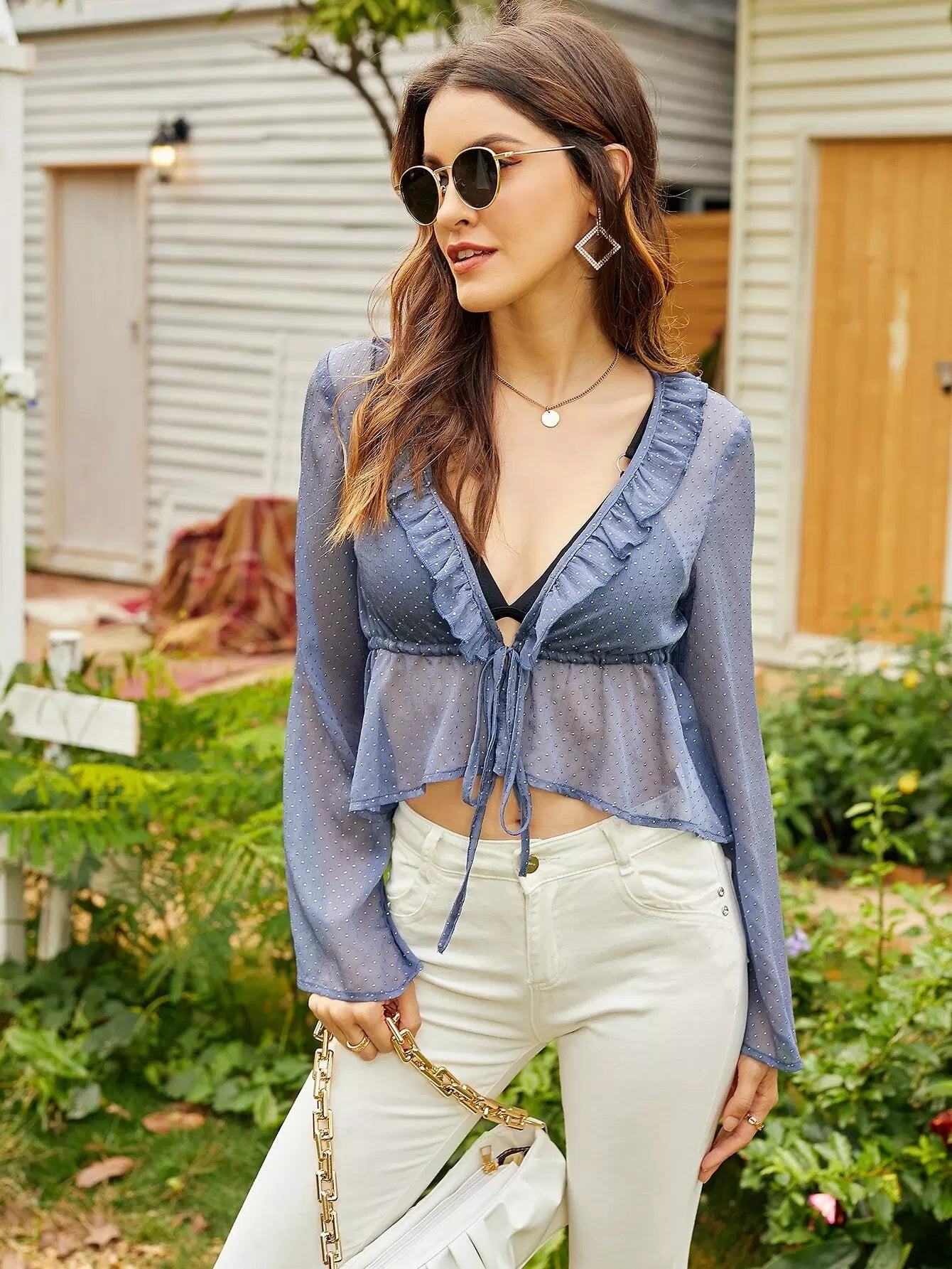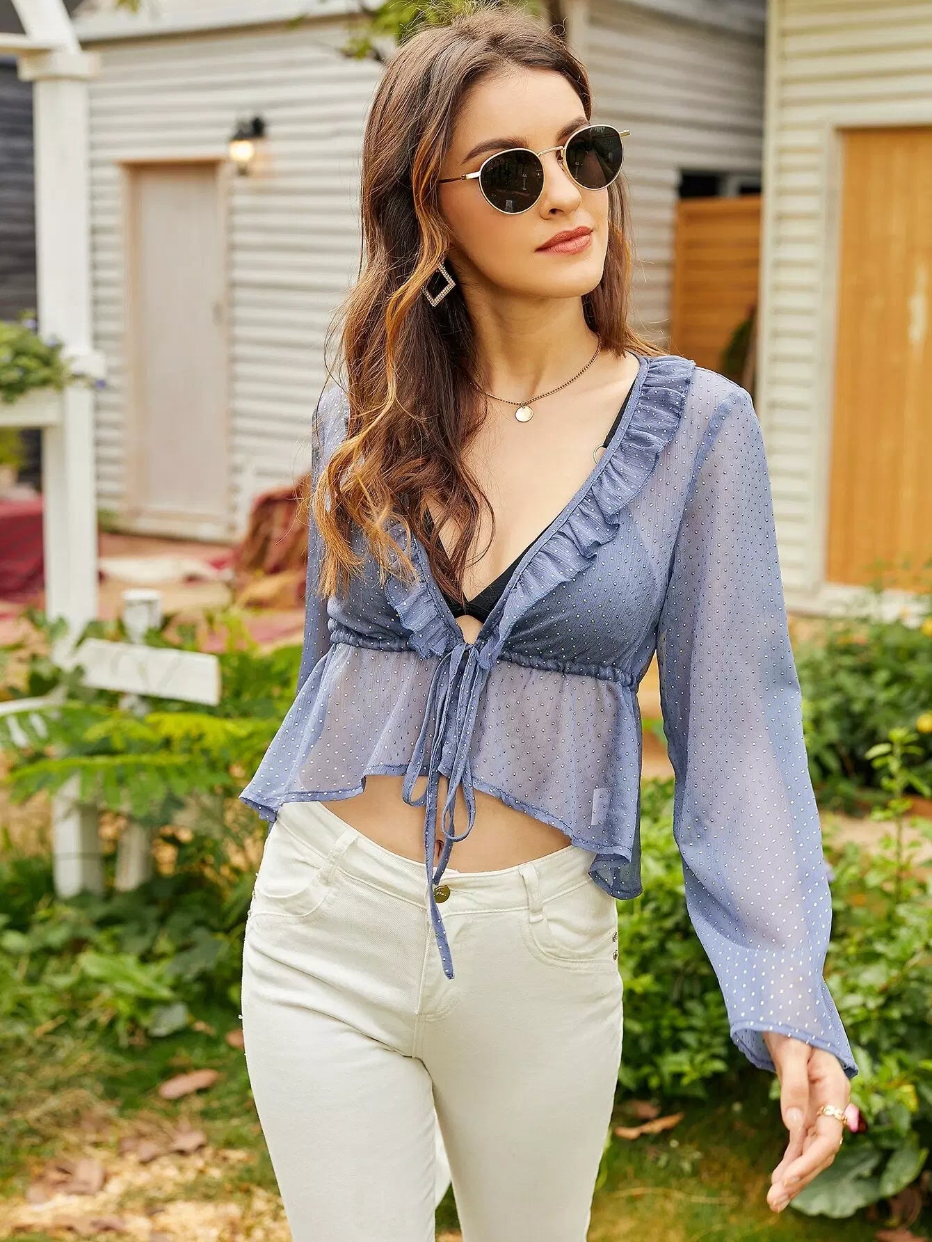 Tie Front Ruffle Trim Gold Dot Sheer Top