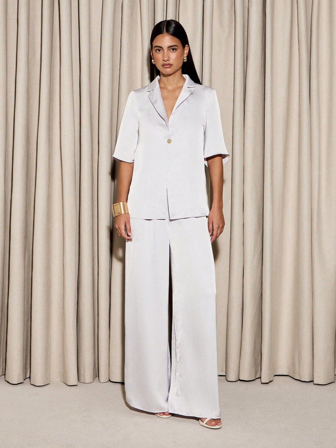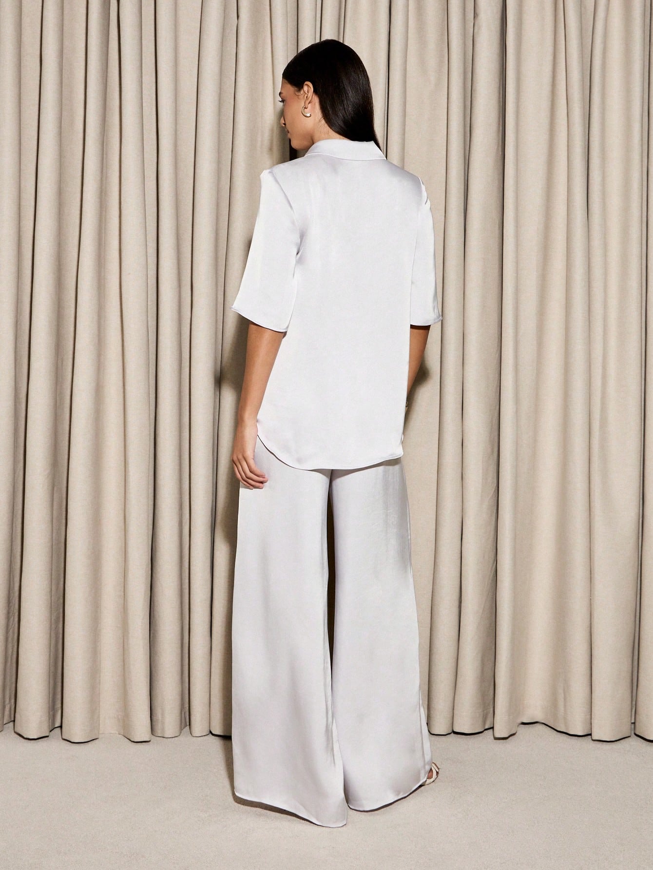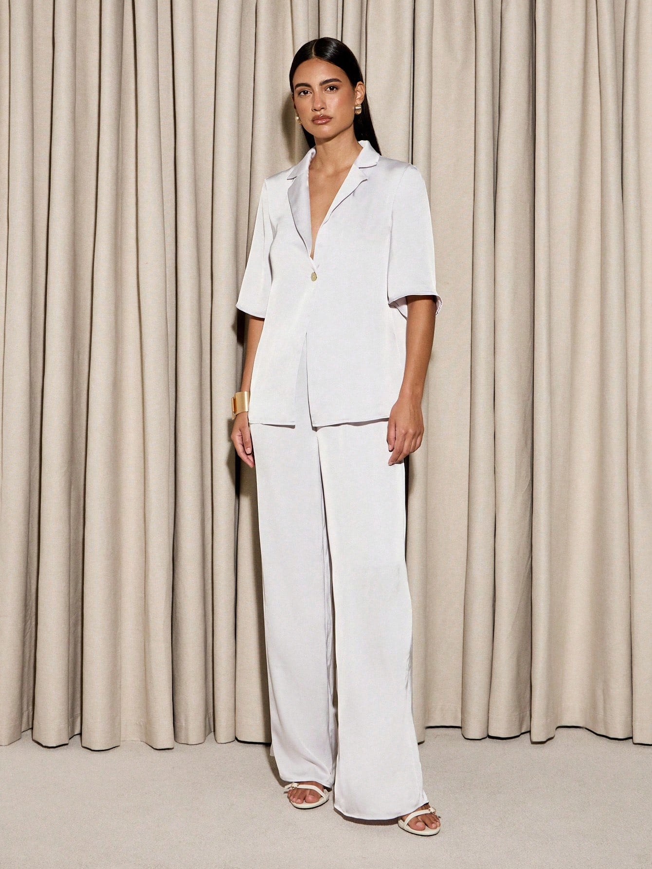 AiiRZ Luxurious Satin Coordinated Set Wide Leg Palazzo Business Professional Statement Button Blazer