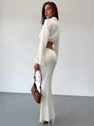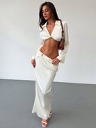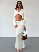 Aloruh 2pcs/Set Women White Cady Crop Top With Metal Trim & Extra Long Flared Skirt With Metal Decor