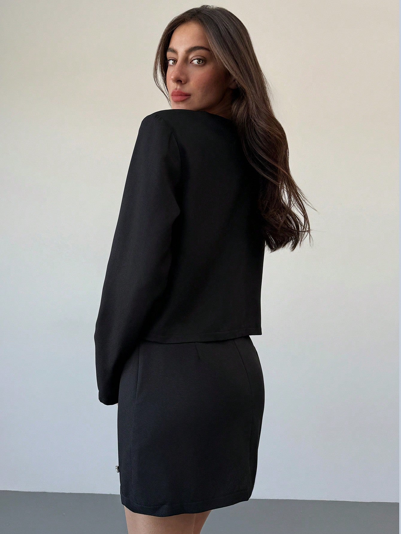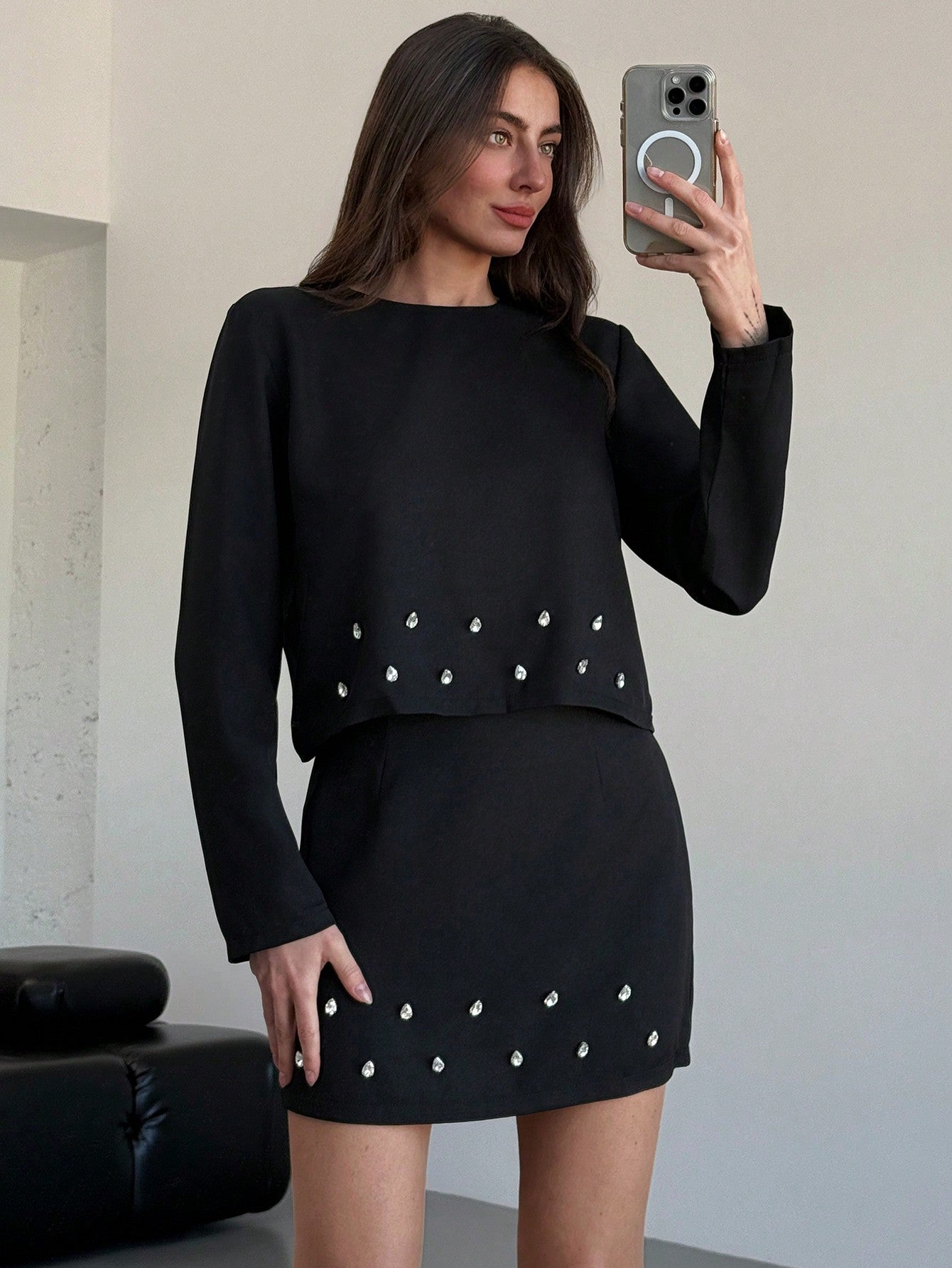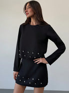 Aloruh 2pcs Women Elegant Set: Rhinestone Decor Round Neck Long Sleeve Top And Mini Skirt