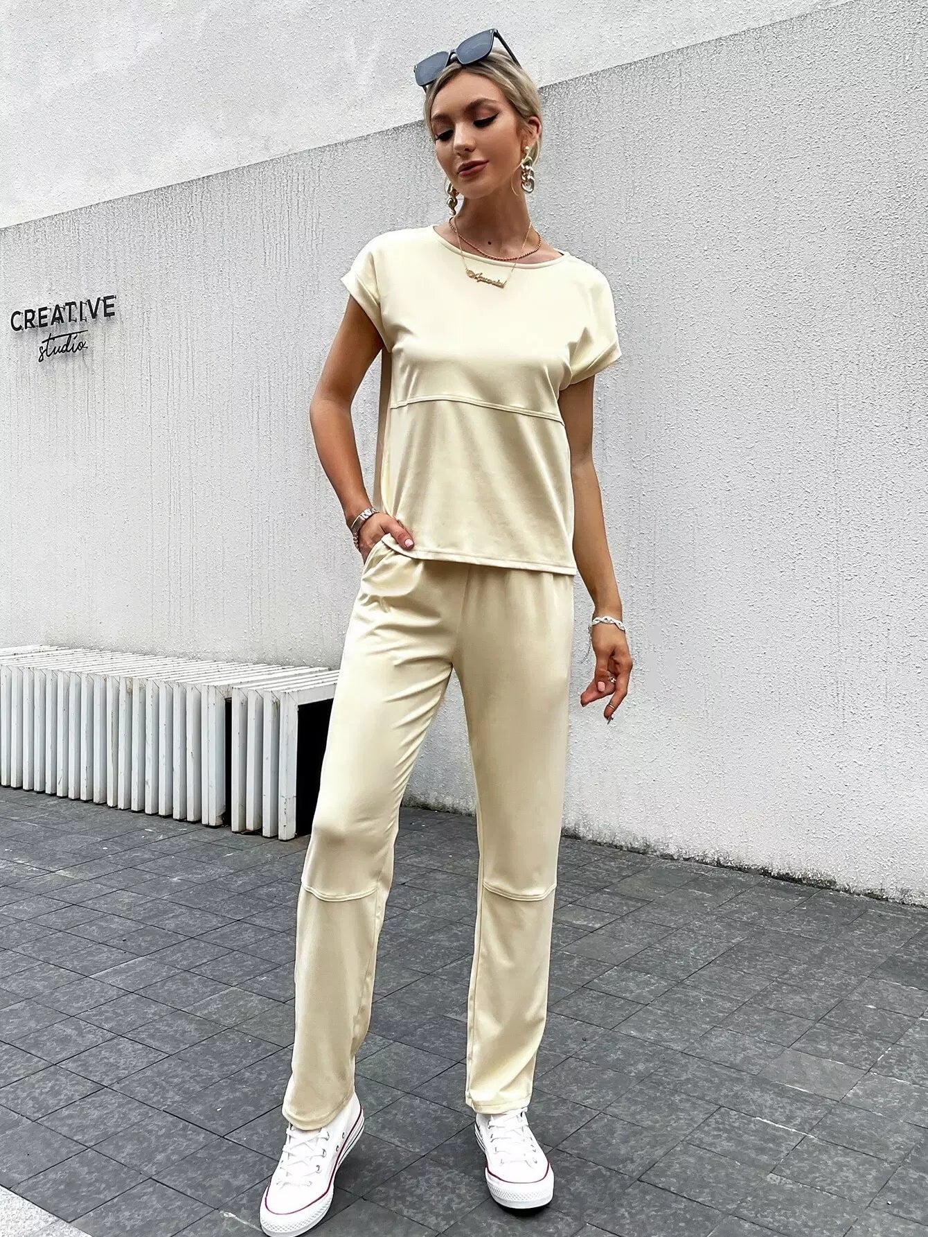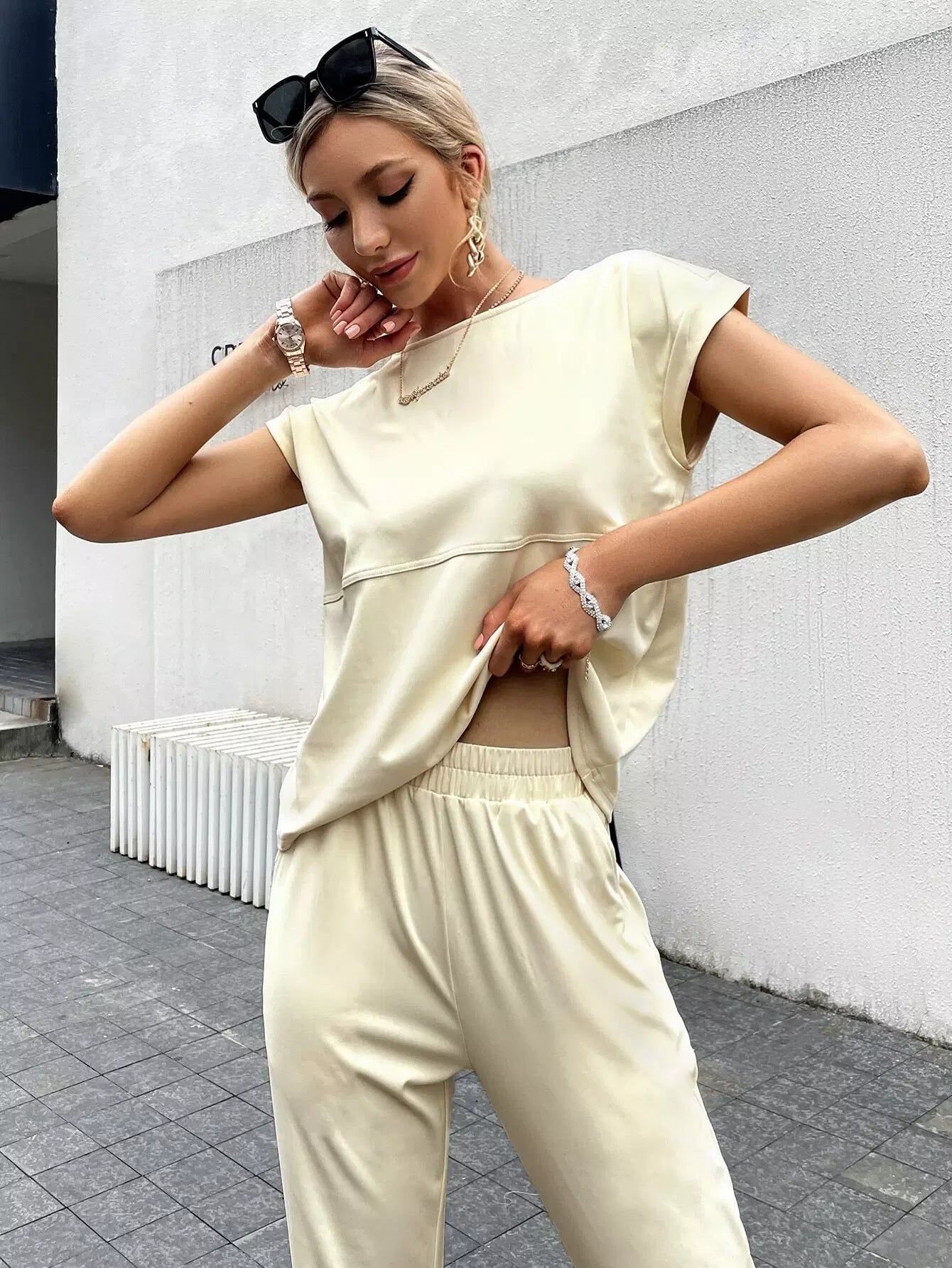 Batwing Sleeve Solid Top & Pants Set