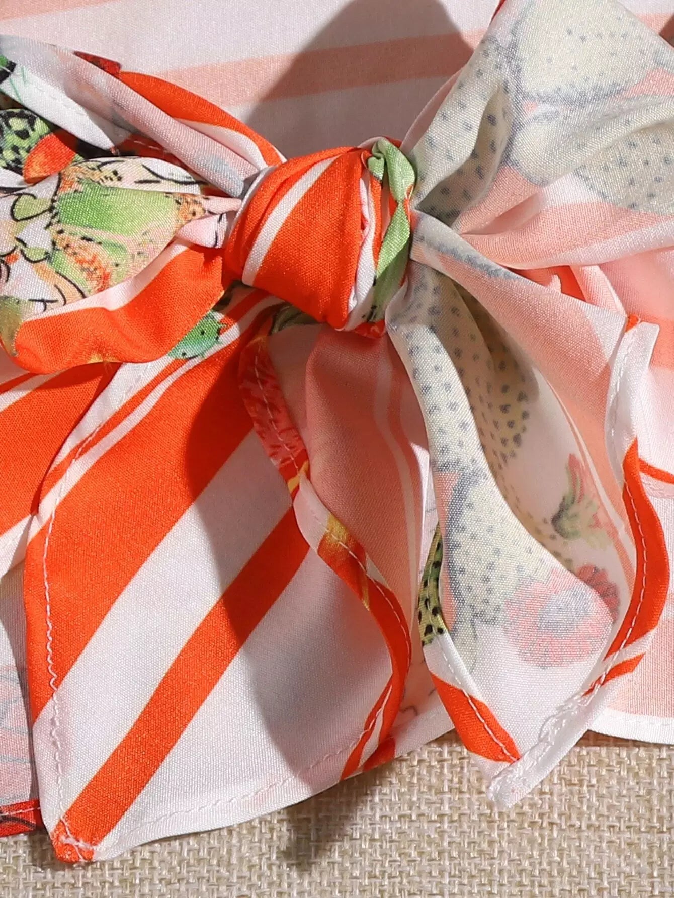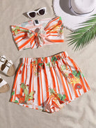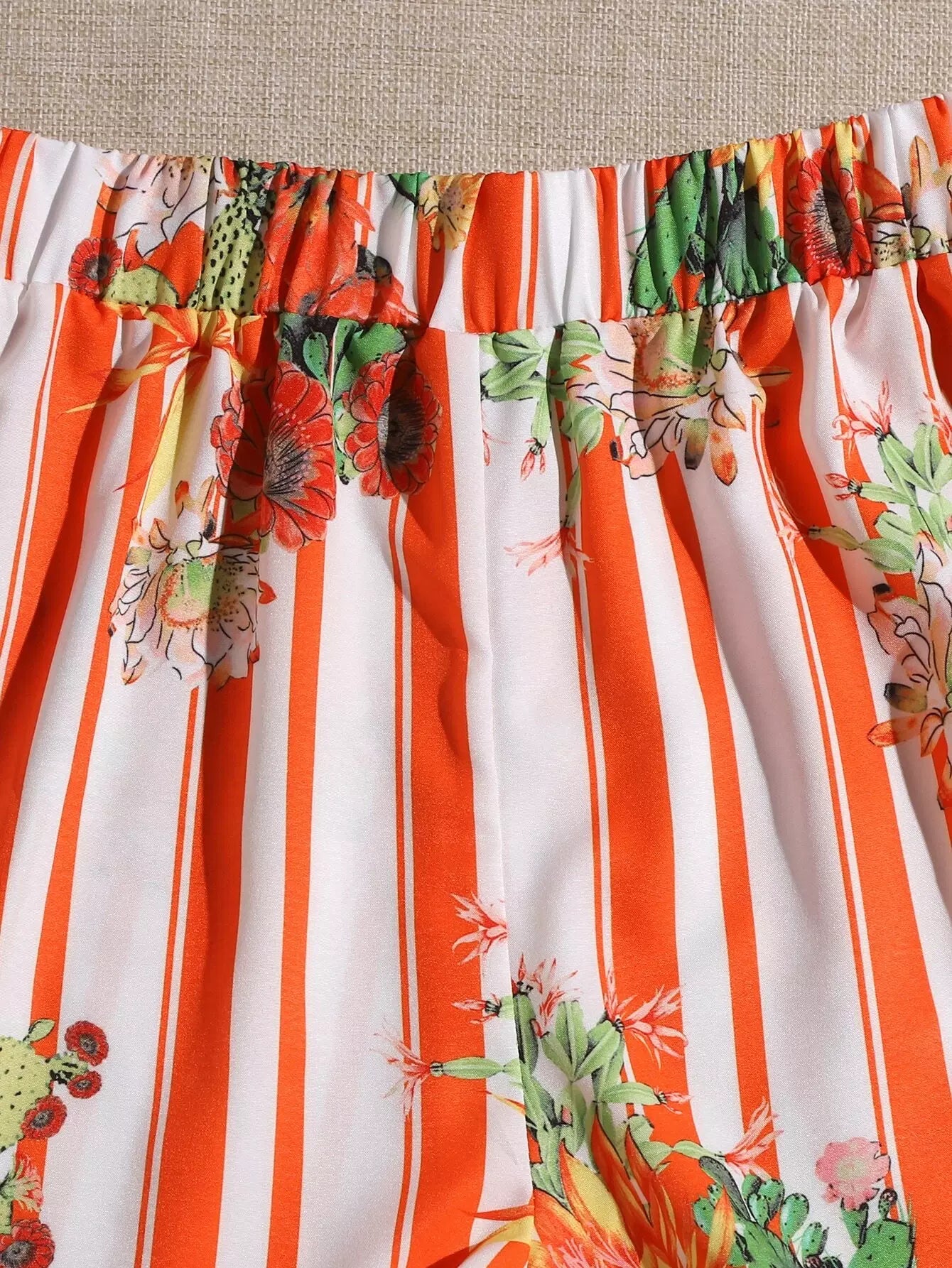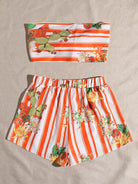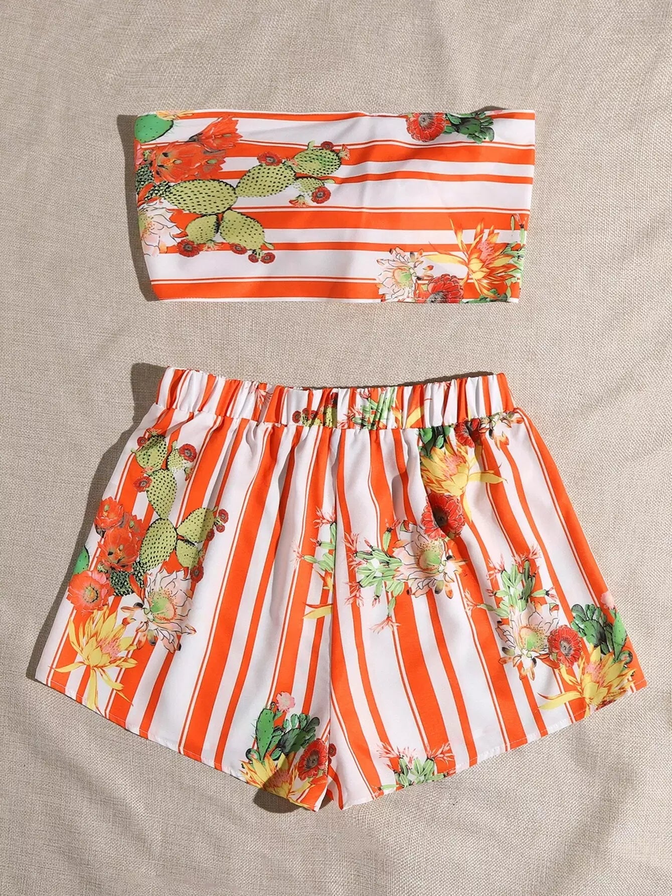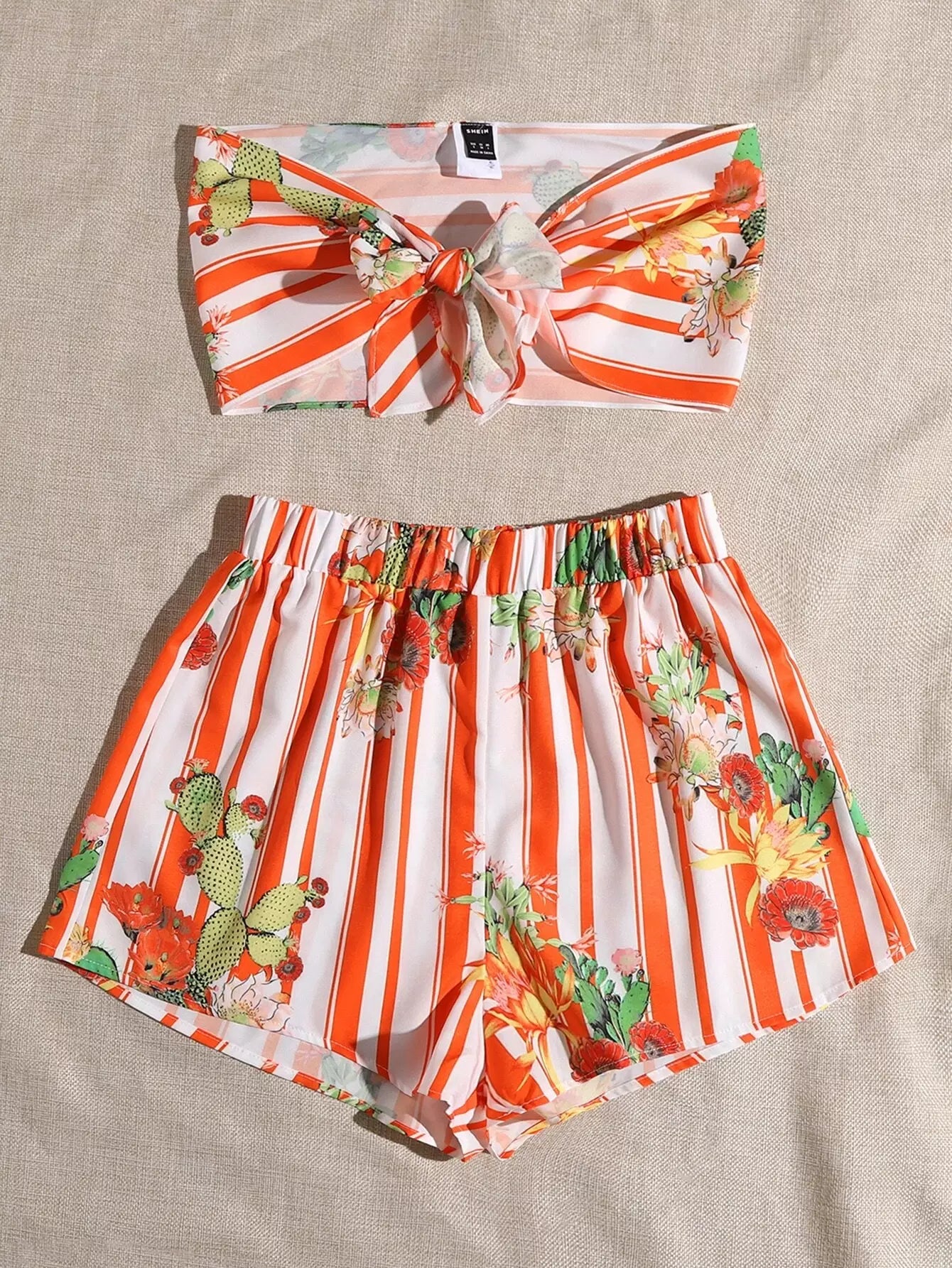 Botanical Print Striped Tie Front Crop Tube Top & Shorts Set