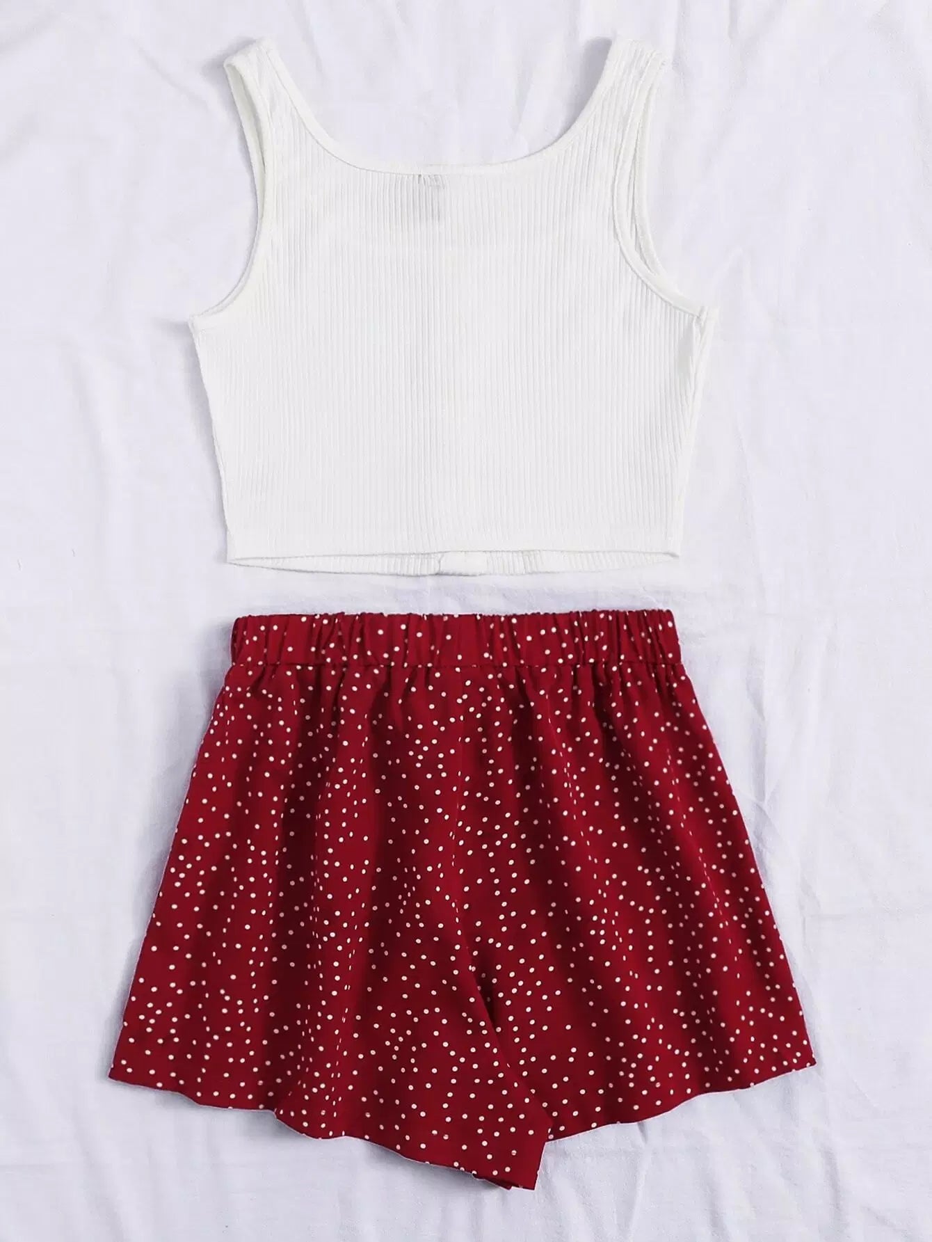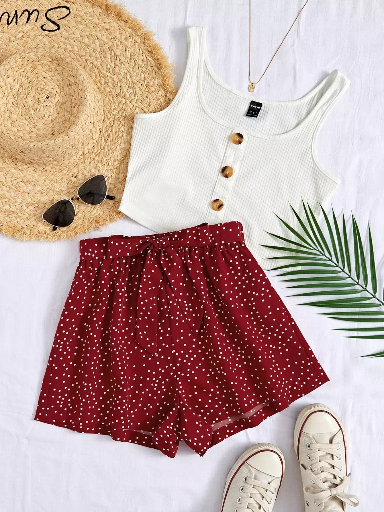 Button Front Tank Top & Polka Dot Print Shorts Set Without Belt
