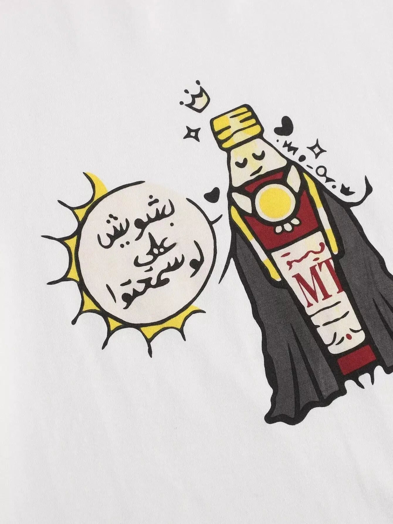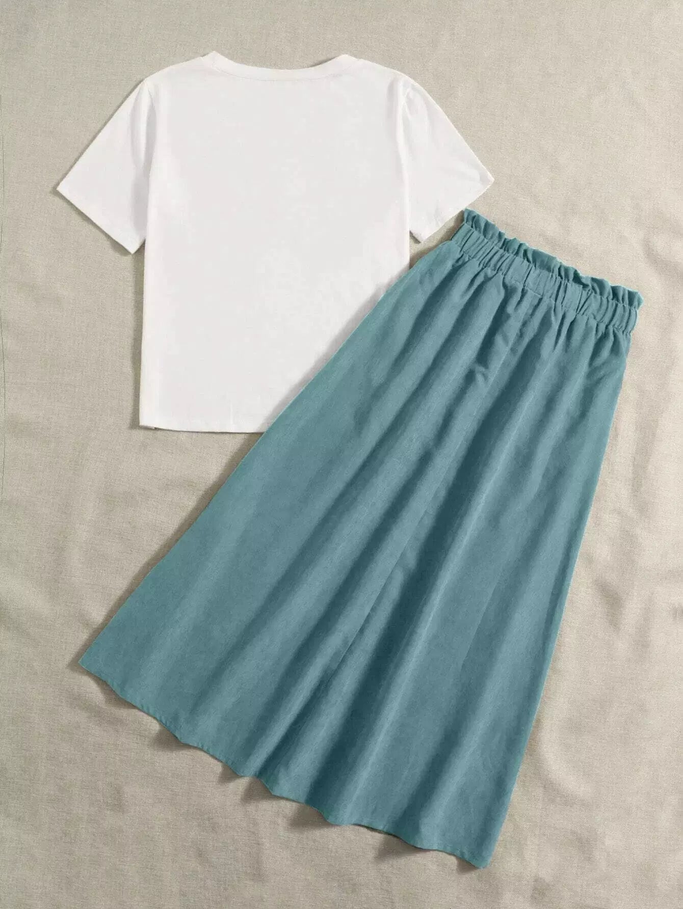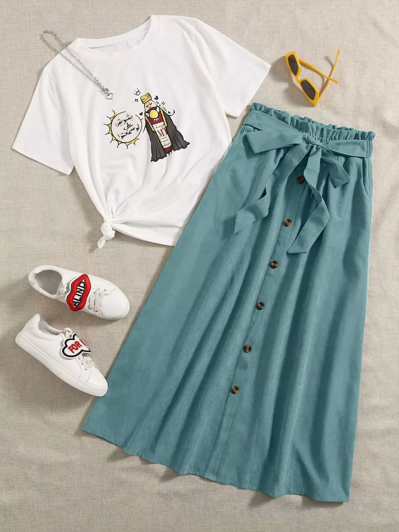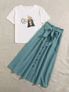 Cartoon & Letter Graphic Tee With Tie Front Skirt