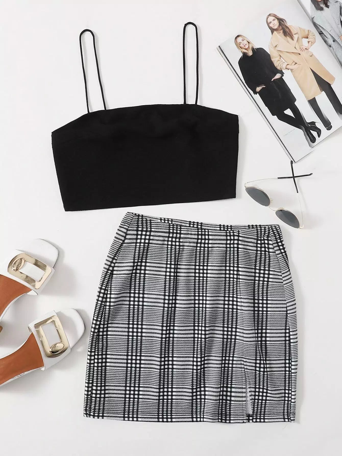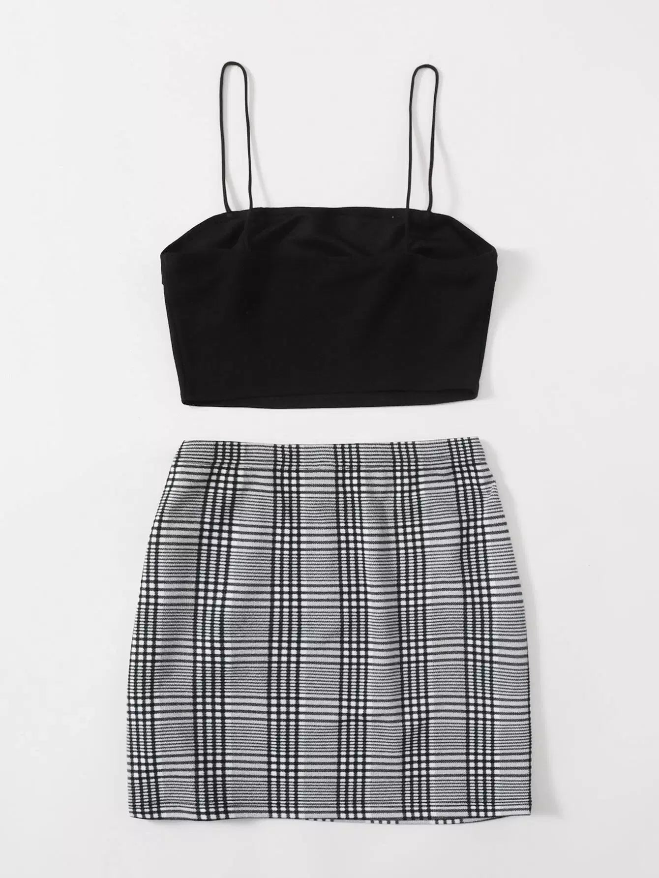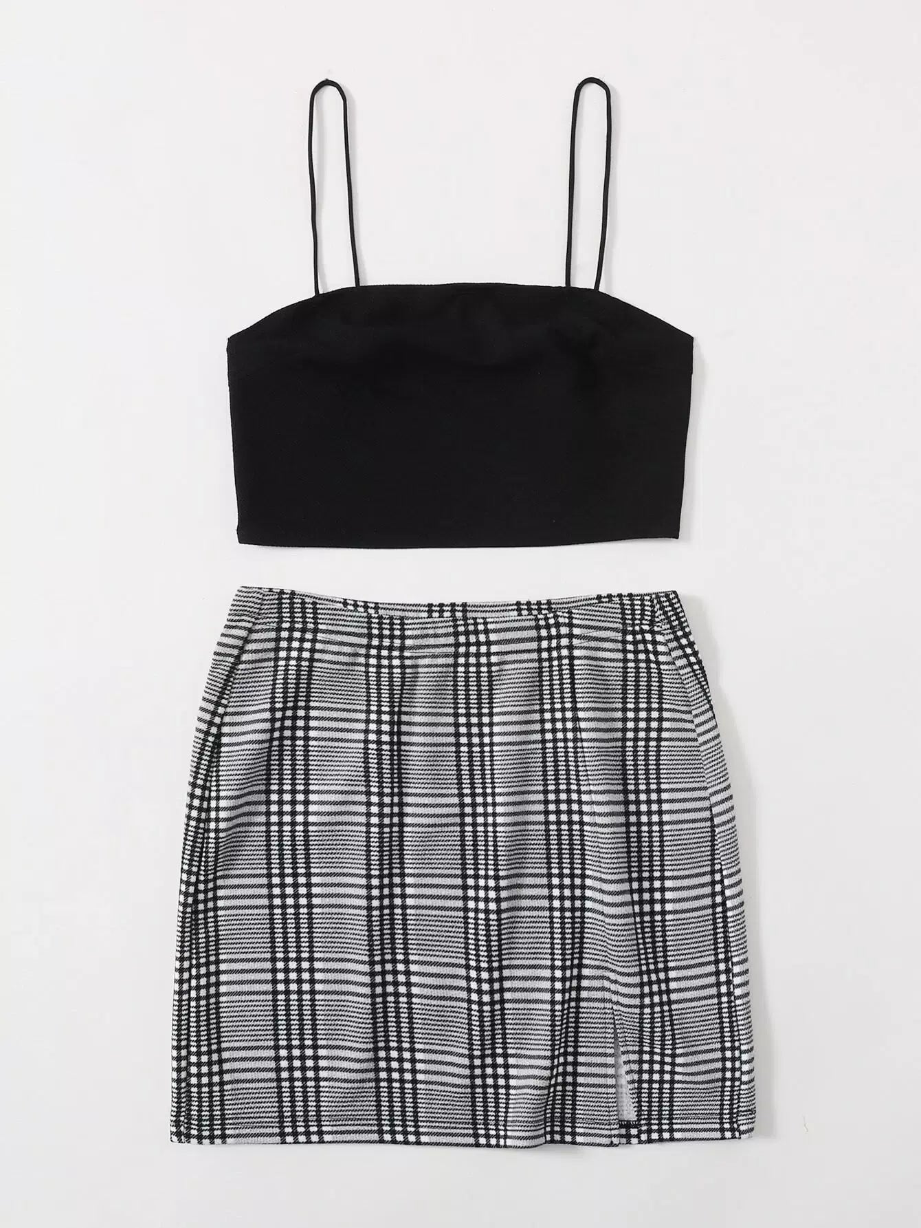 Crop Cami Top & Slit Hem Plaid Skirt Set