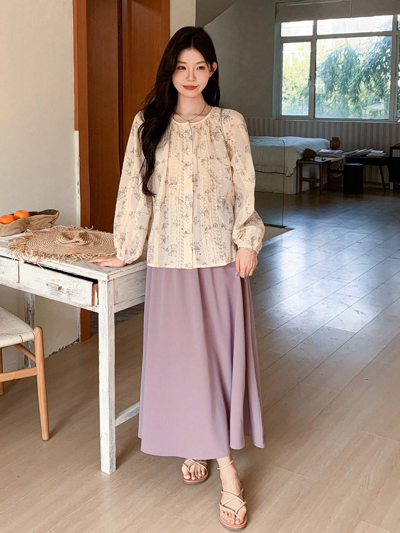 women DAZY 2pcs/Set Women Floral Print Single-Breasted Lantern Sleeve Blouse And Mini Skirt