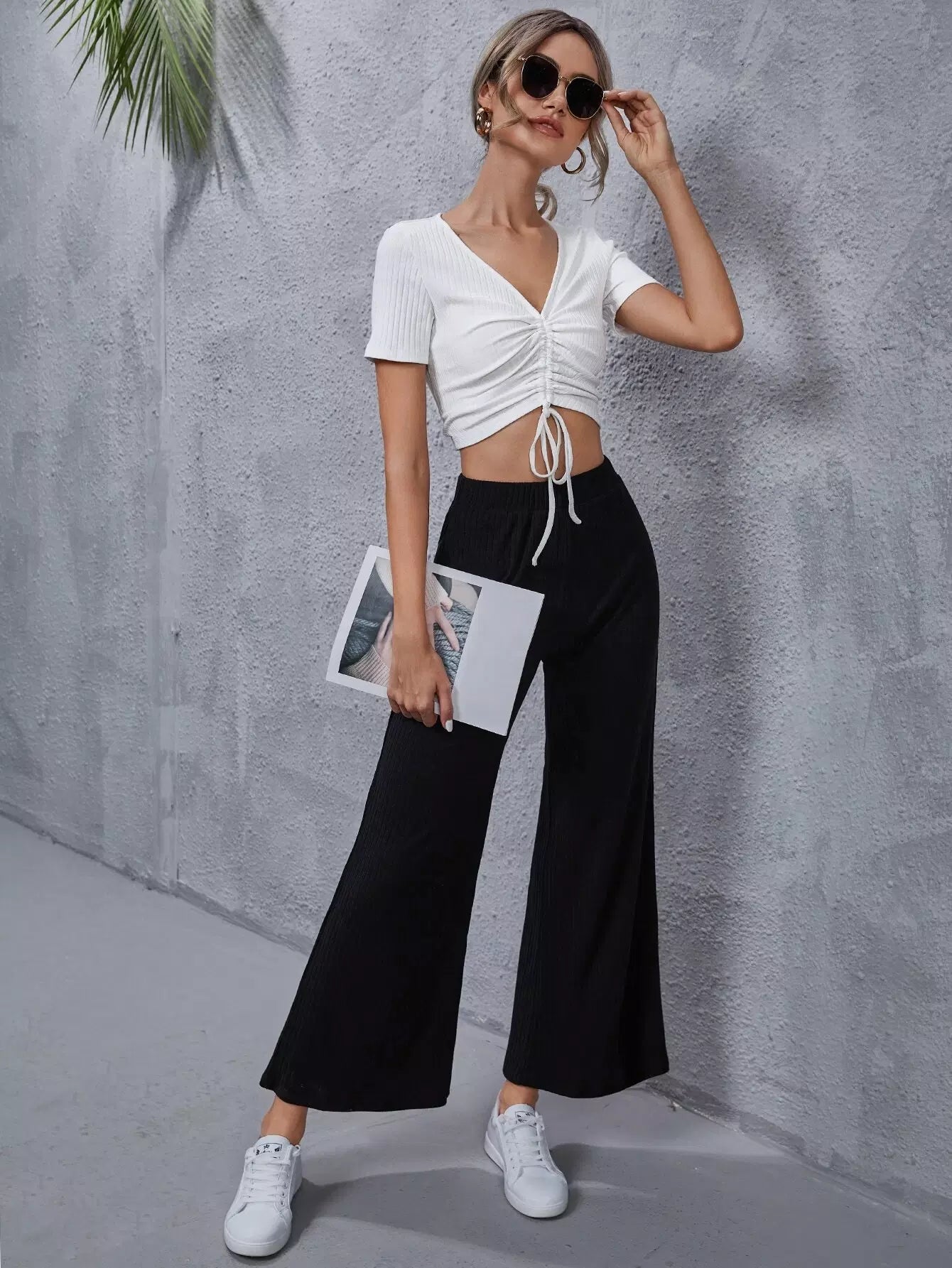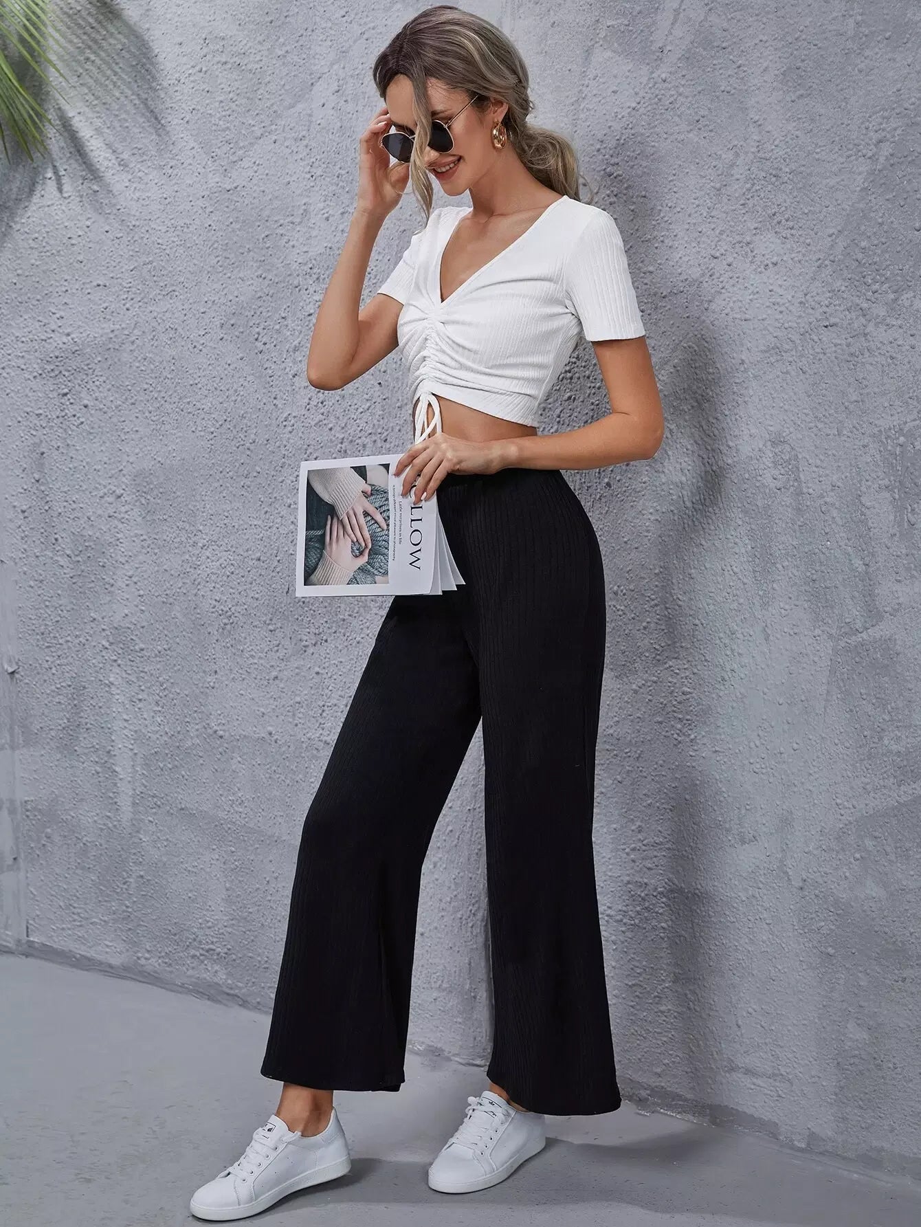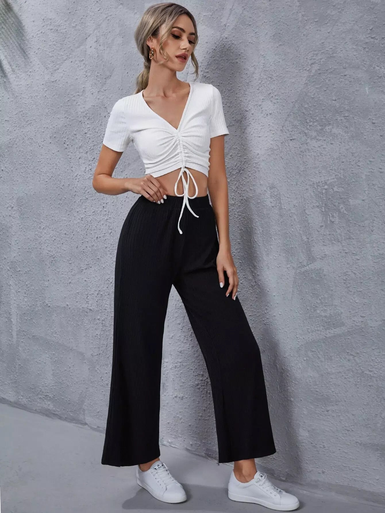 Drawstring Ribbed Knit Crop Top & High Waist Wide Leg Pants