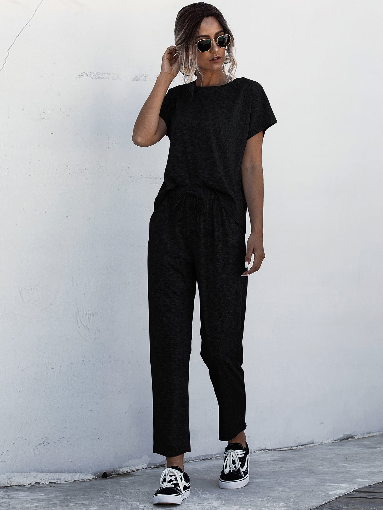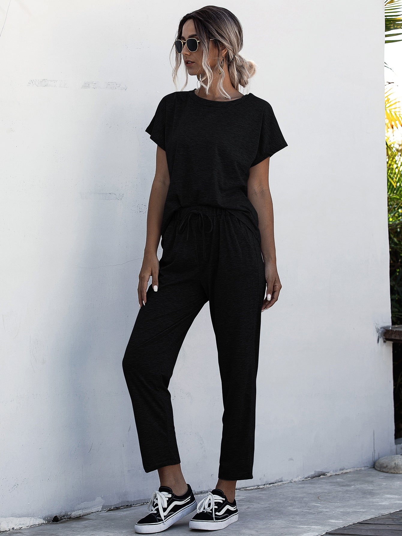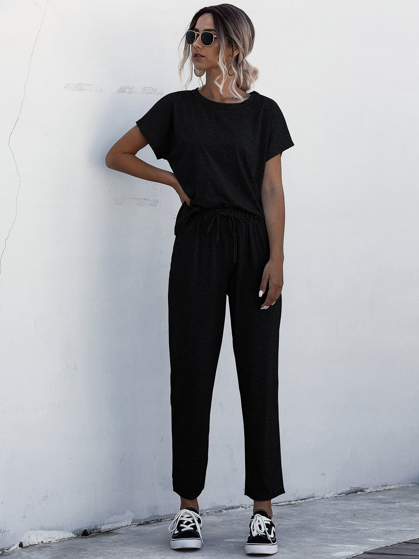 Solid Batwing Sleeve Tee & Drawstring Sweatpants
