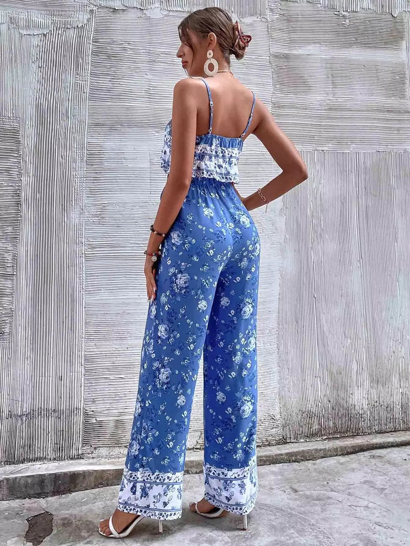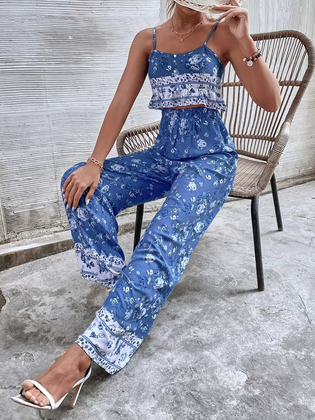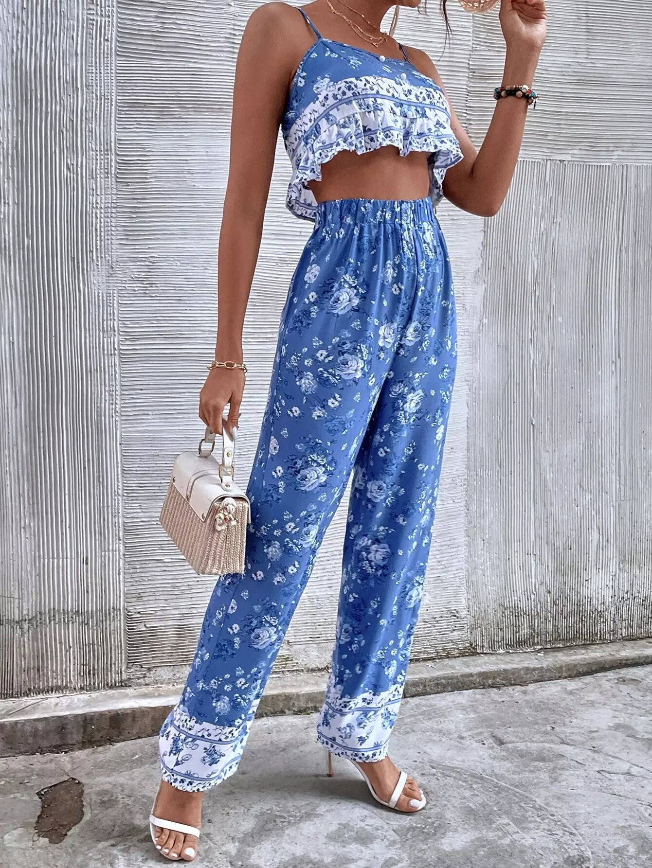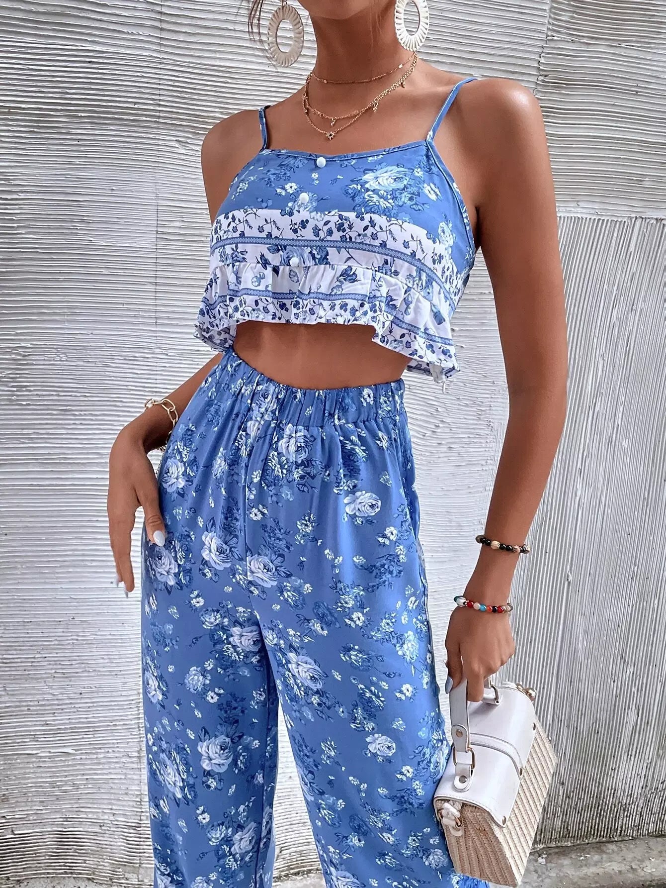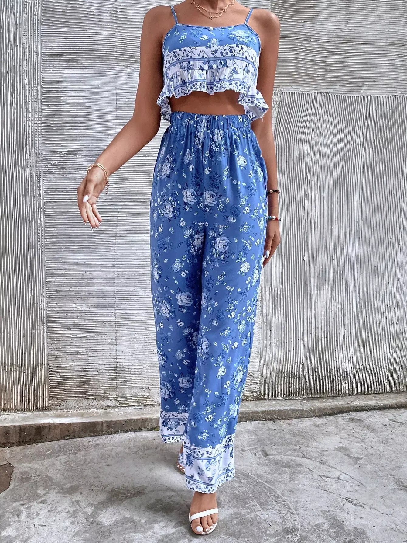 Floral Print Ruffle Hem Crop Cami Top & Pants