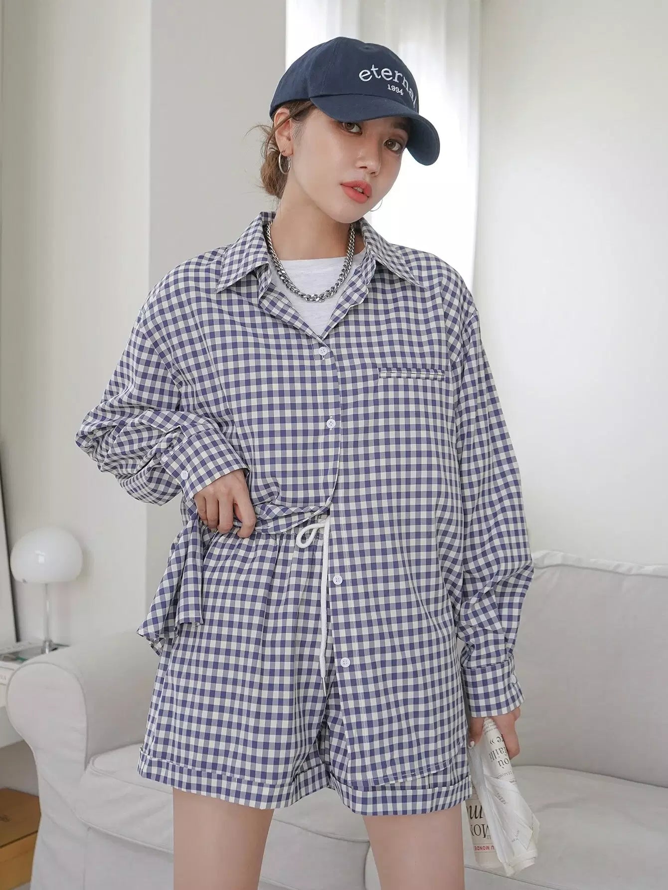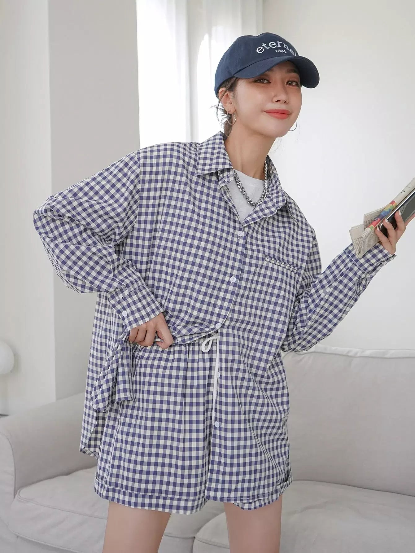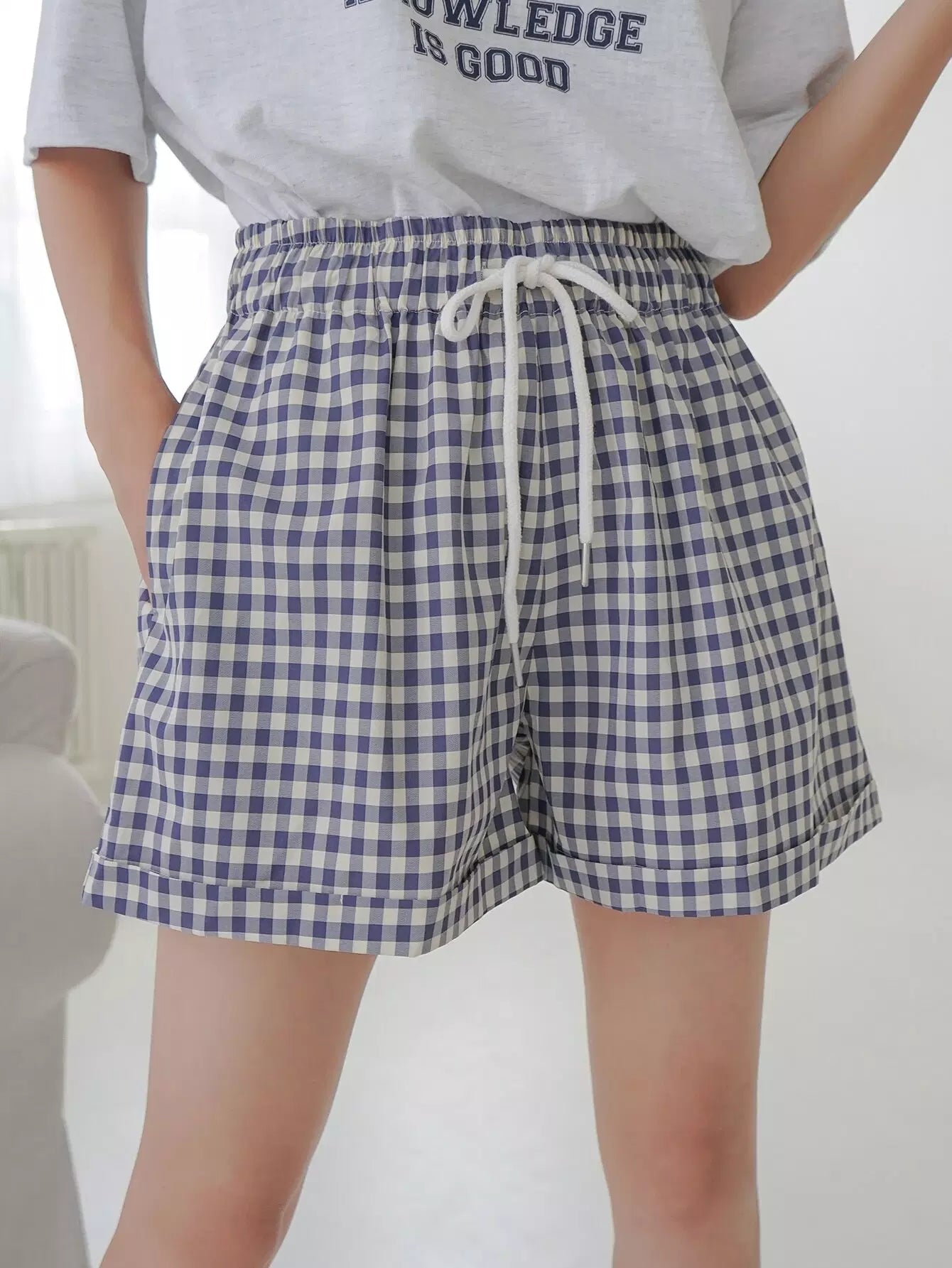 Gingham Drop Shoulder Blouse & Roll Hem Drawstring Waist Shorts