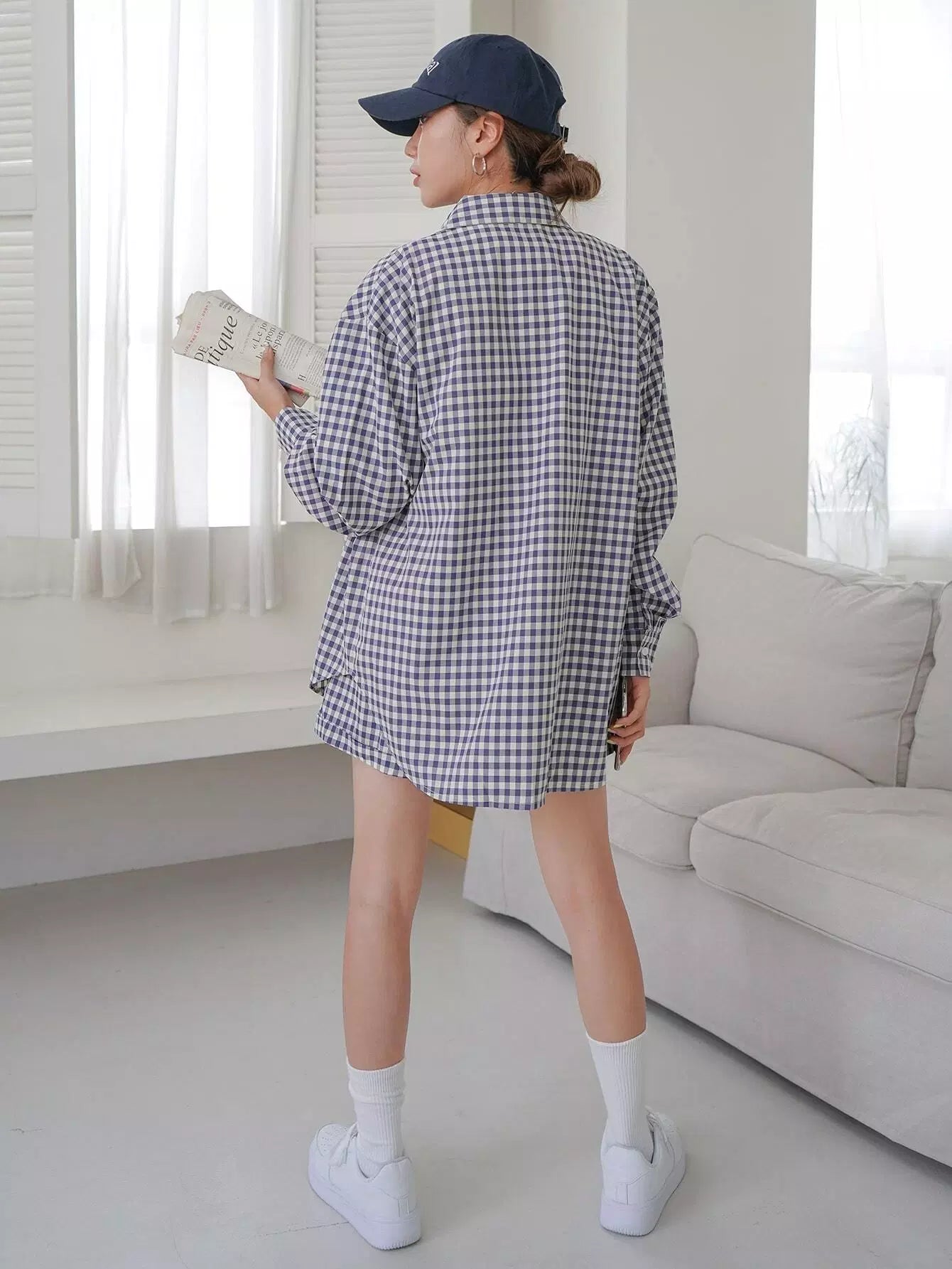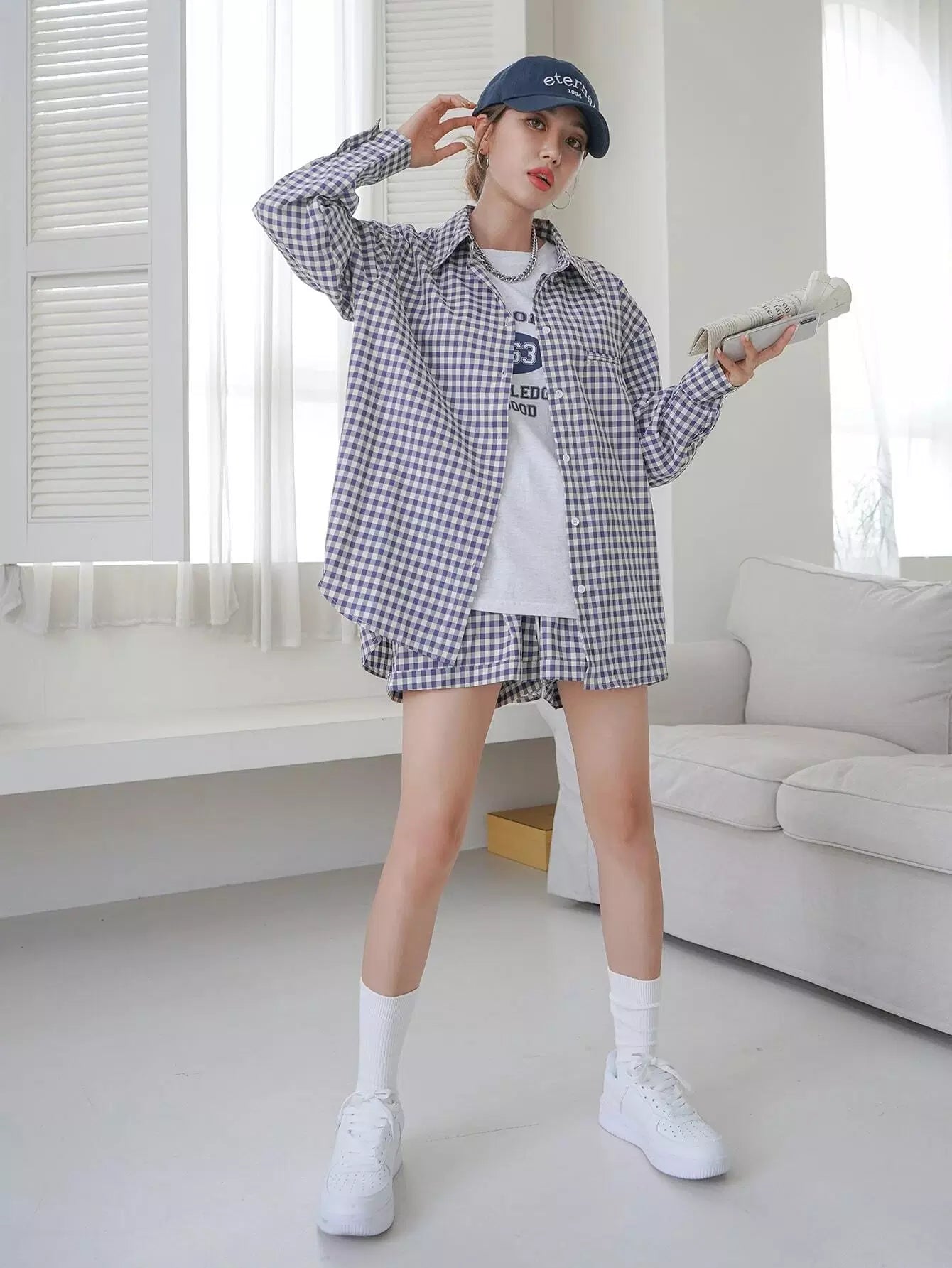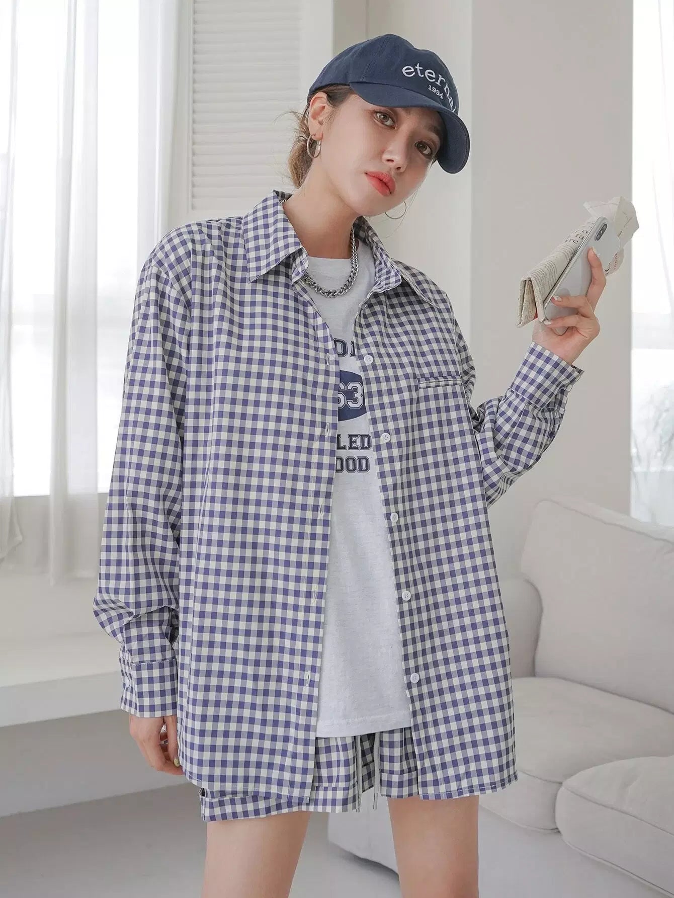 Gingham Drop Shoulder Blouse & Roll Hem Drawstring Waist Shorts