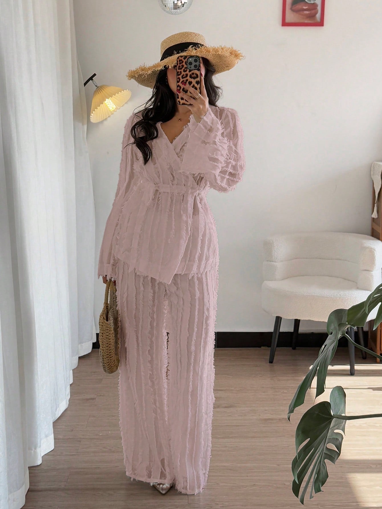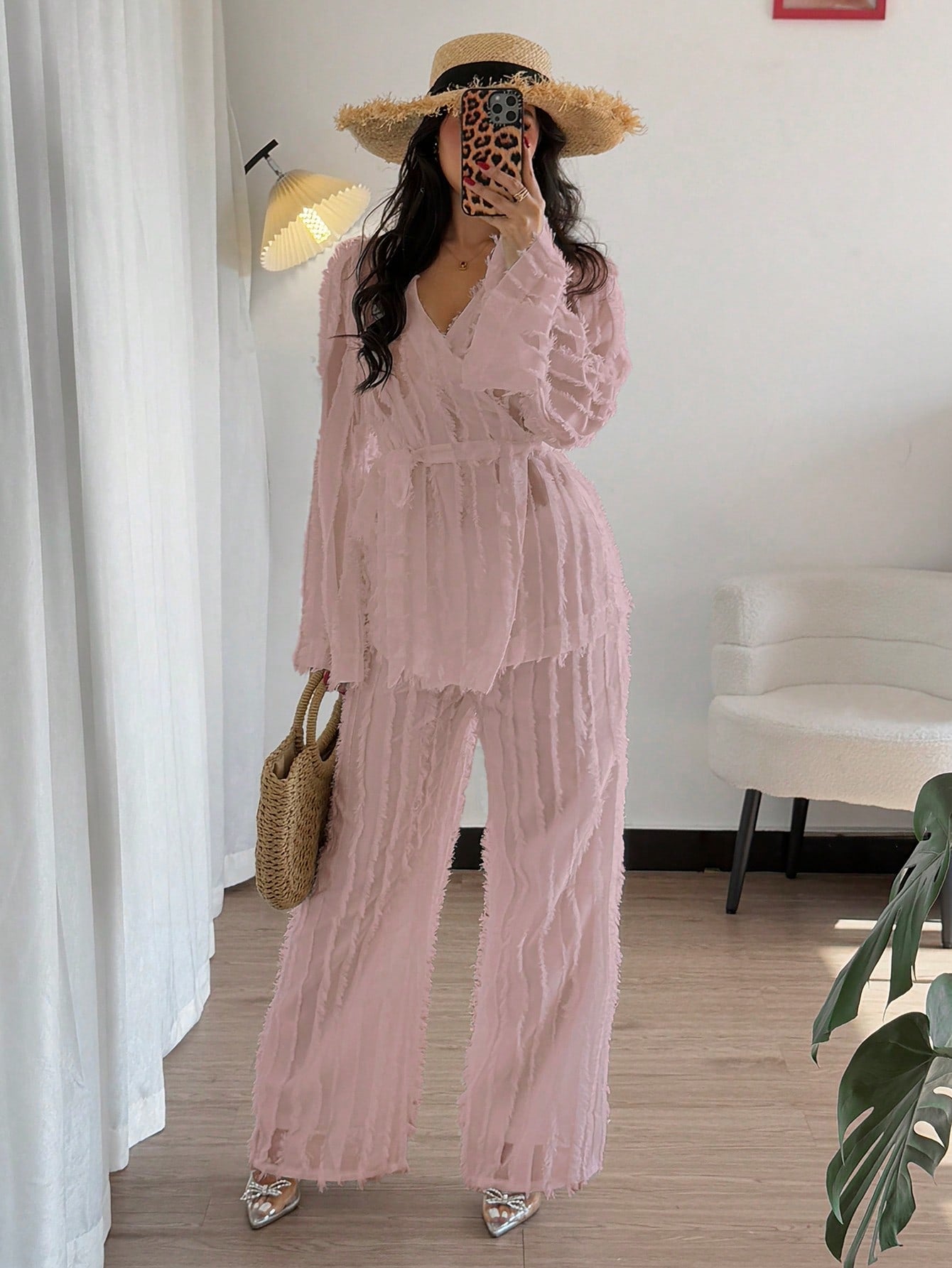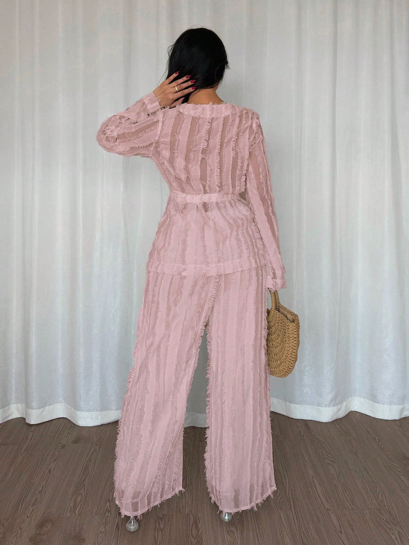 Islaluna Elegant Sexy Romantic Feather Decor Thin Long Sleeve & Long Pants 2pcs Set Fall Cloth For Women
