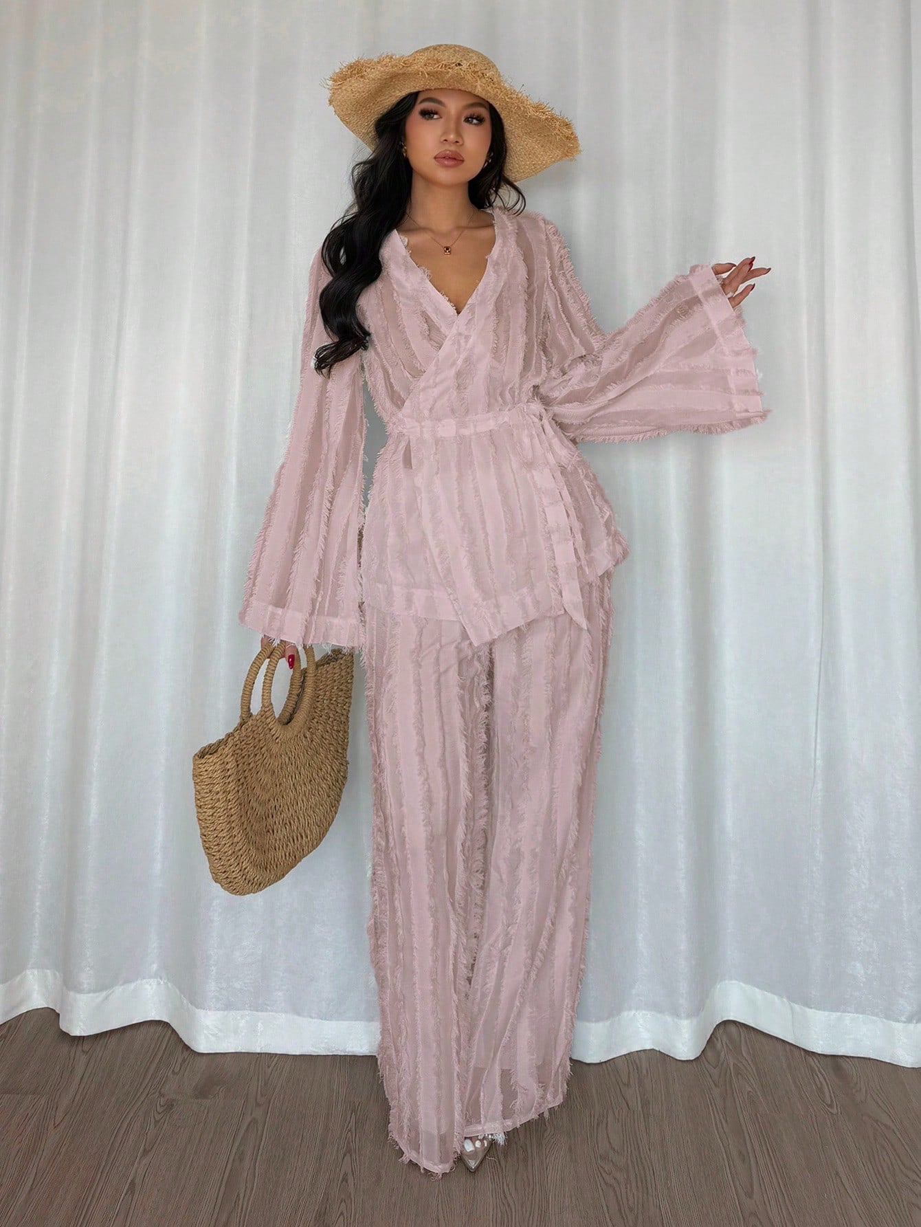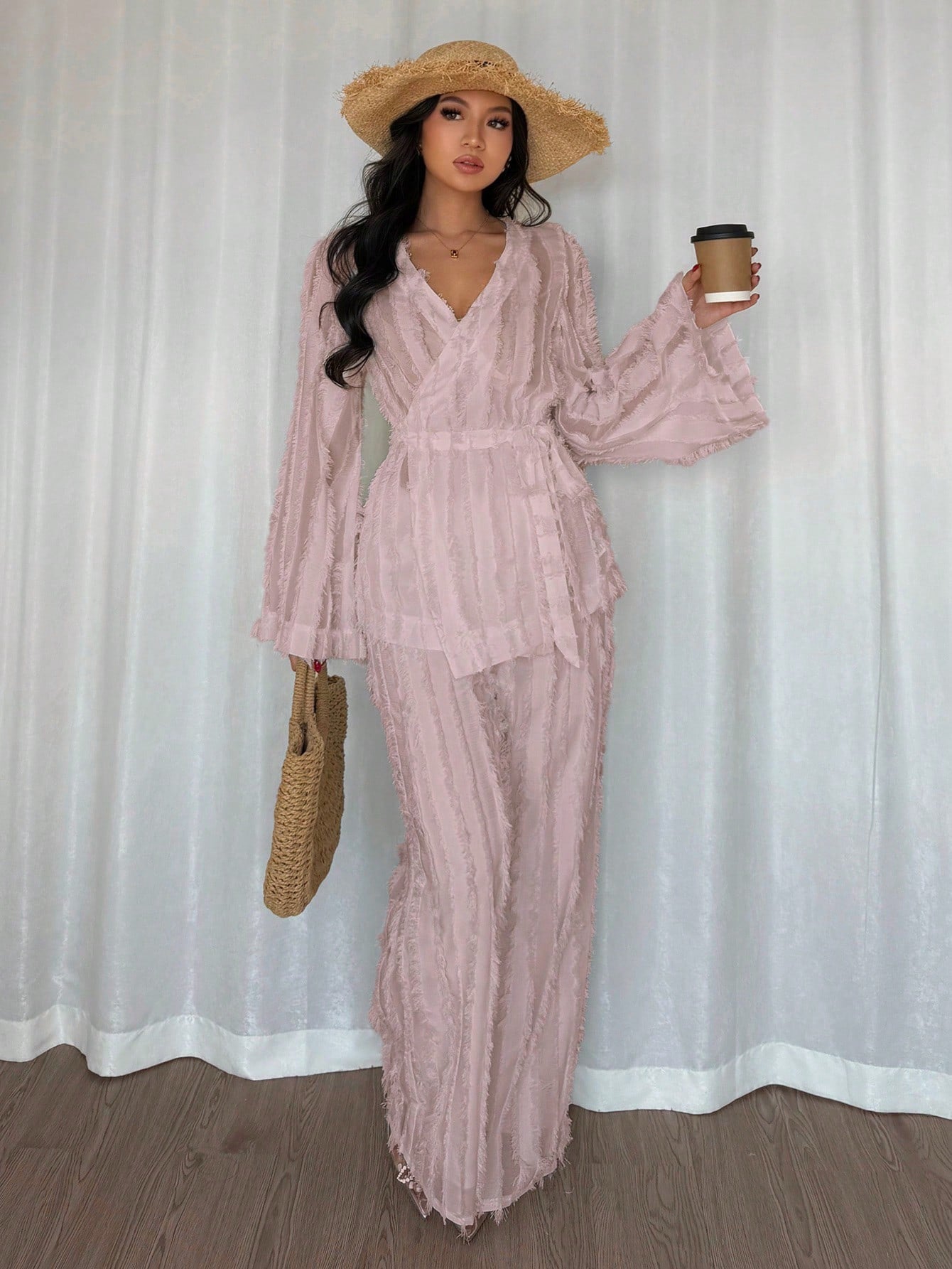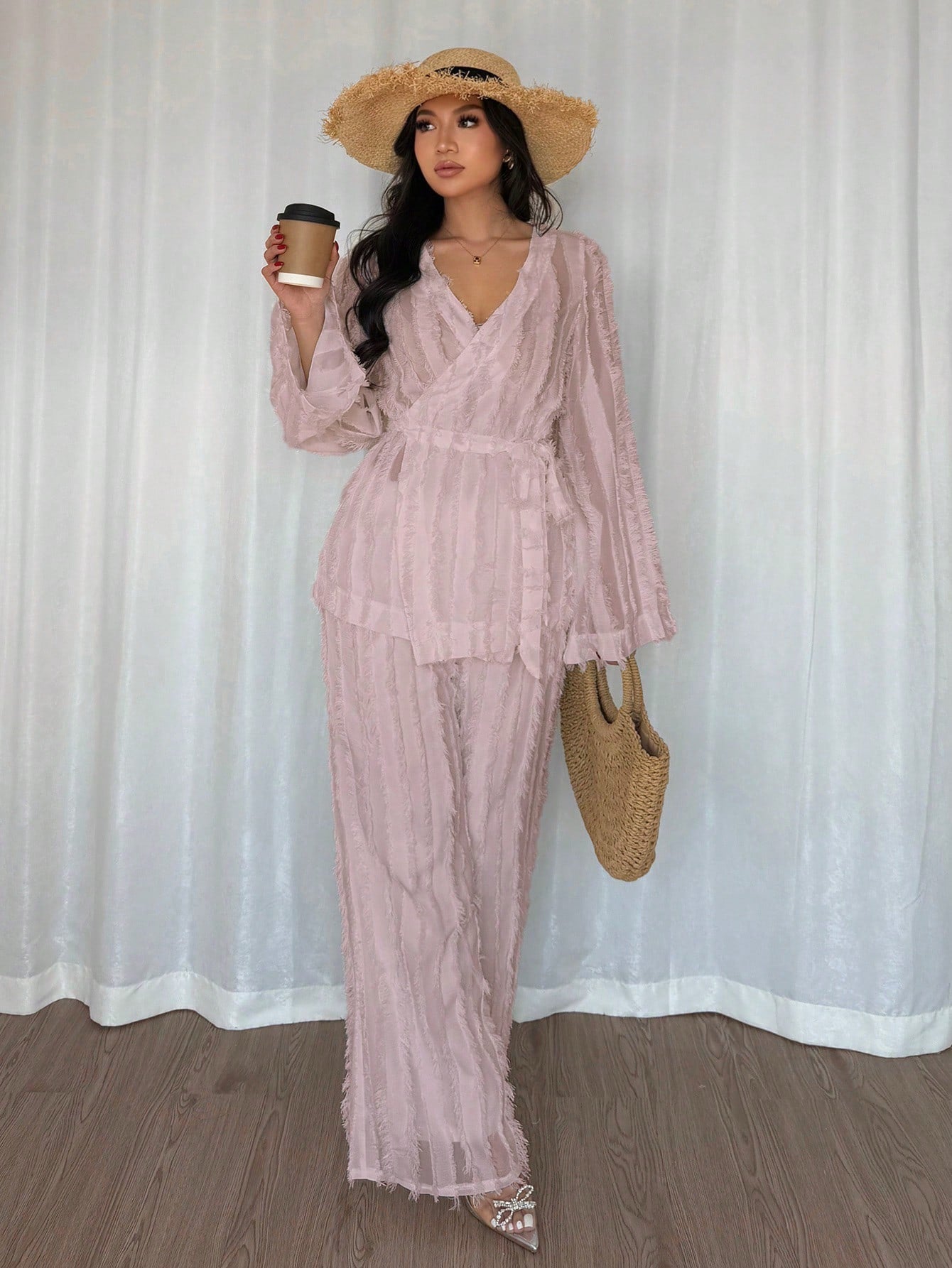 Islaluna Elegant Sexy Romantic Feather Decor Thin Long Sleeve & Long Pants 2pcs Set Fall Cloth For Women