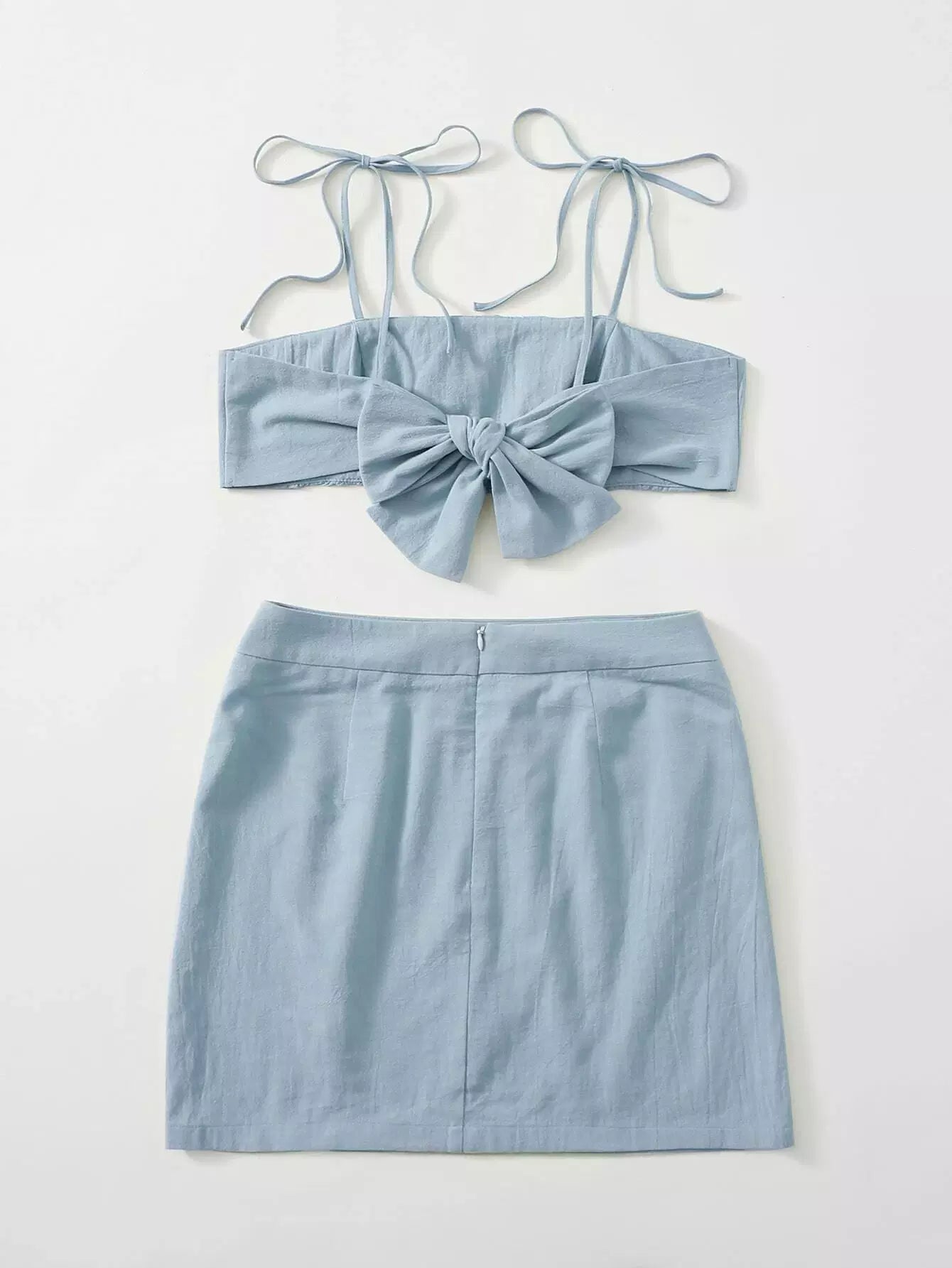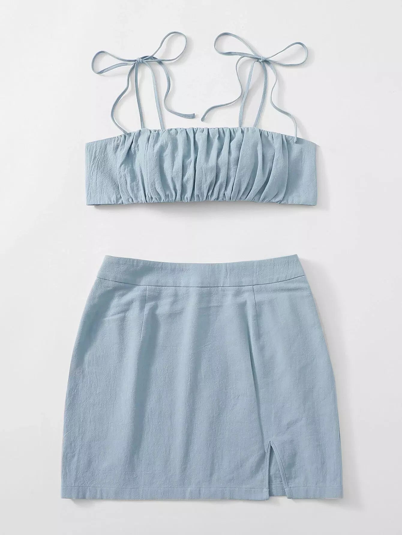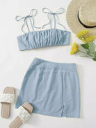 Knot Shoulder Tie Back Ruched Bust Crop Cami Top & Split Hem Skirt Set