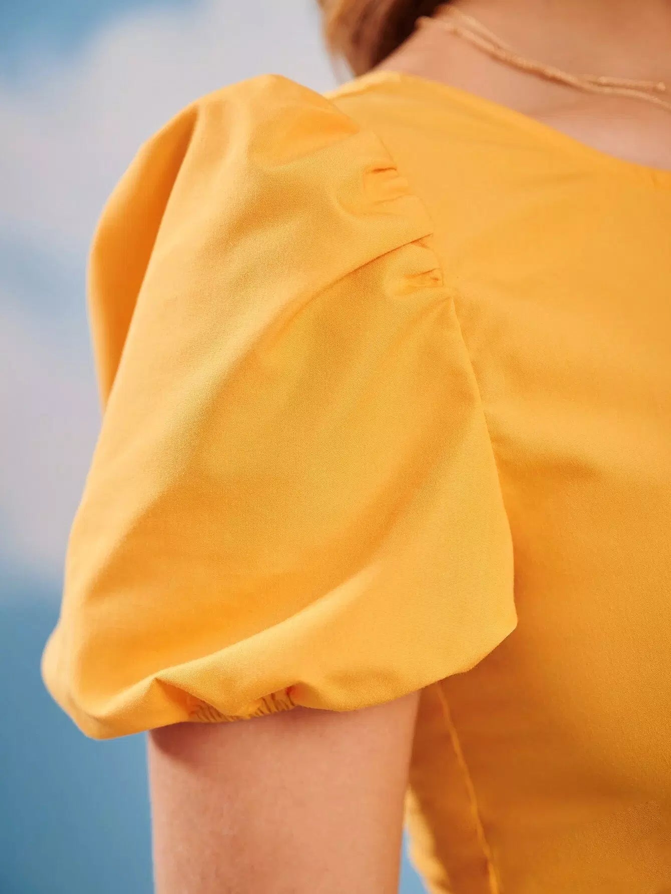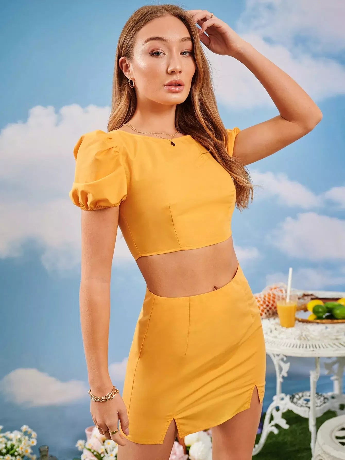 Lace Up Back Puff Sleeve Crop Top & M-slit Hem Skirt Set