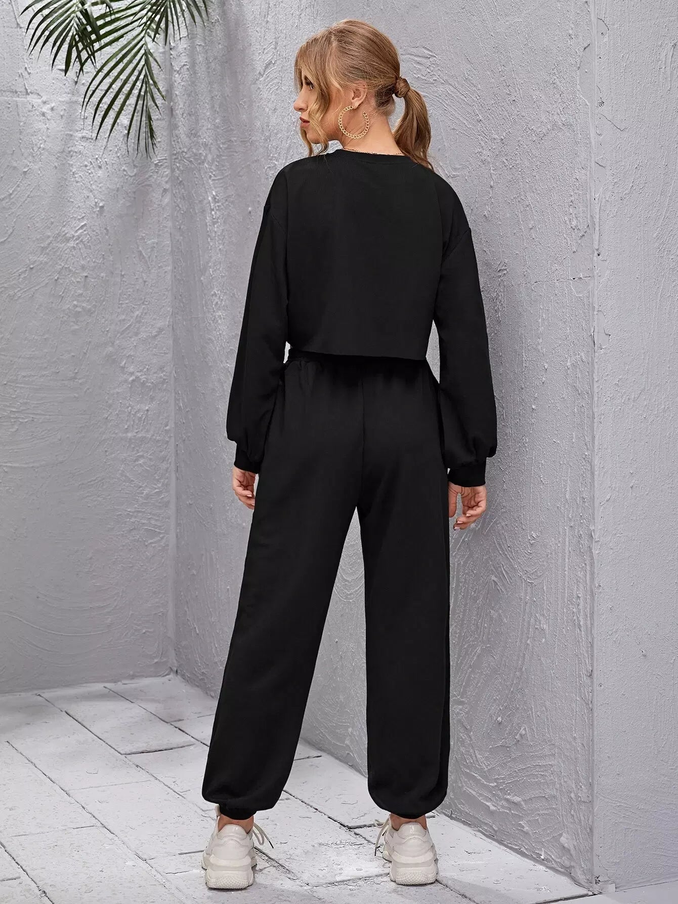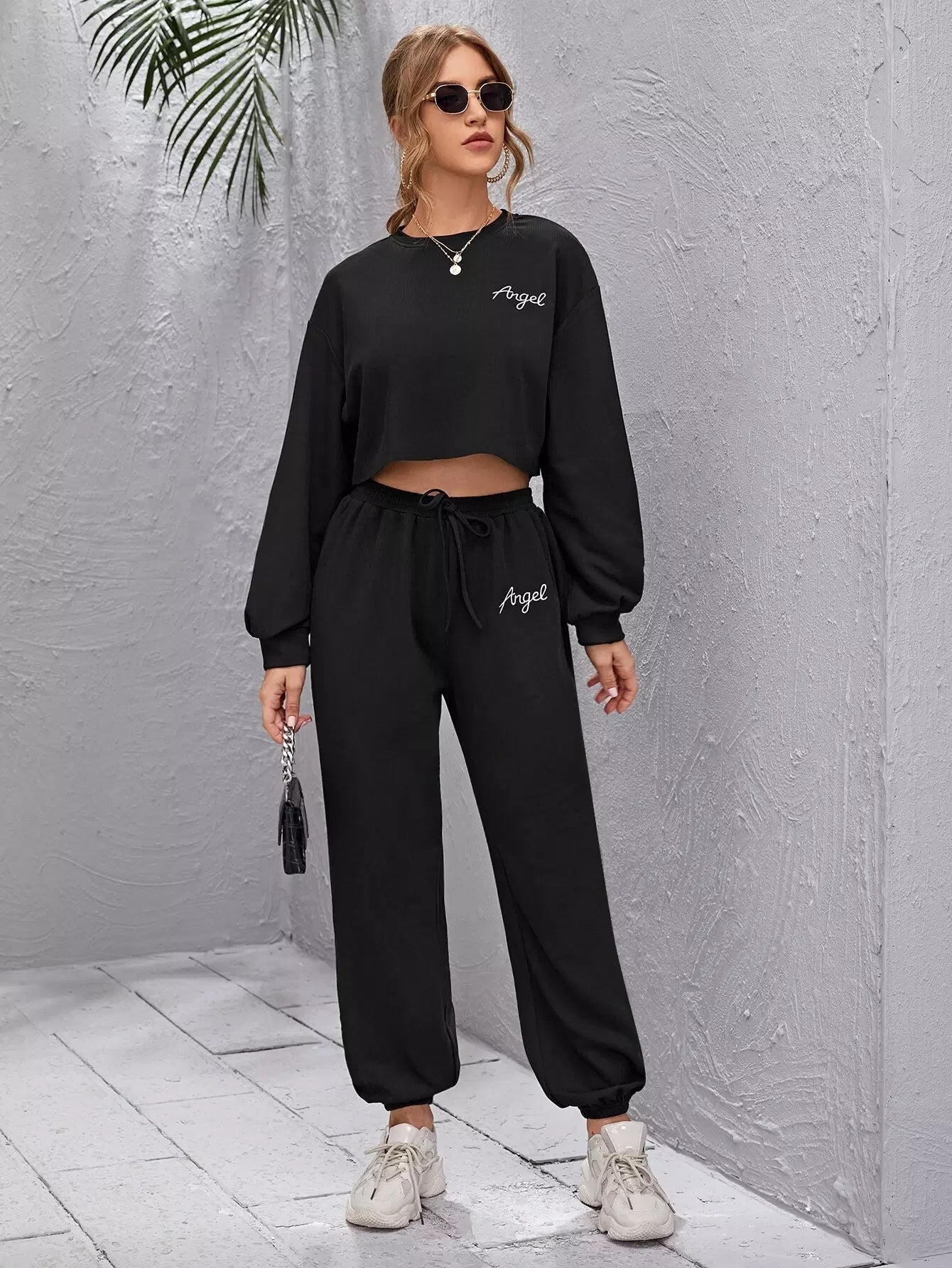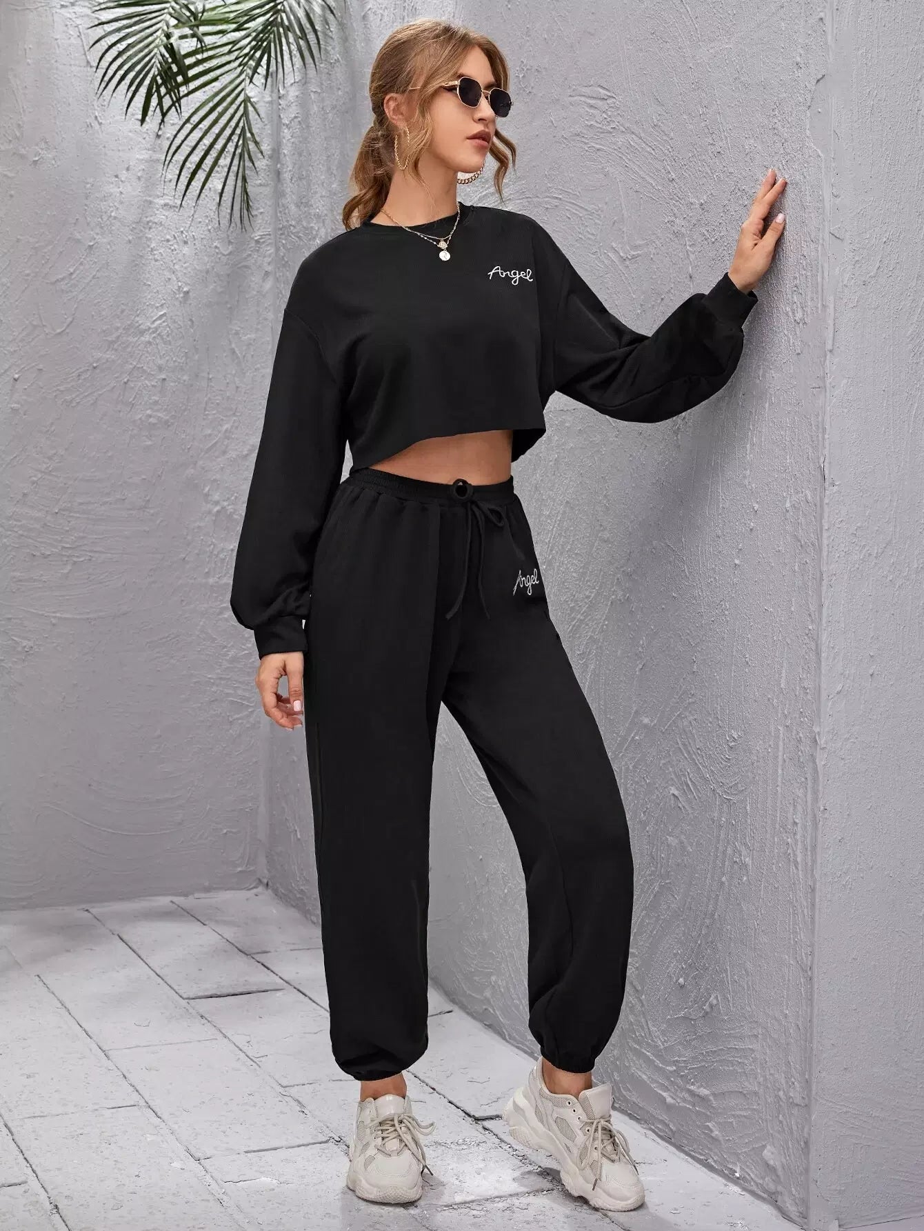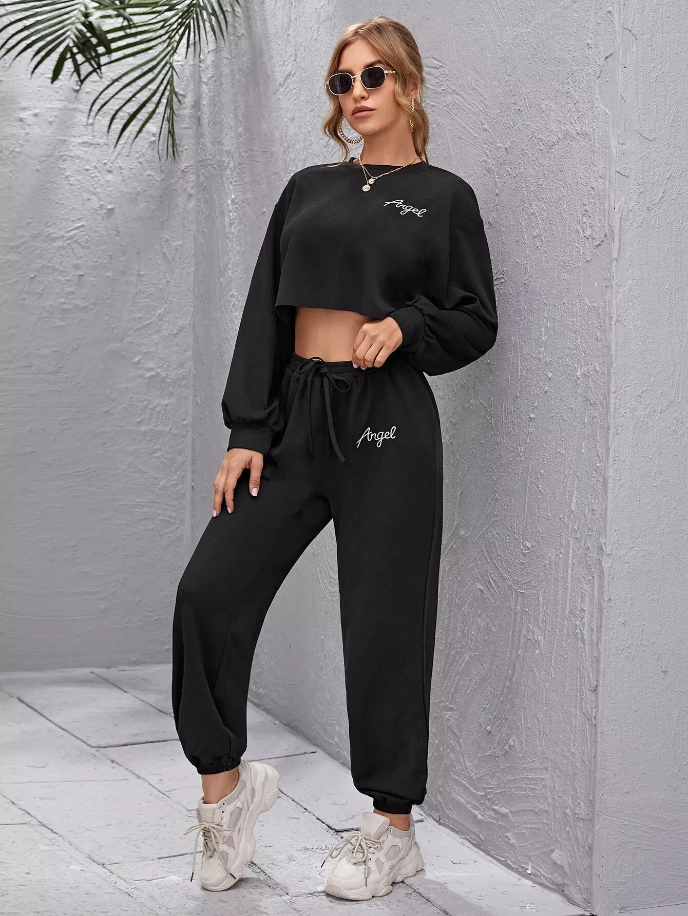 Letter Embroidered Drop Shoulder Crop Top and Joggers Set
