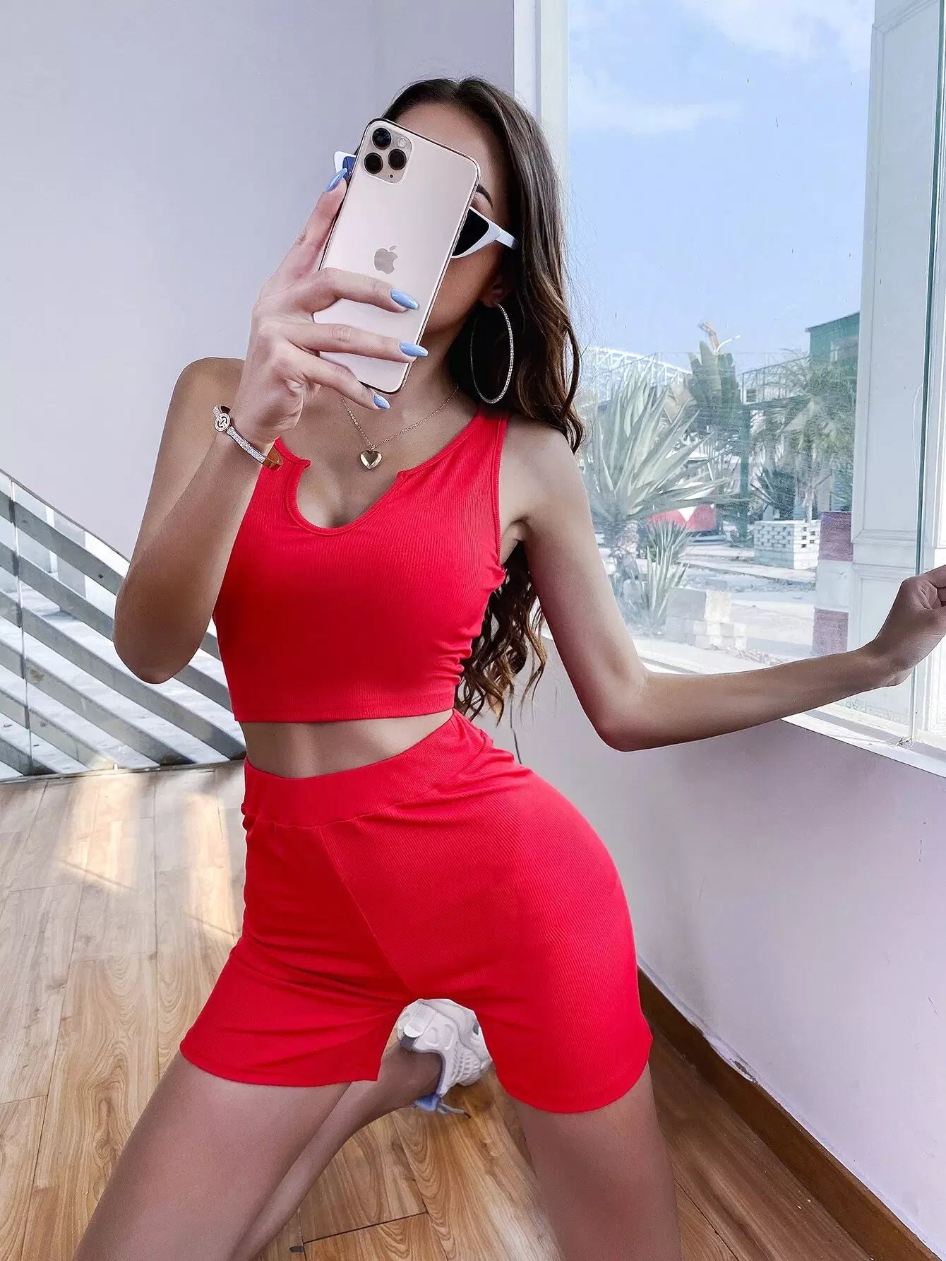 Women - Notch Neck Solid Crop Tank Top & Biker Shorts Set