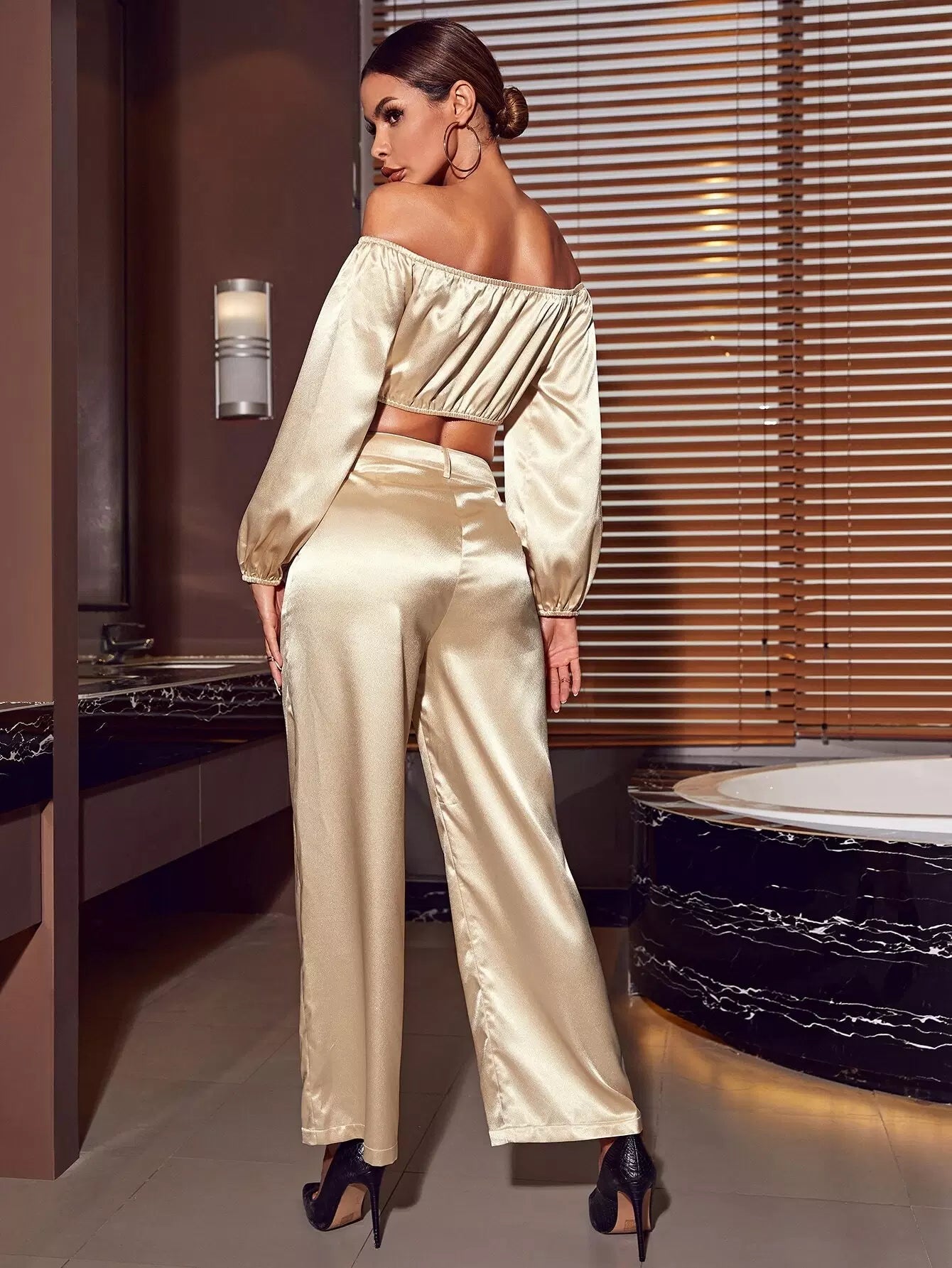 Off Shoulder Satin Crop Top & Wide Leg Pants Set