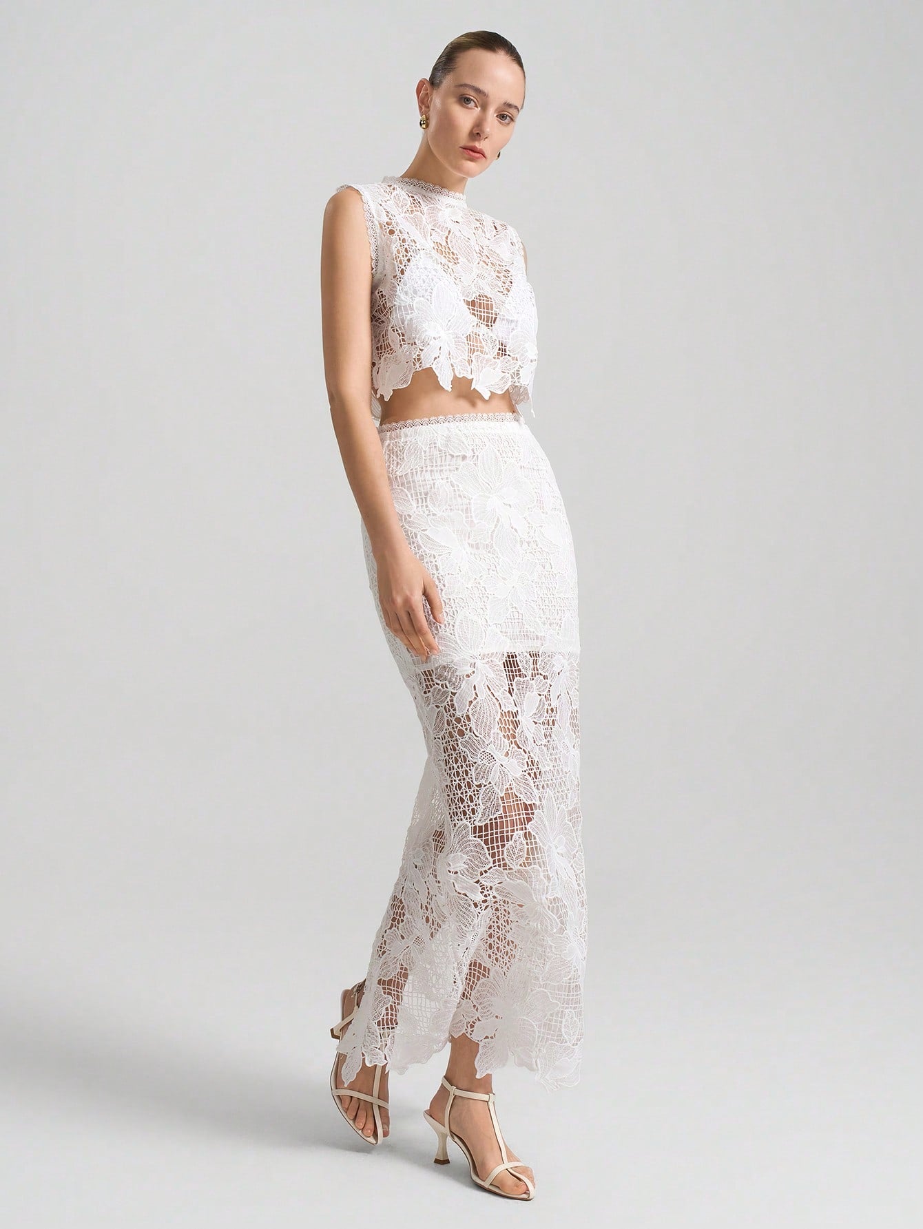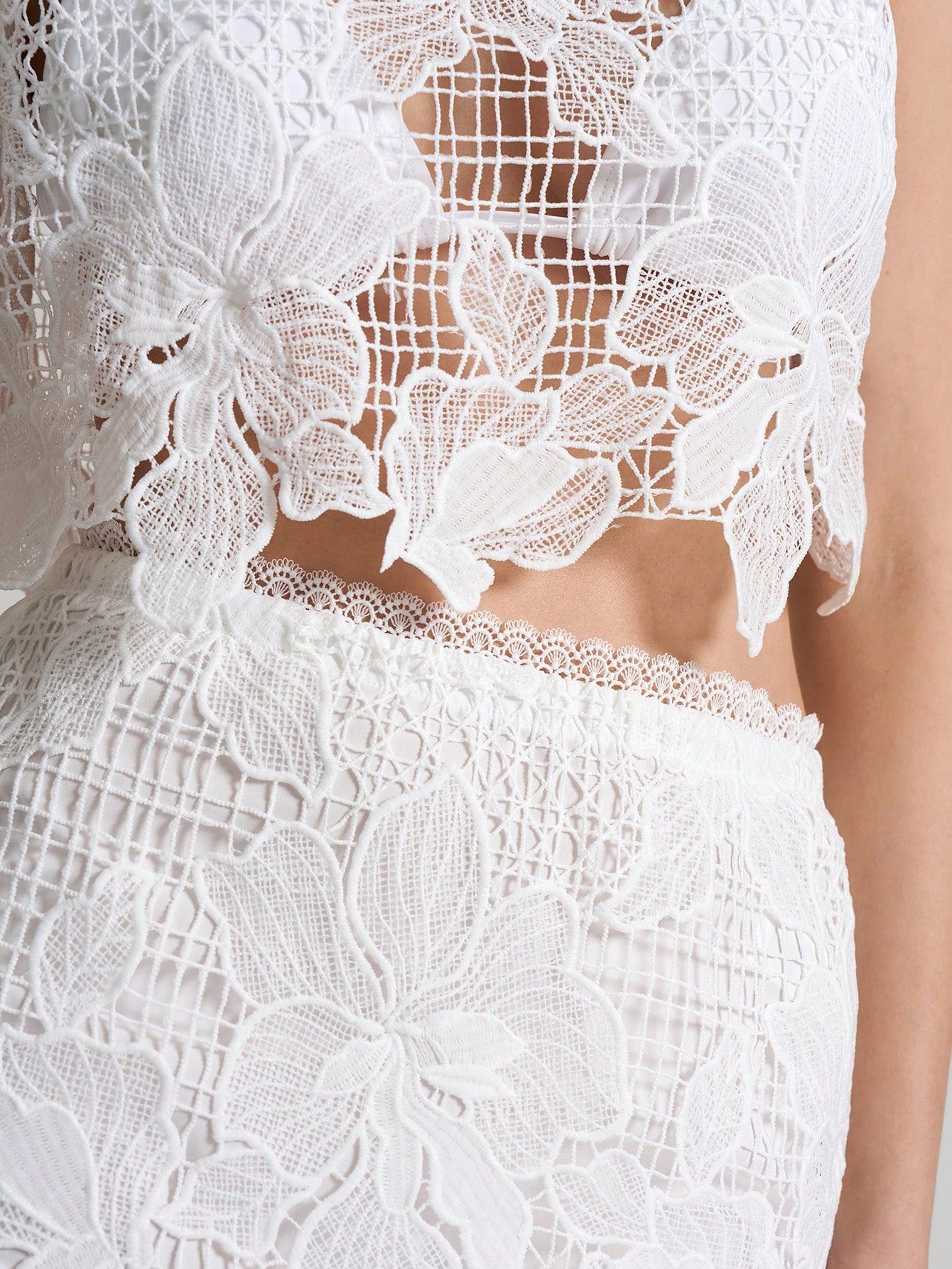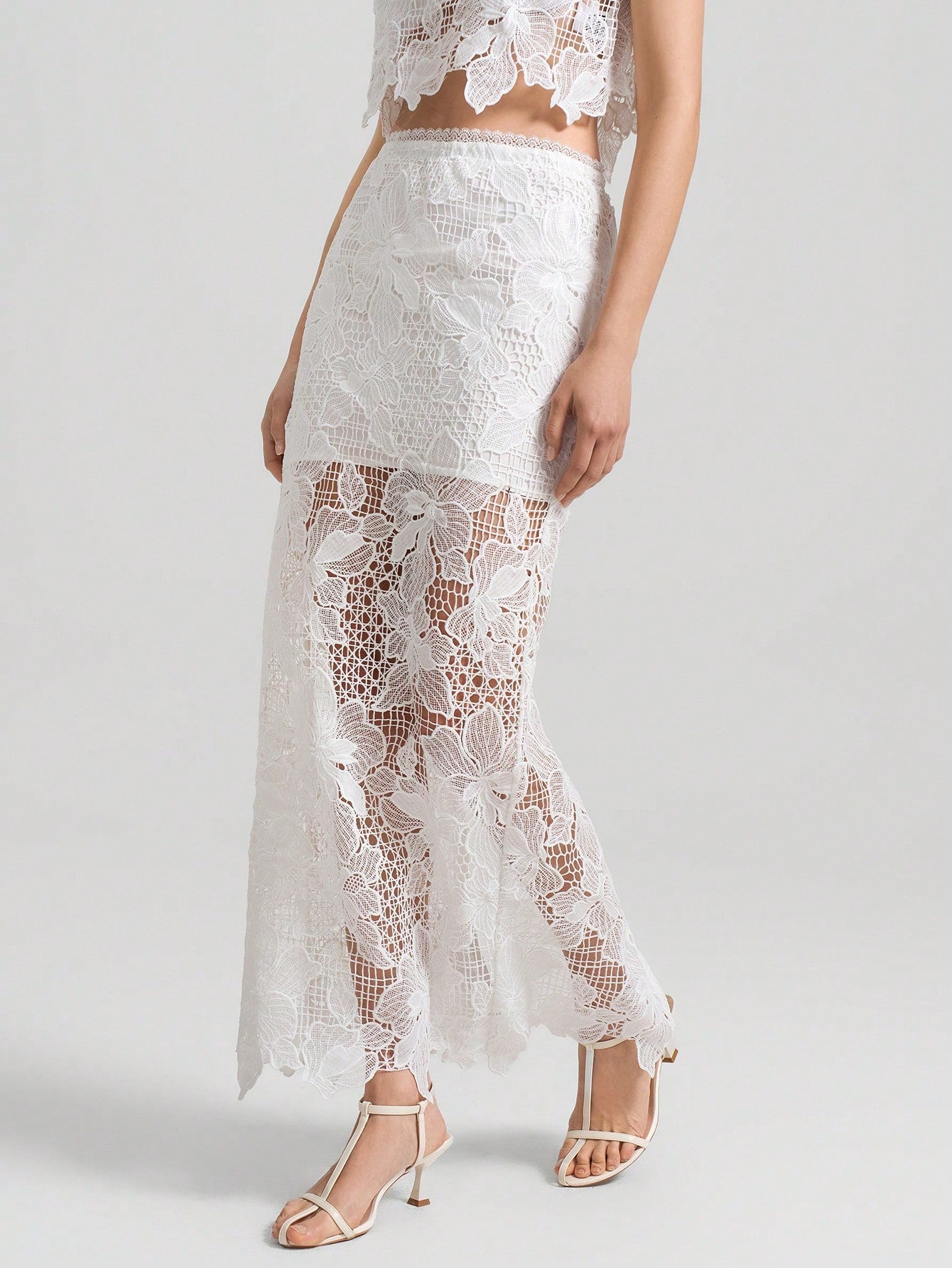 women Ontre 2pcs/Set Women's White Floral See-Through Asymmetric Hem Sleeveless Top And Skirt Set