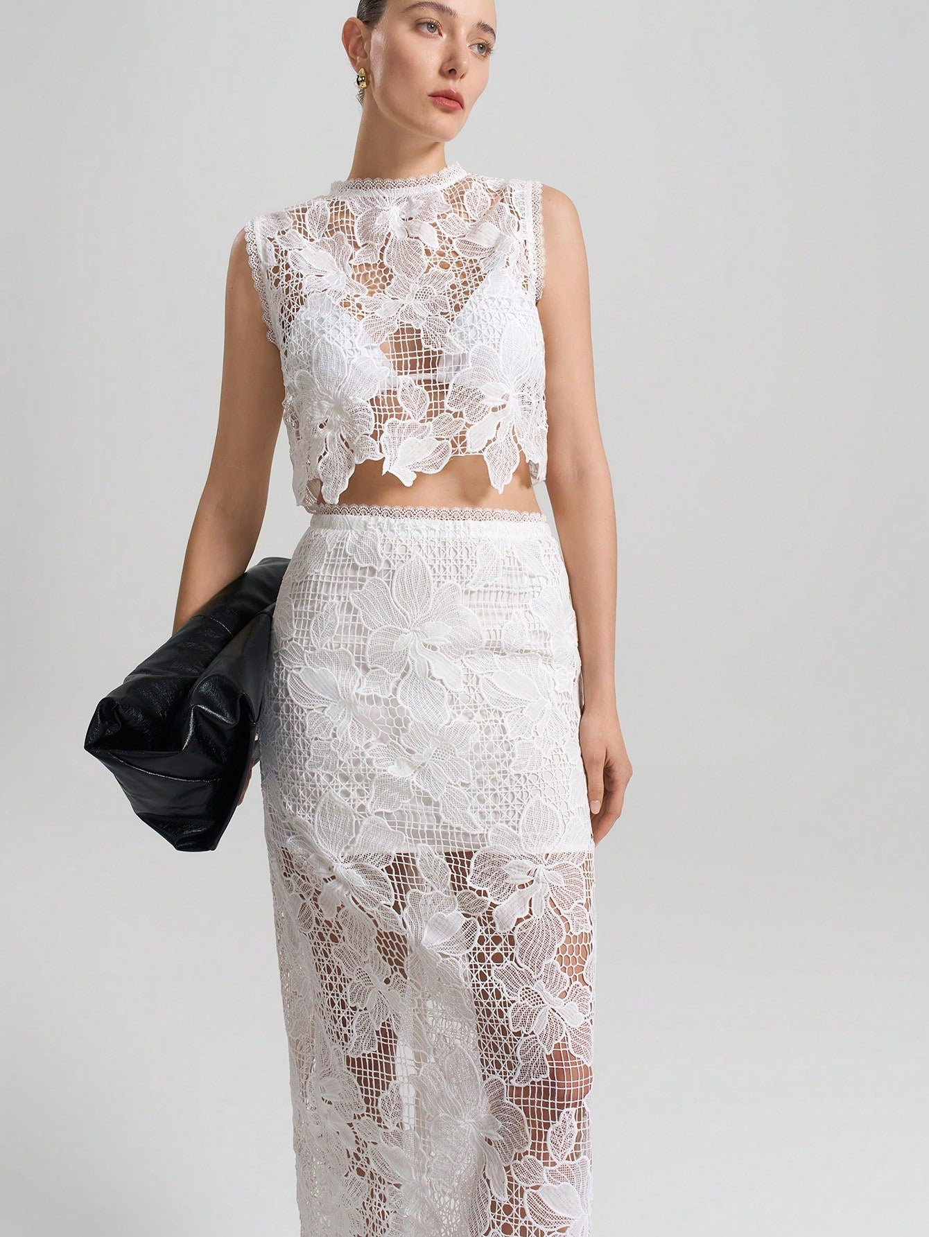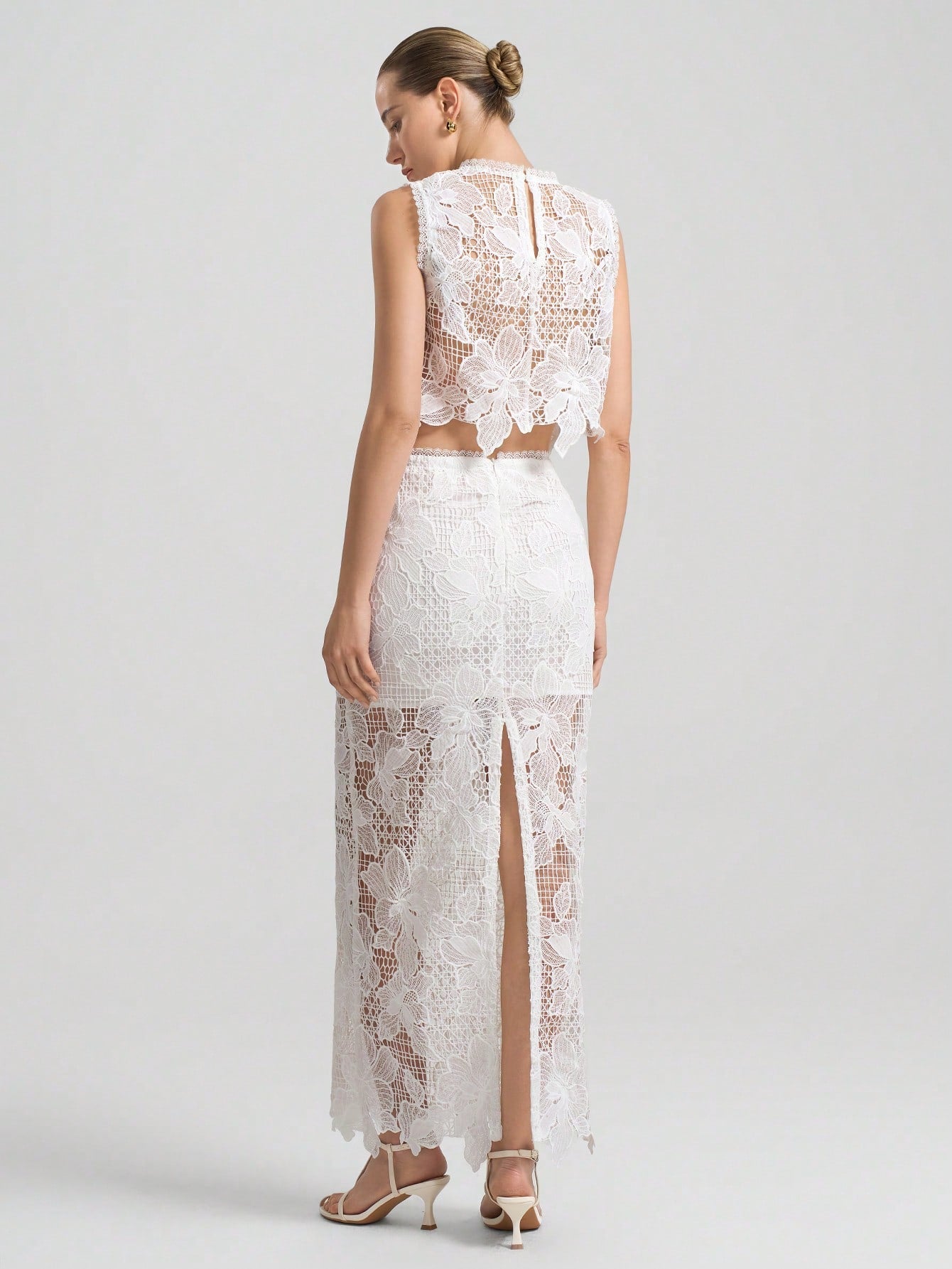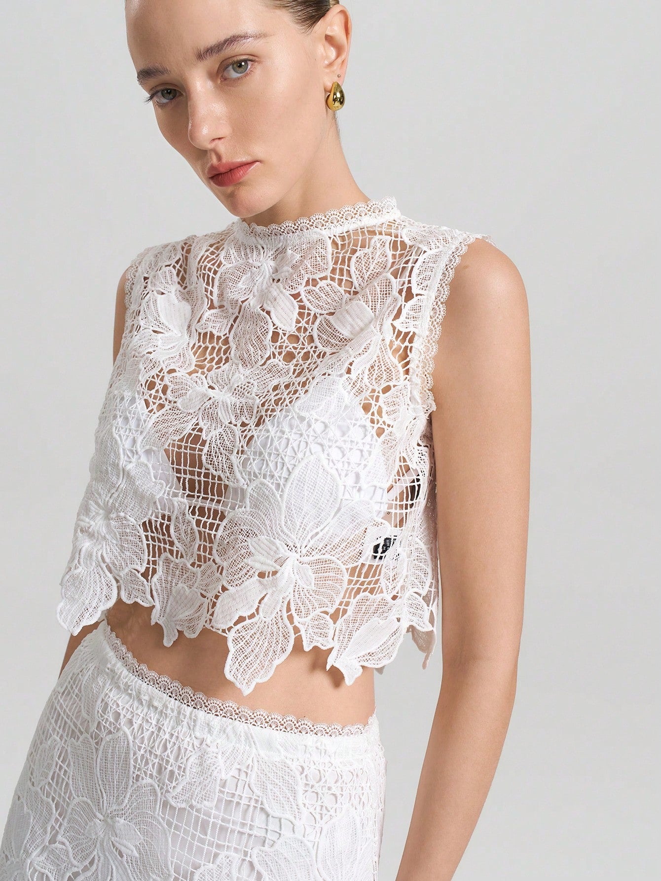 women Ontre 2pcs/Set Women's White Floral See-Through Asymmetric Hem Sleeveless Top And Skirt Set