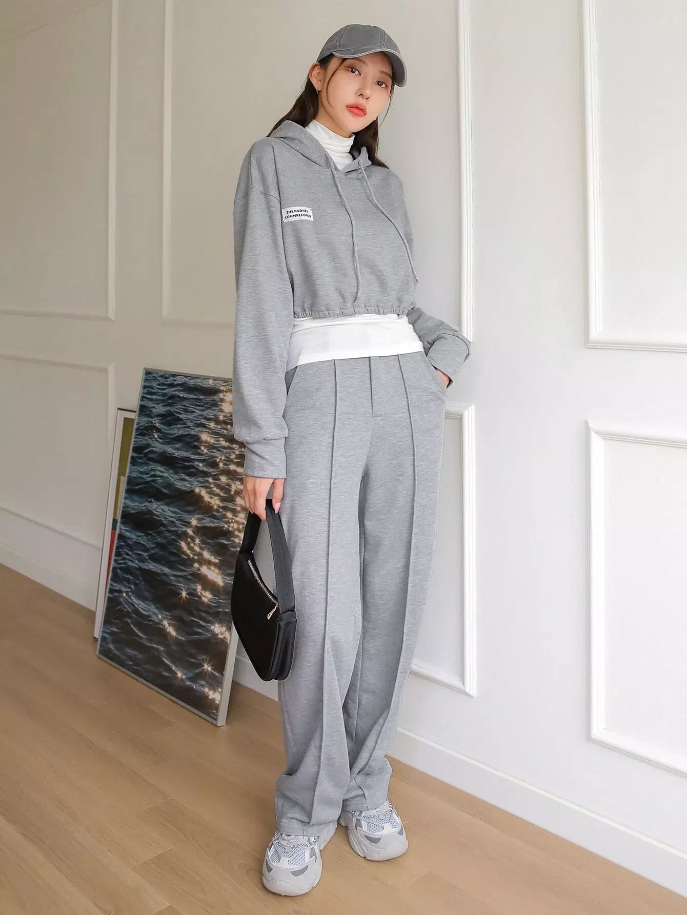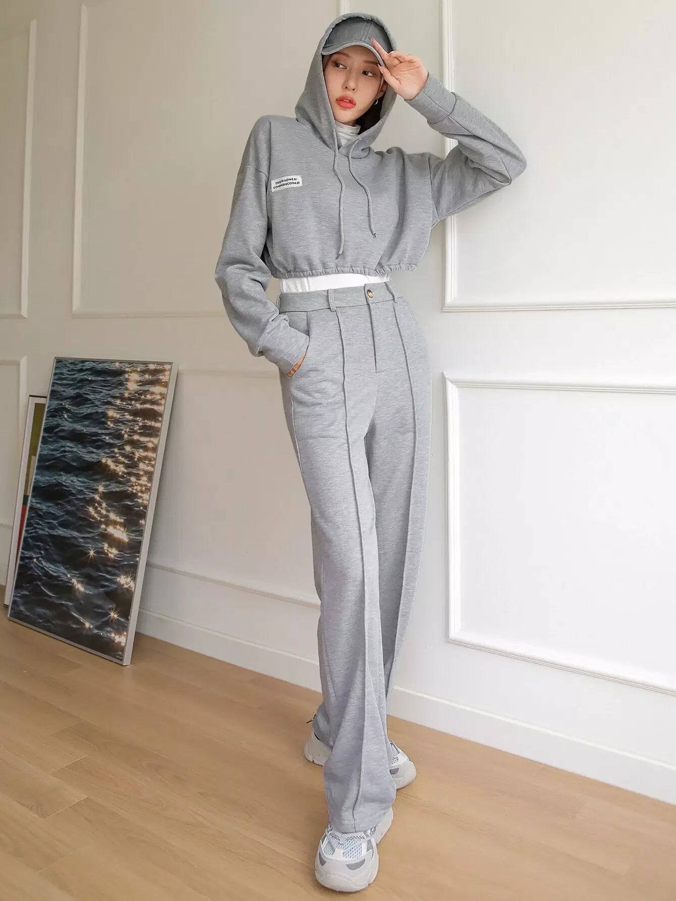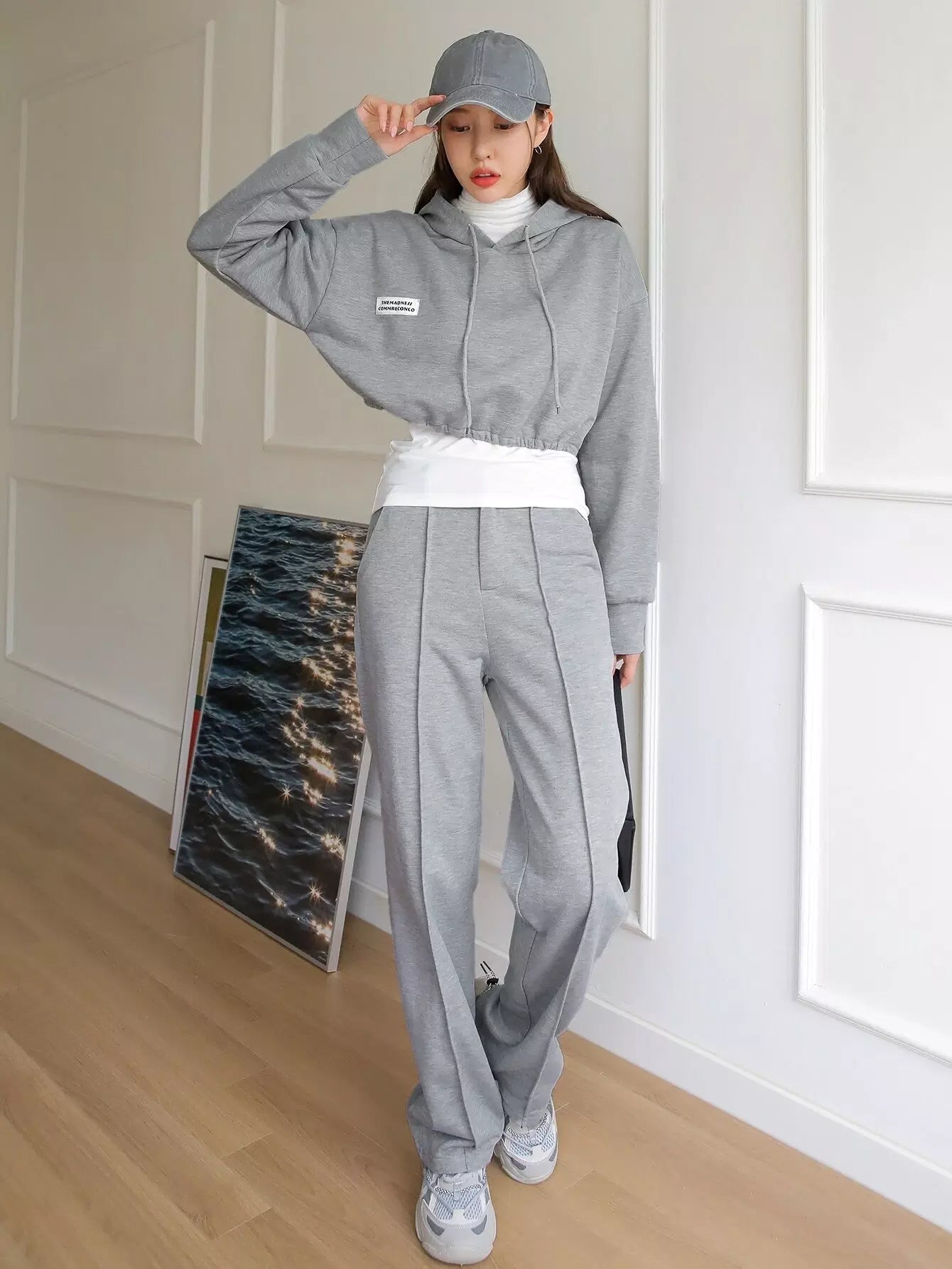Patched Detail Drop Shoulder Drawstring Crop Hoodie & Press Crease Sweatpants