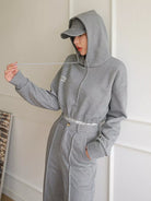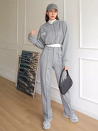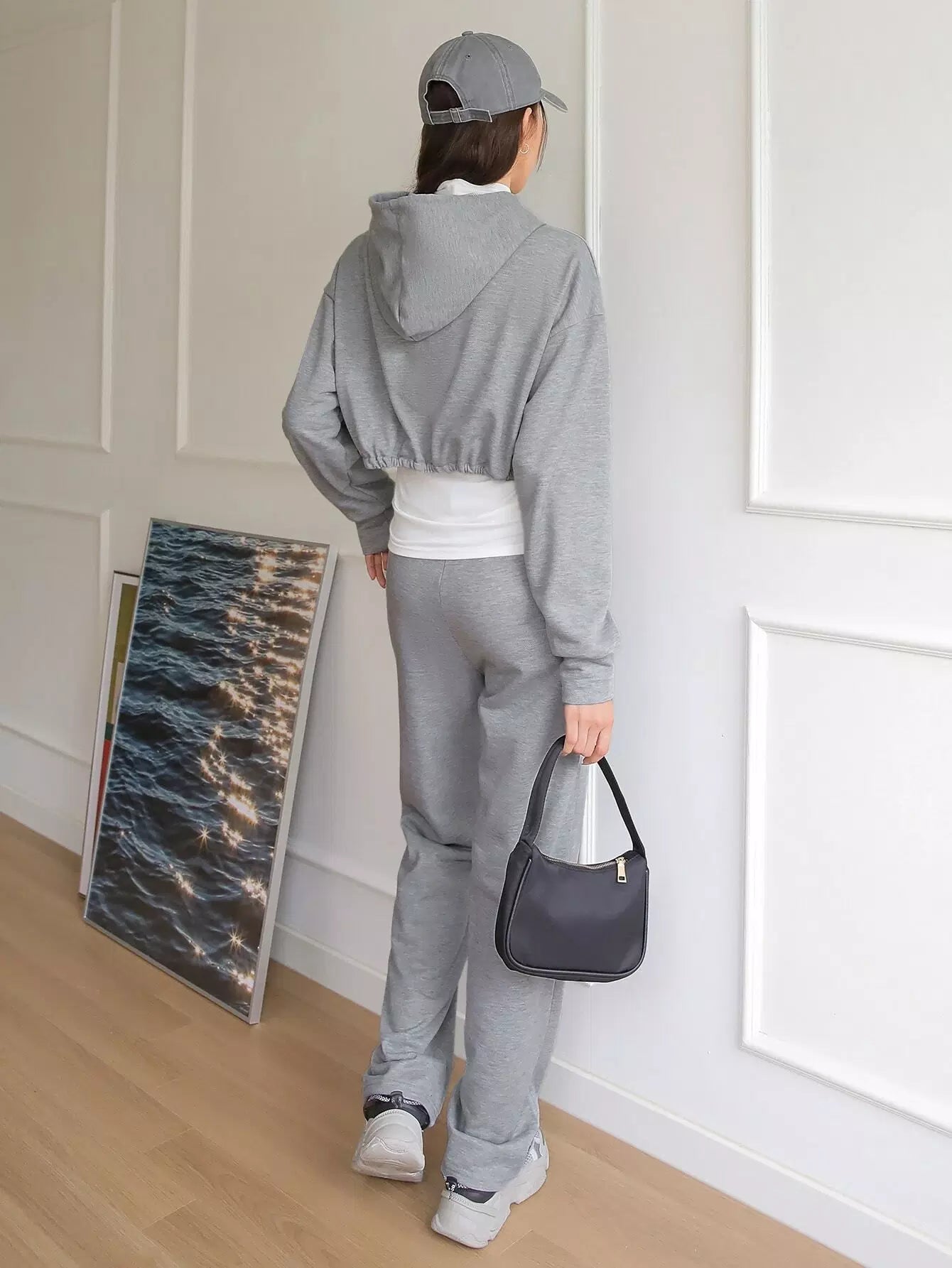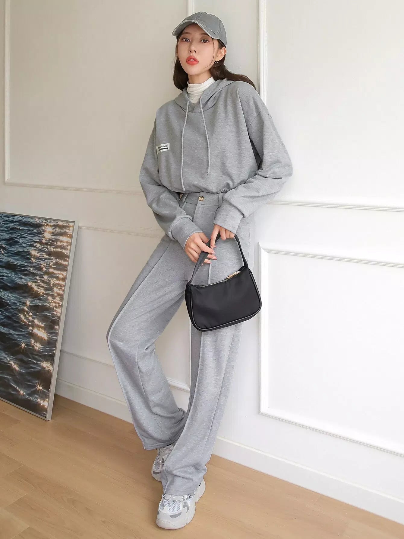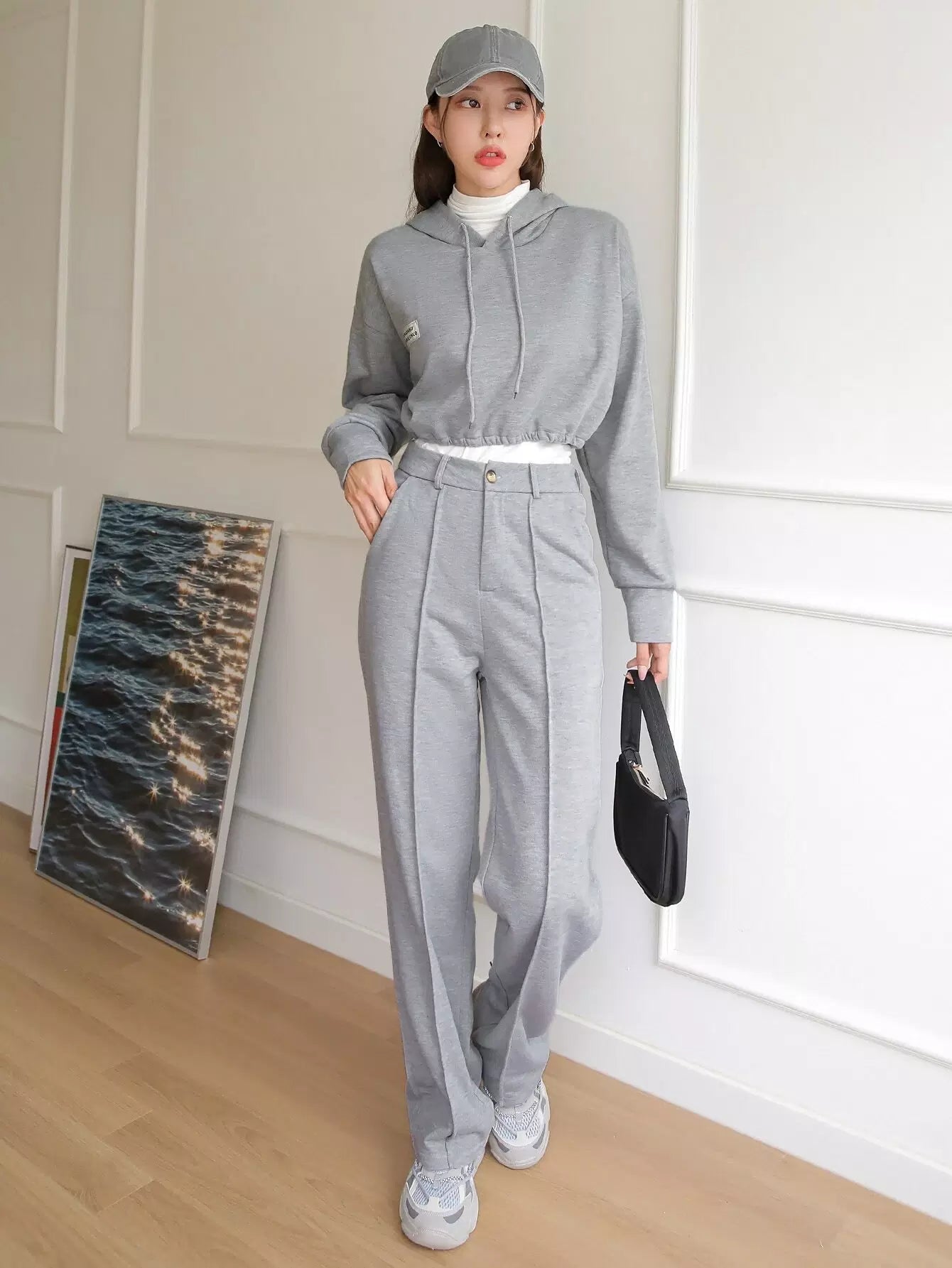 Patched Detail Drop Shoulder Drawstring Crop Hoodie & Press Crease Sweatpants