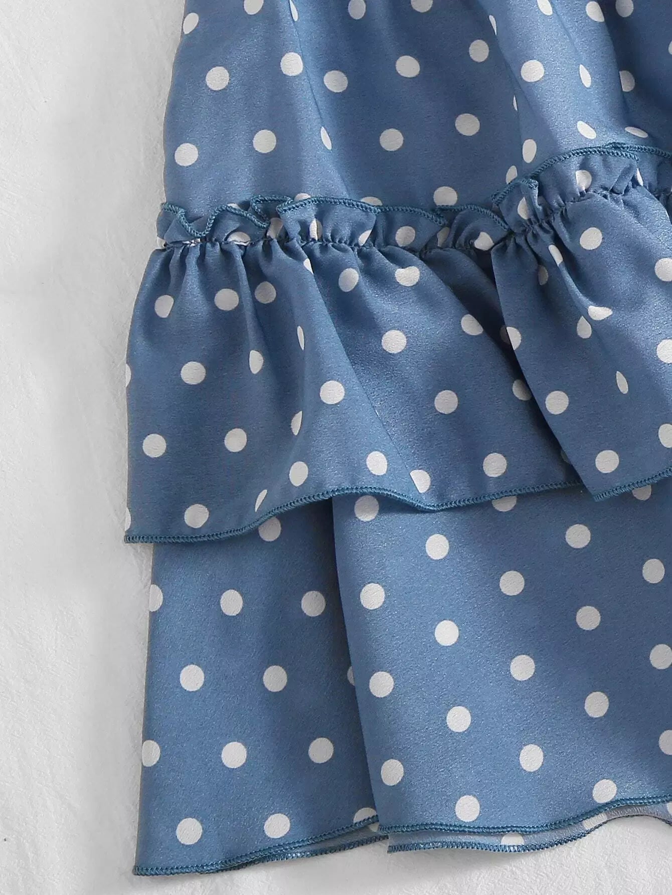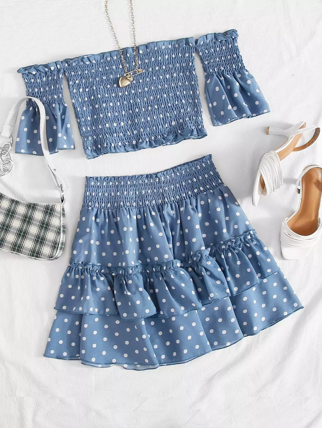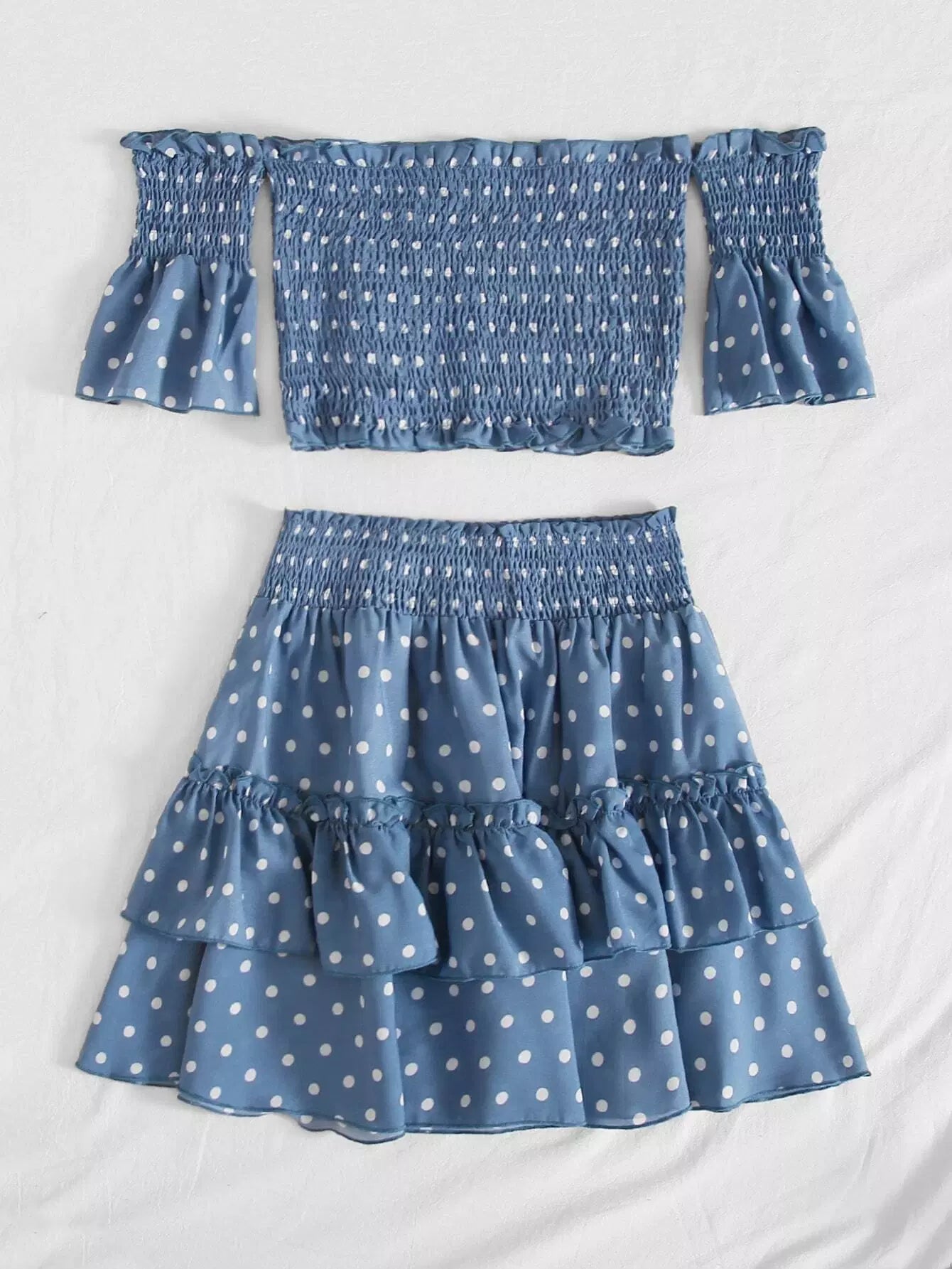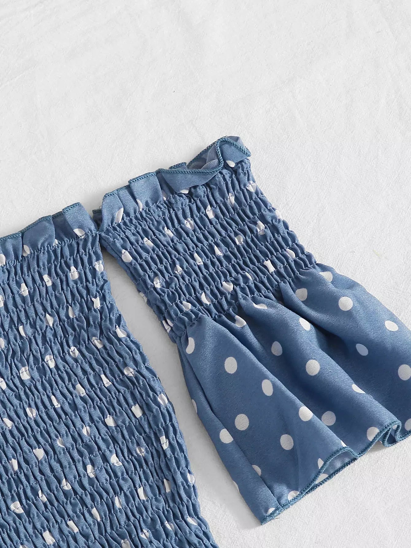 Polka Dot Shirred Crop Bardot Top With Skirt