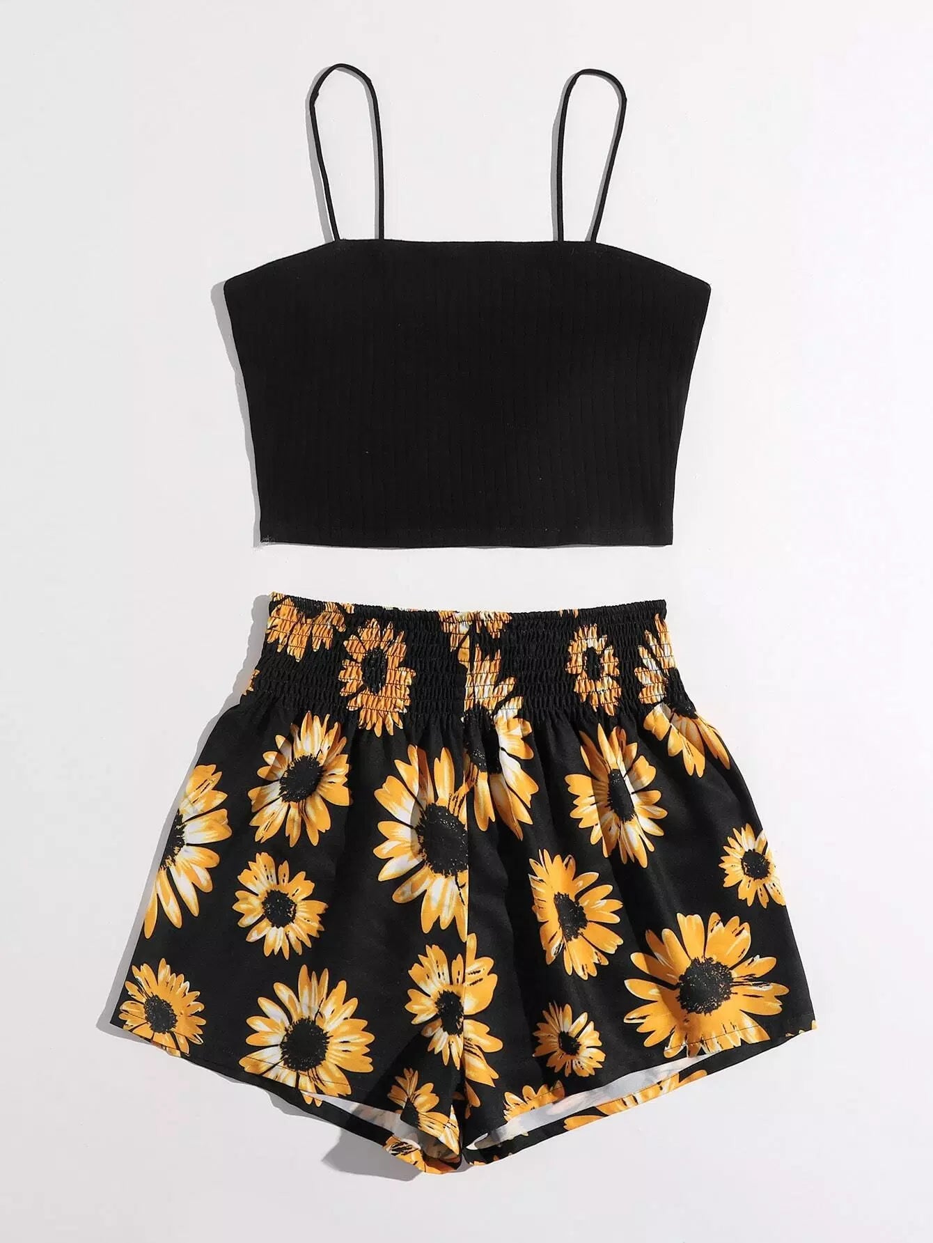 Rib-knit Cami Top & Shirred Waist Sunflower Print Shorts Set