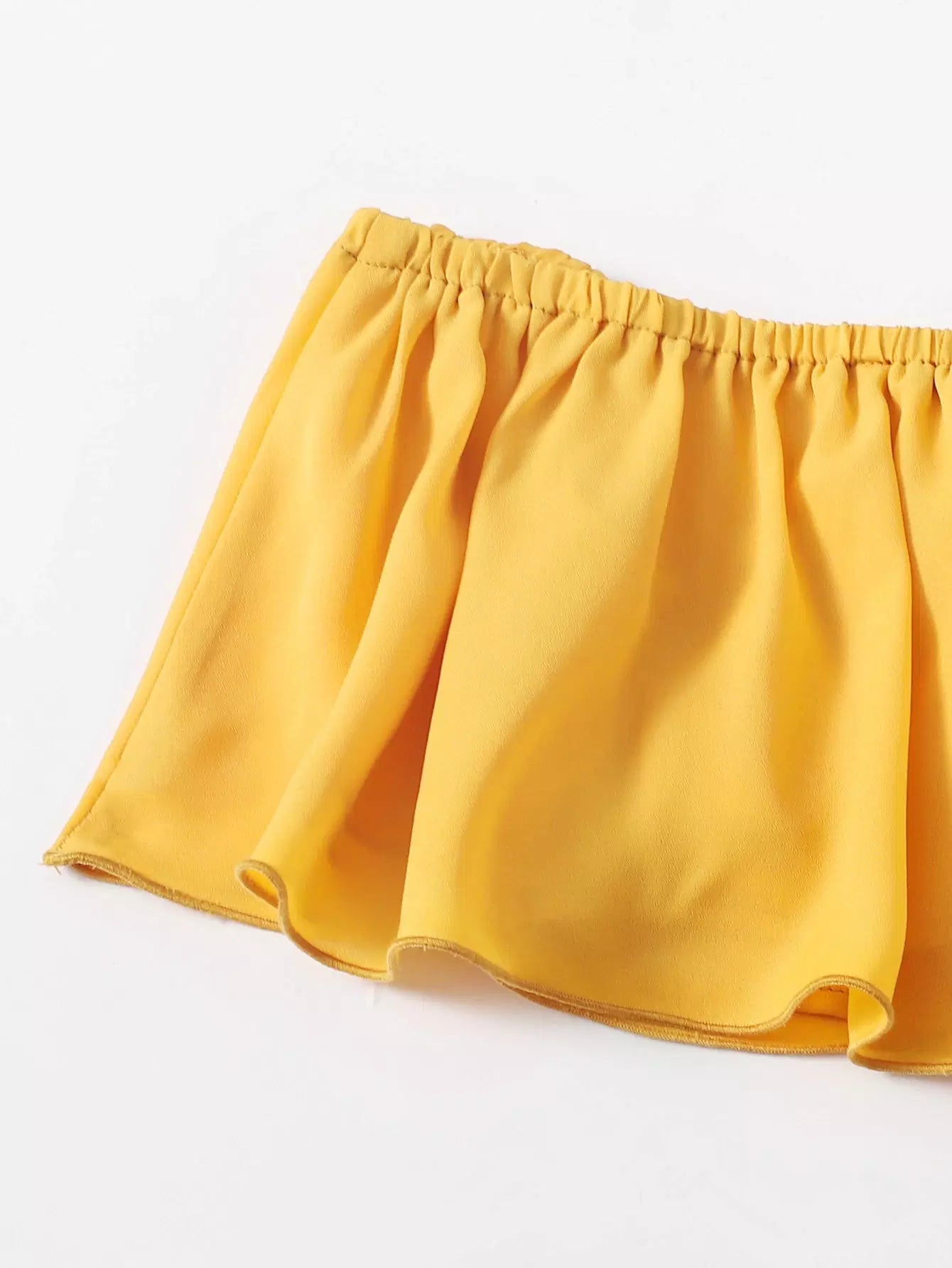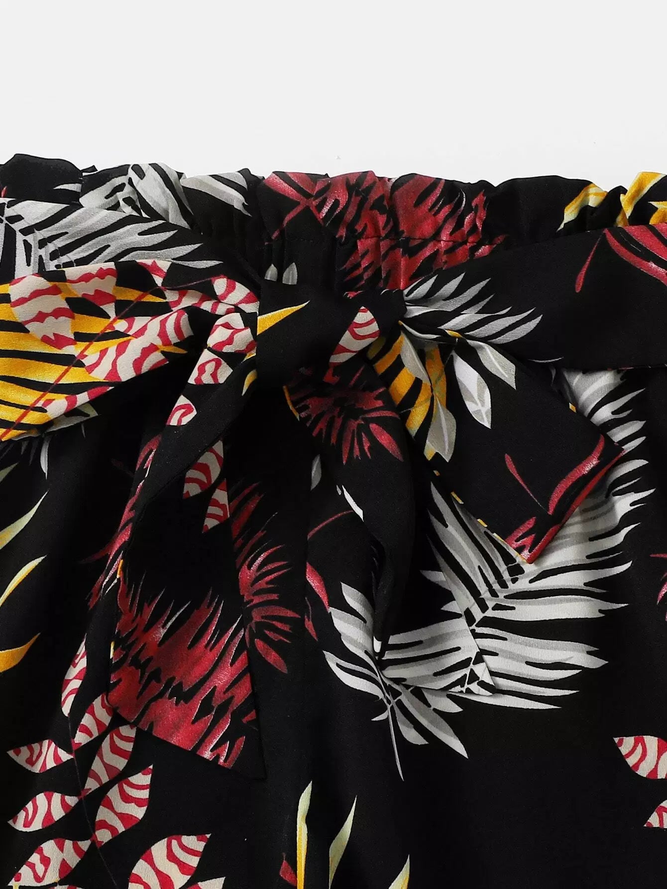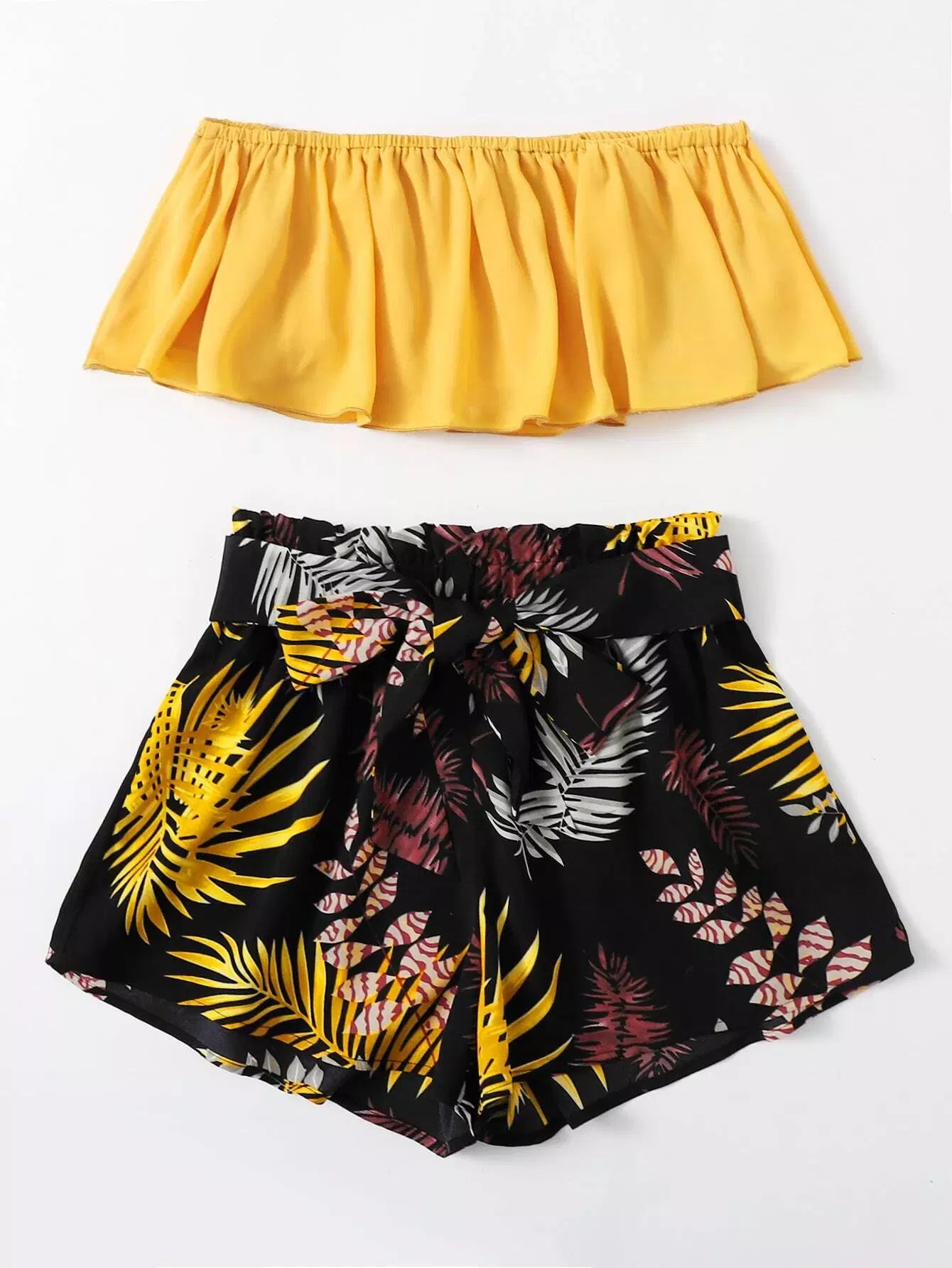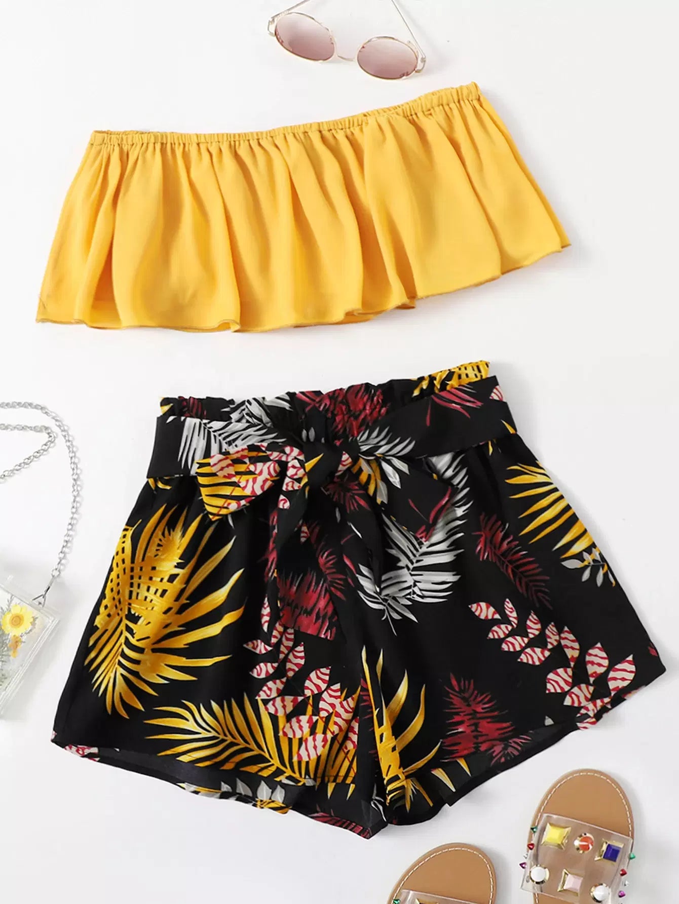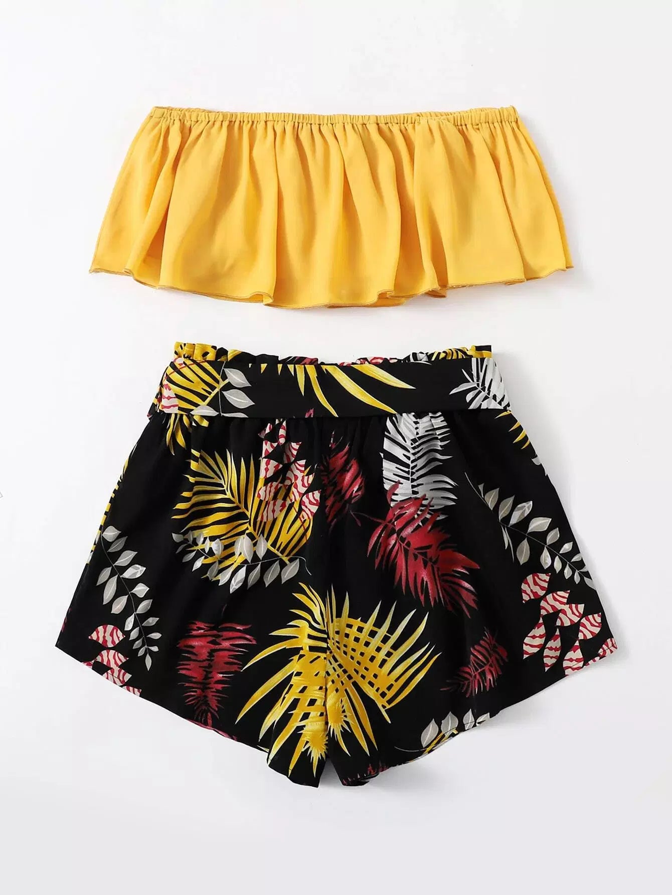 Ruffle Hem Tube Top & Self Tropical Shorts Set Without Belt