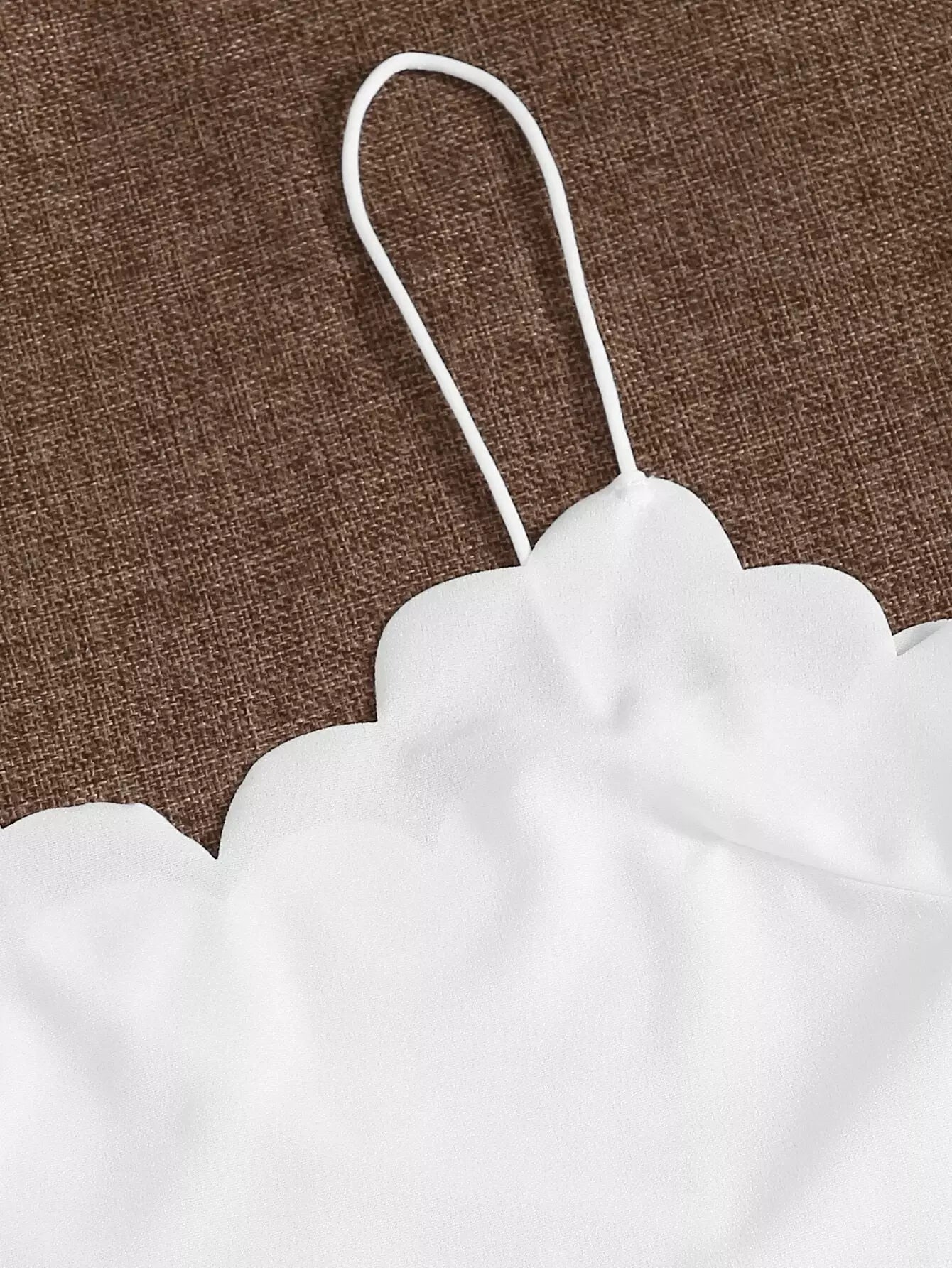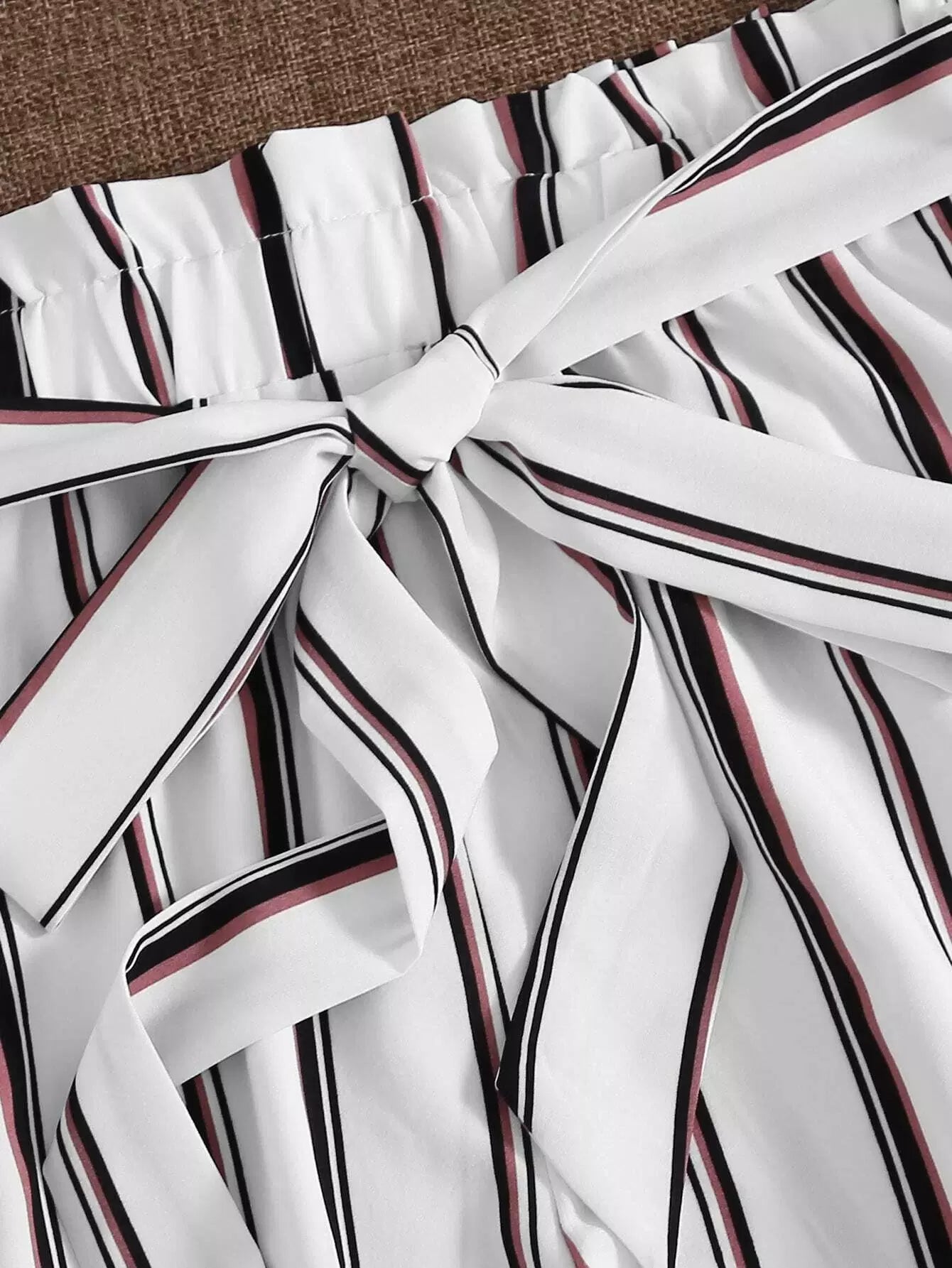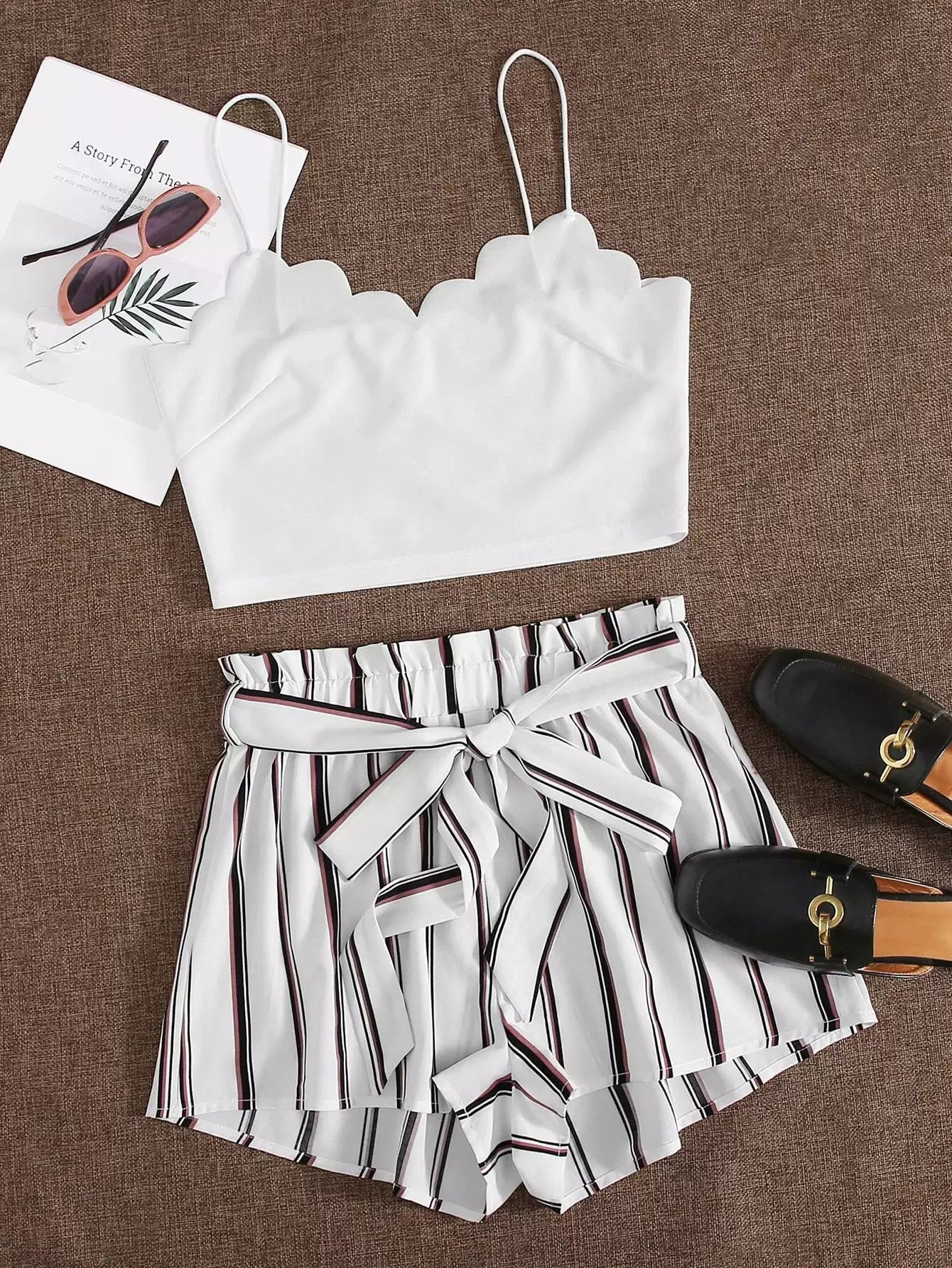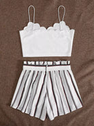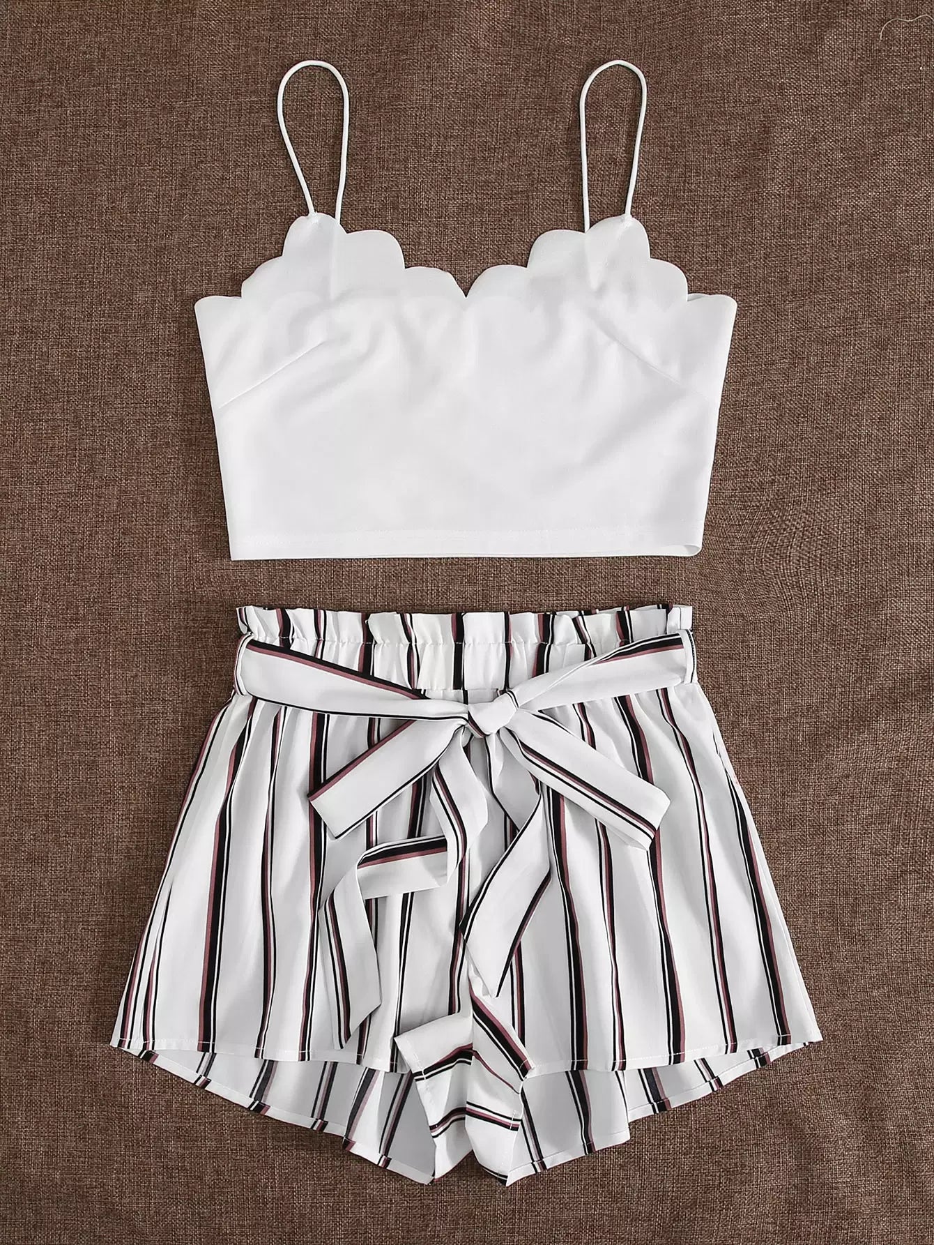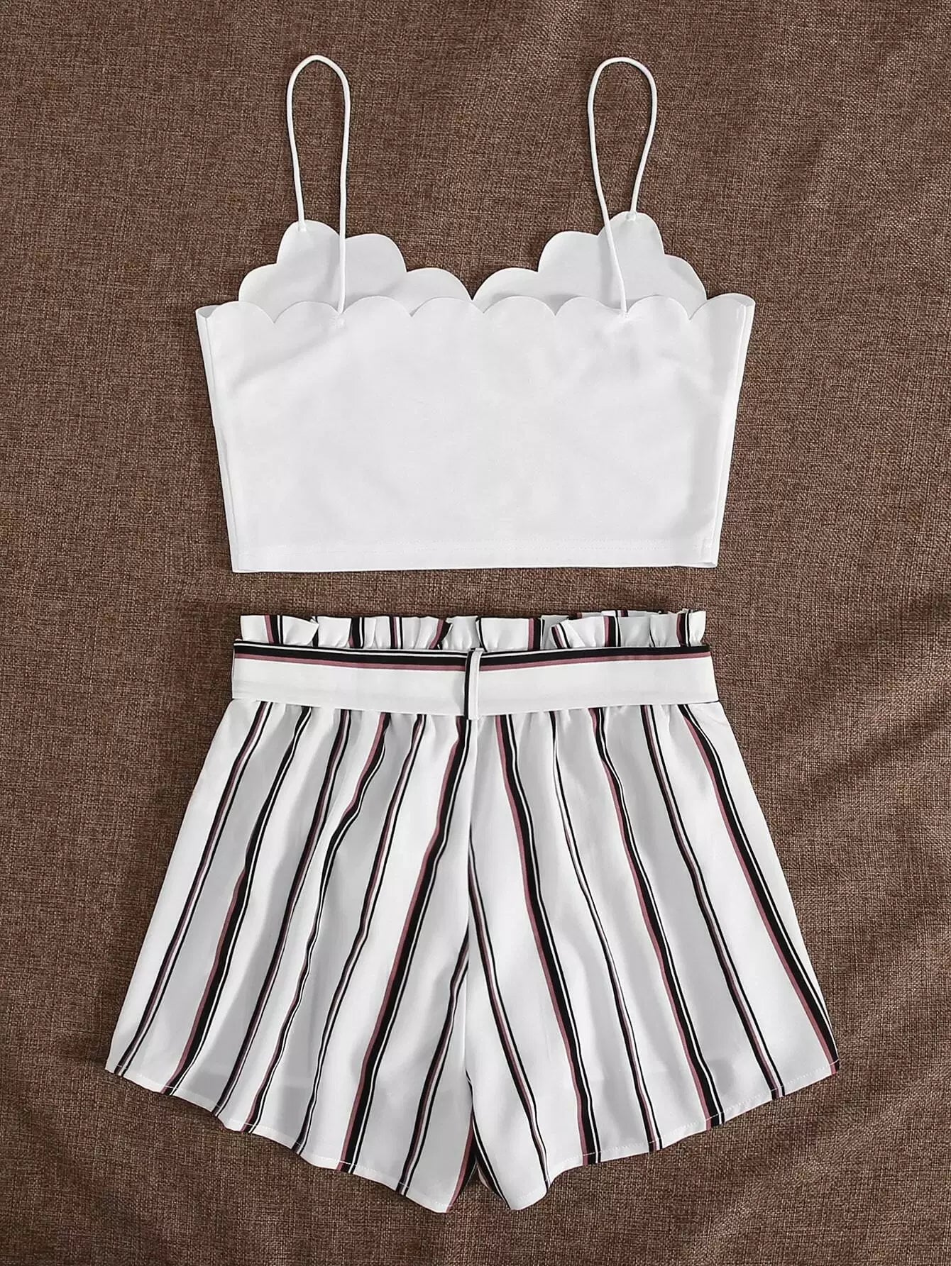Scallop Trim Crop Cami Top & Striped Shorts Set Without Belt