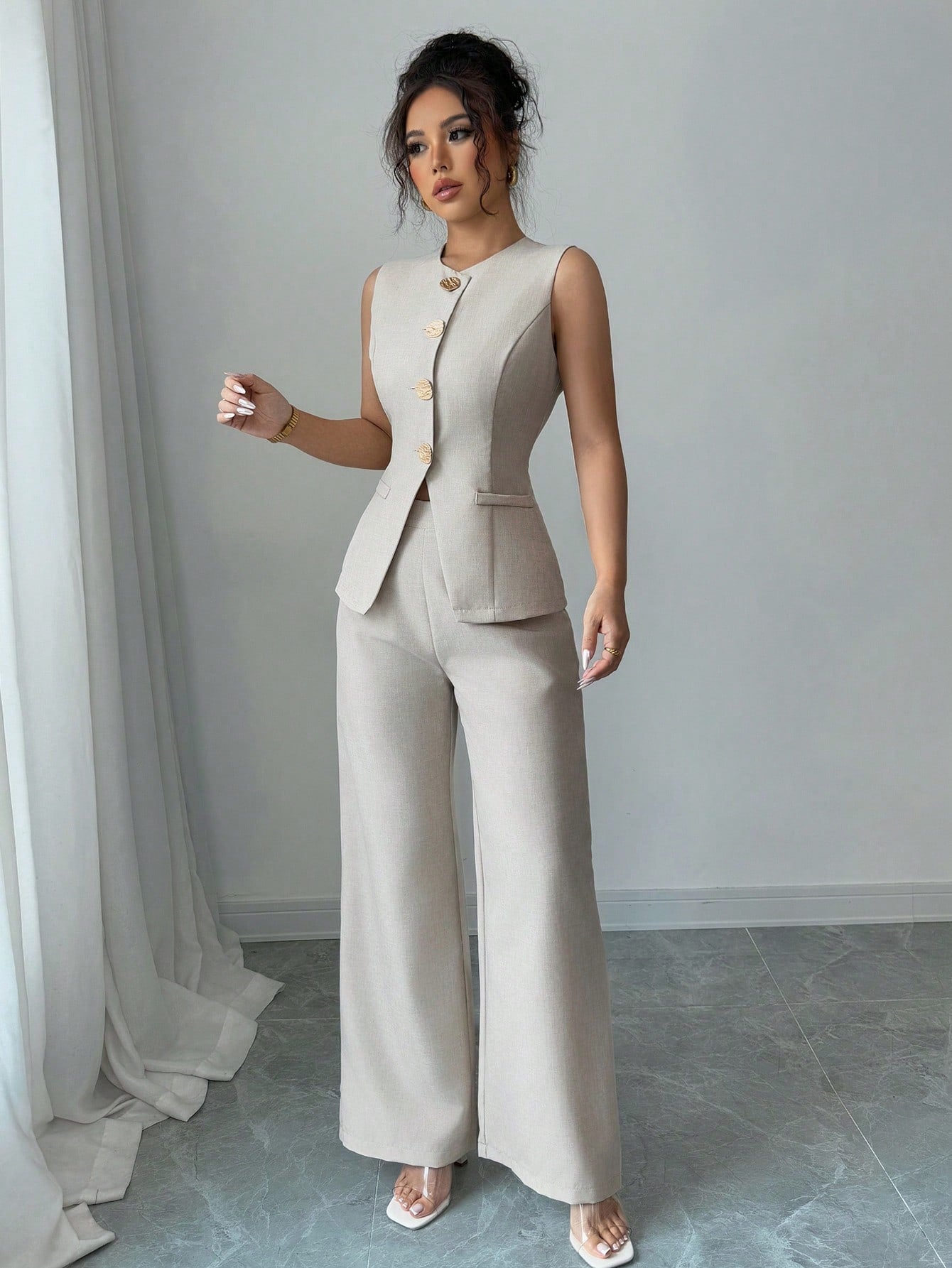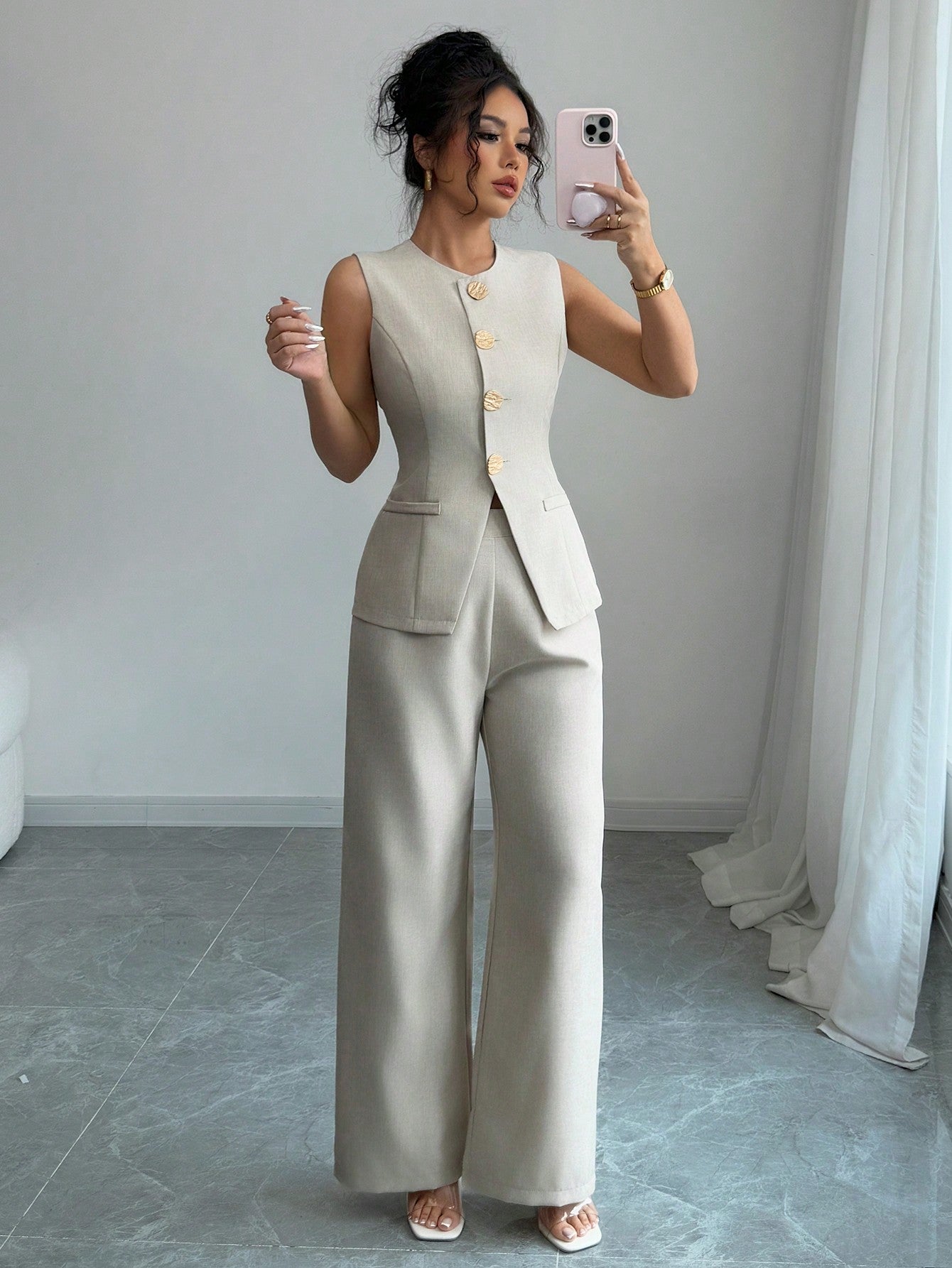 Selianne Women's Elegant French Style Flower Button Leisure/Commuting 2 Pieces Set