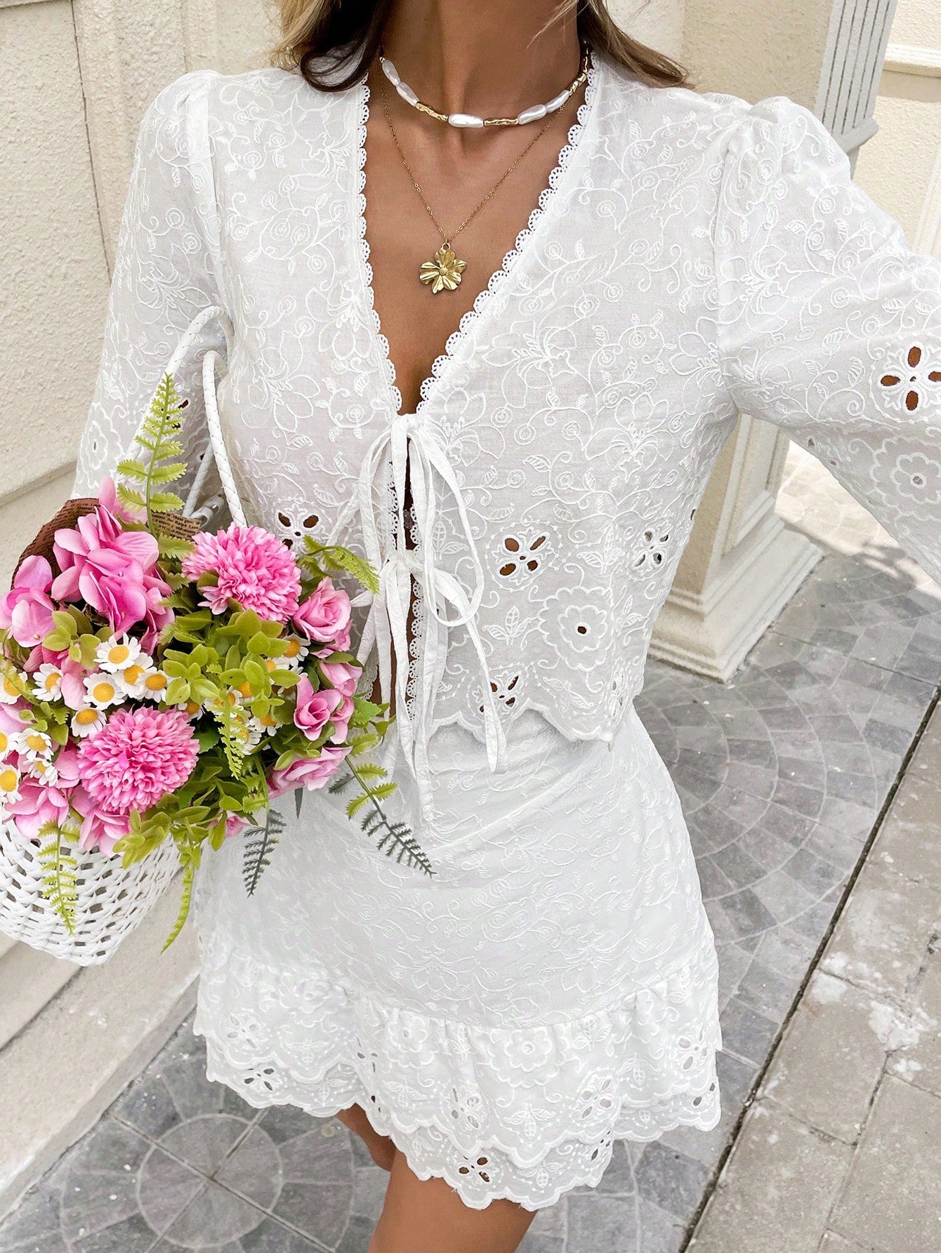 women SHEIN LUNE V-Neck Front Bowknot Lace Patchwork Blouse And Multi-Layer Ruffle Hem Skirt Hollow Out Embroidered Jacquard Fabric Casual Holiday Elegant Ladies 2 Pieces Outfit