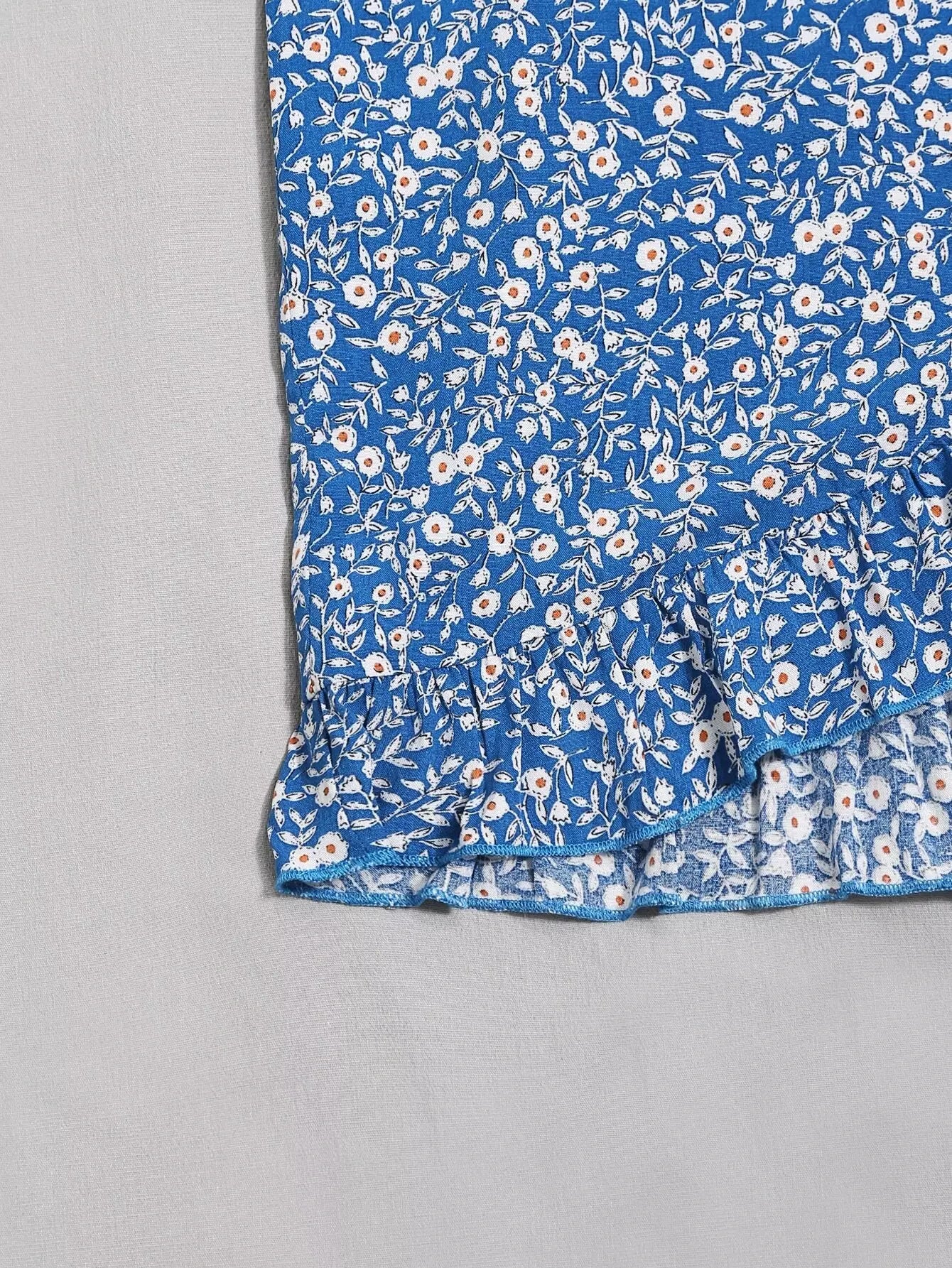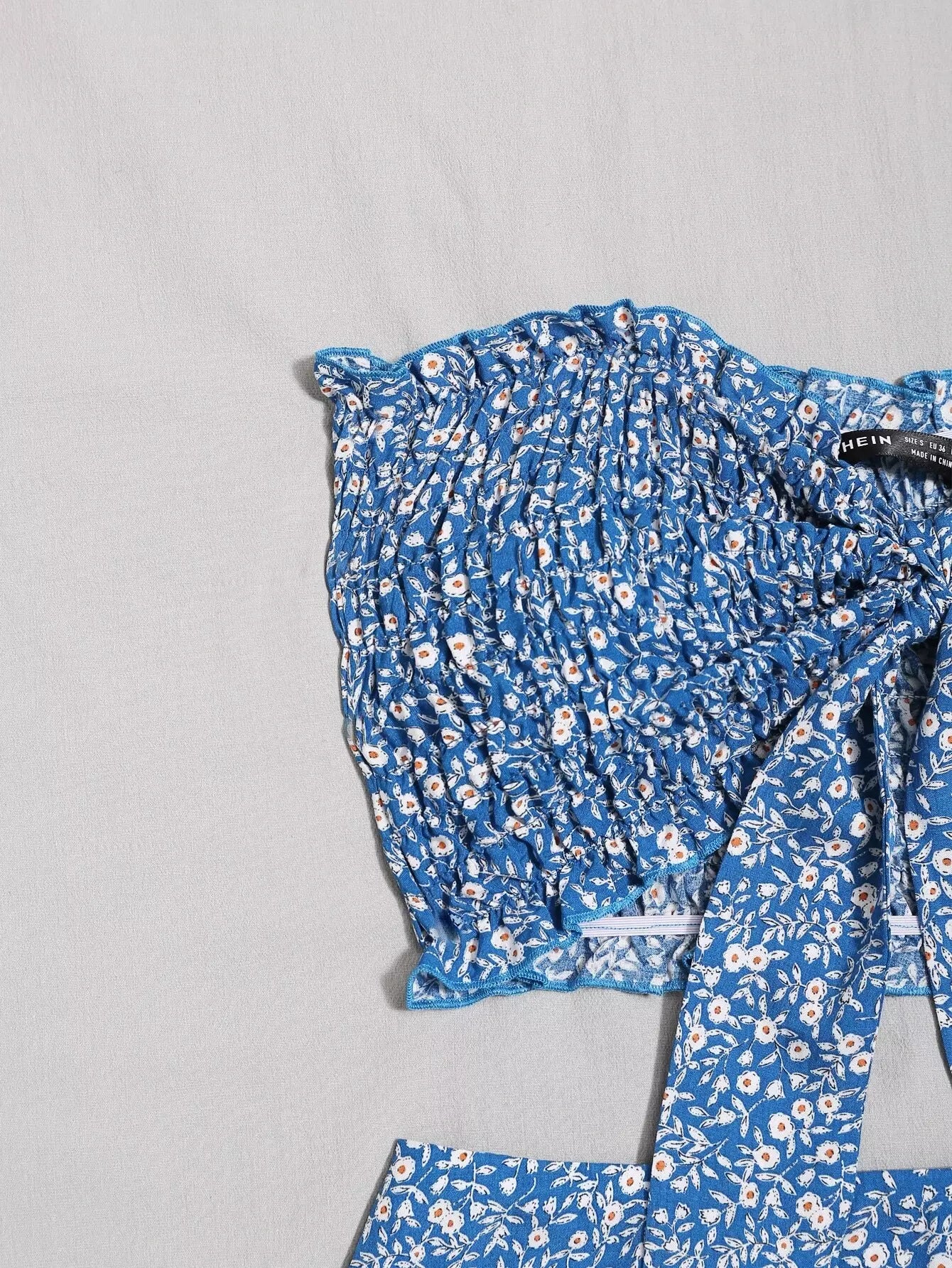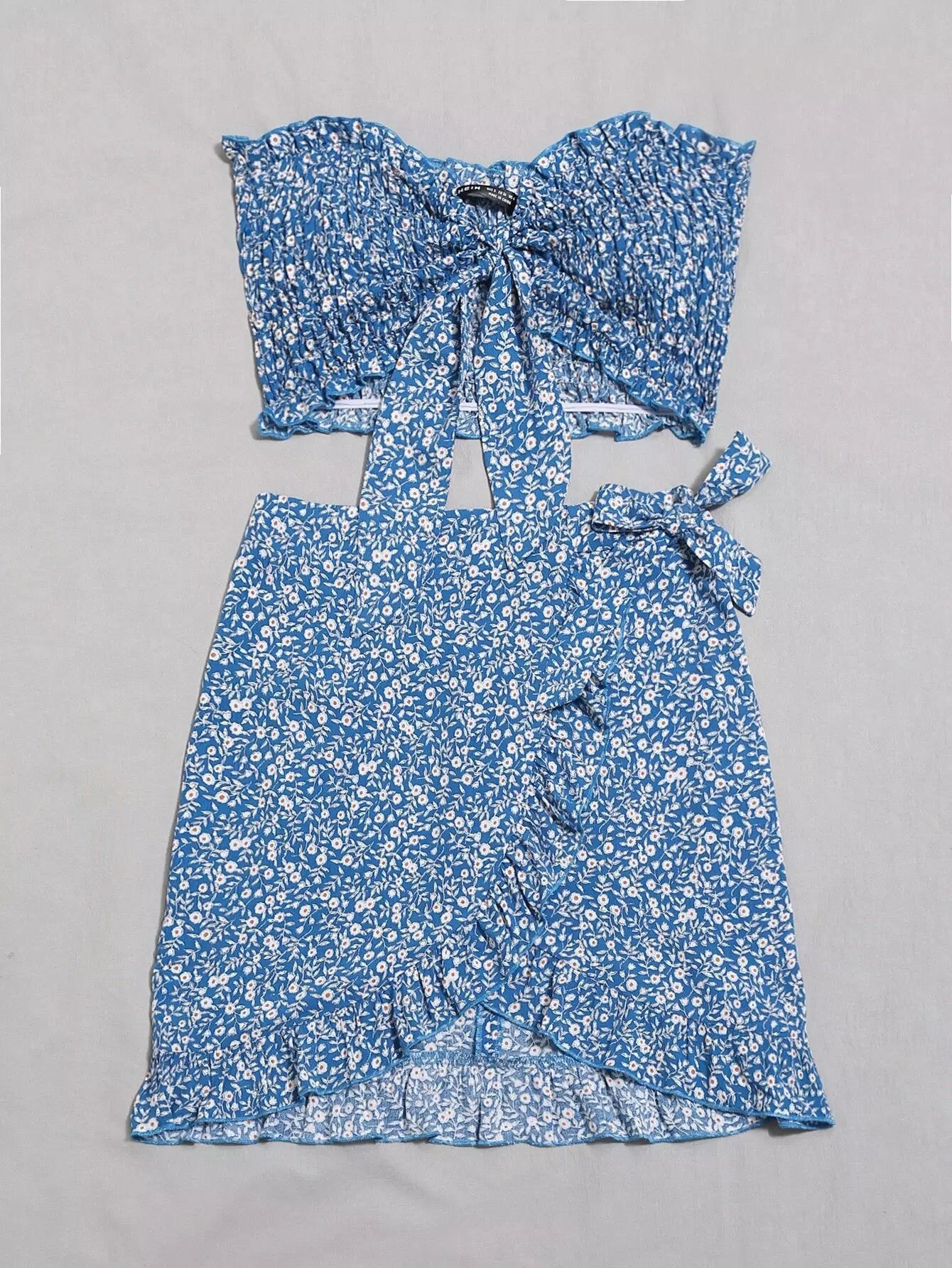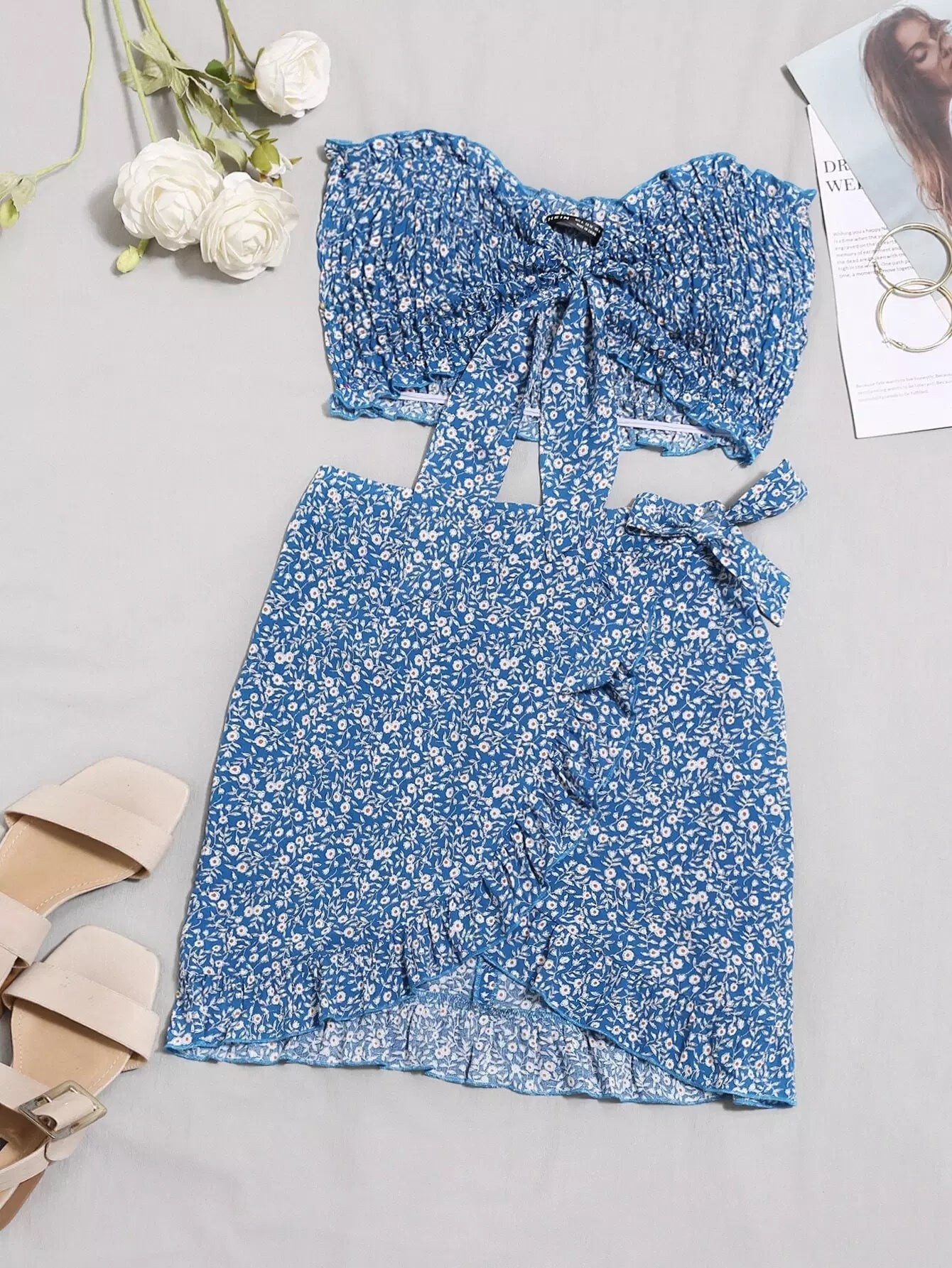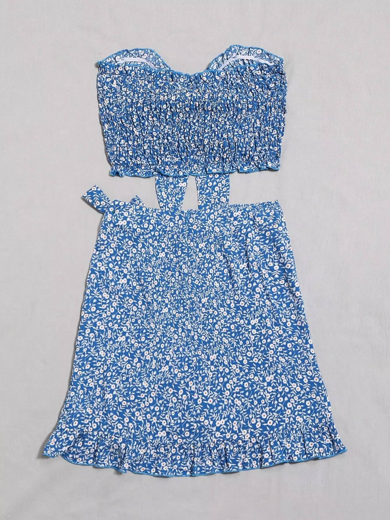 Tie Front Floral Shirred Bandeau Top & Wrap Knot Skirt Set
