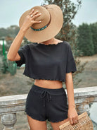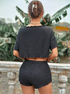 Waffle Knit Lettuce Trim Drop Shoulder Crop Tee & Knot Waist Shorts