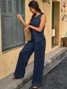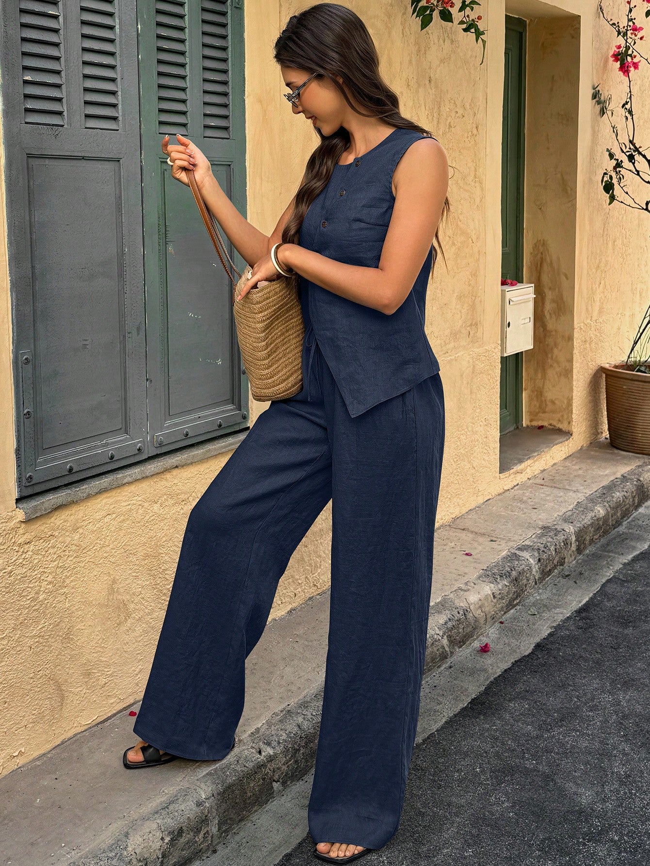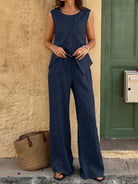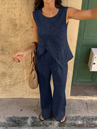 Breezaya 2pcs/Set Women Linen Vacation Style Asymmetrical Button Decor Round Neck Sleeveless Top And