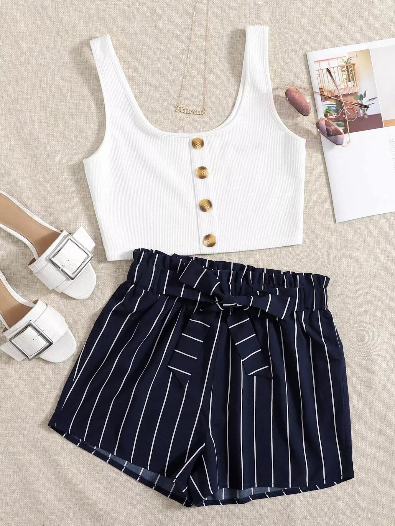 Button Front Top & Striped Shorts Set Without Belt