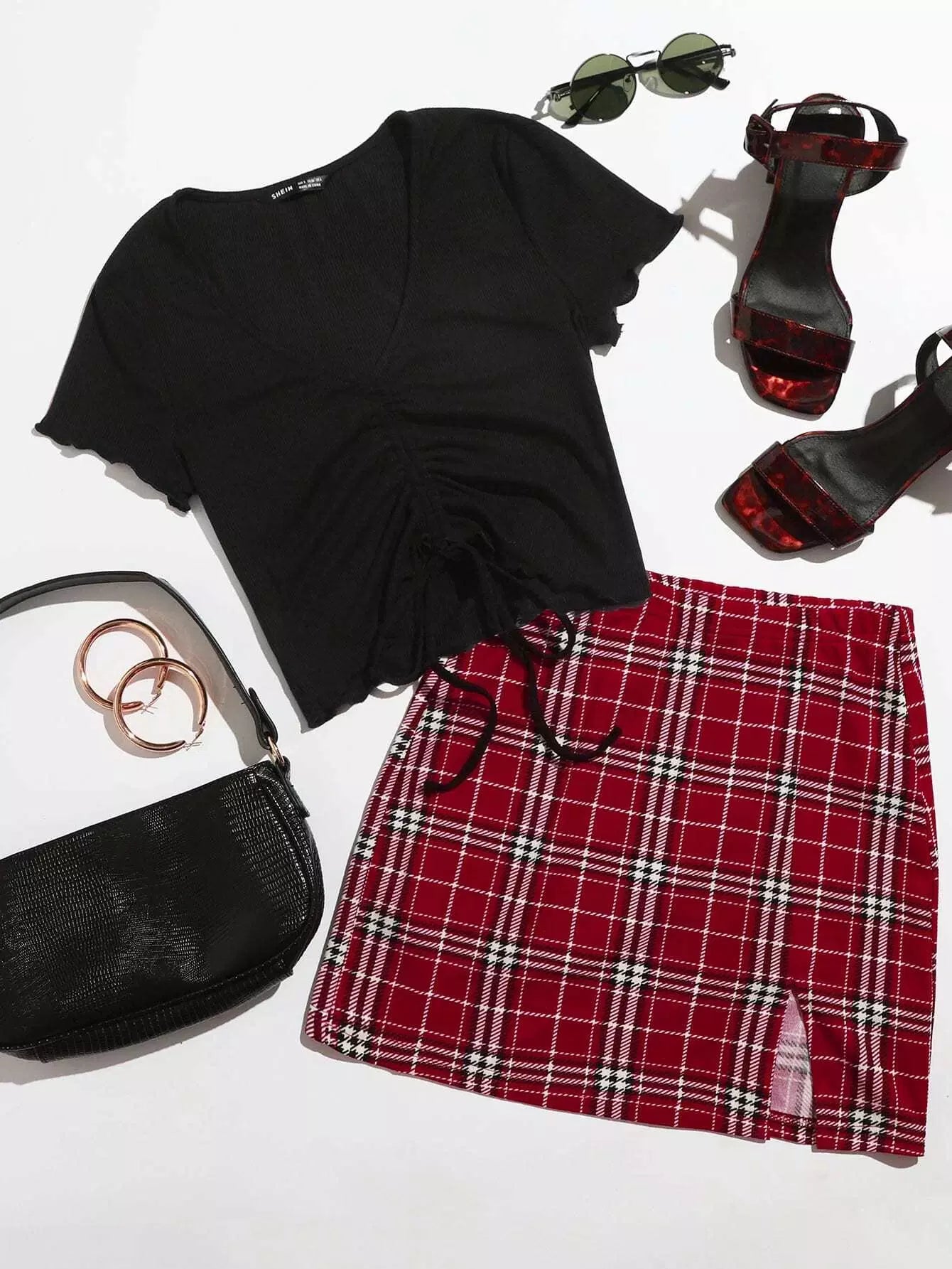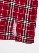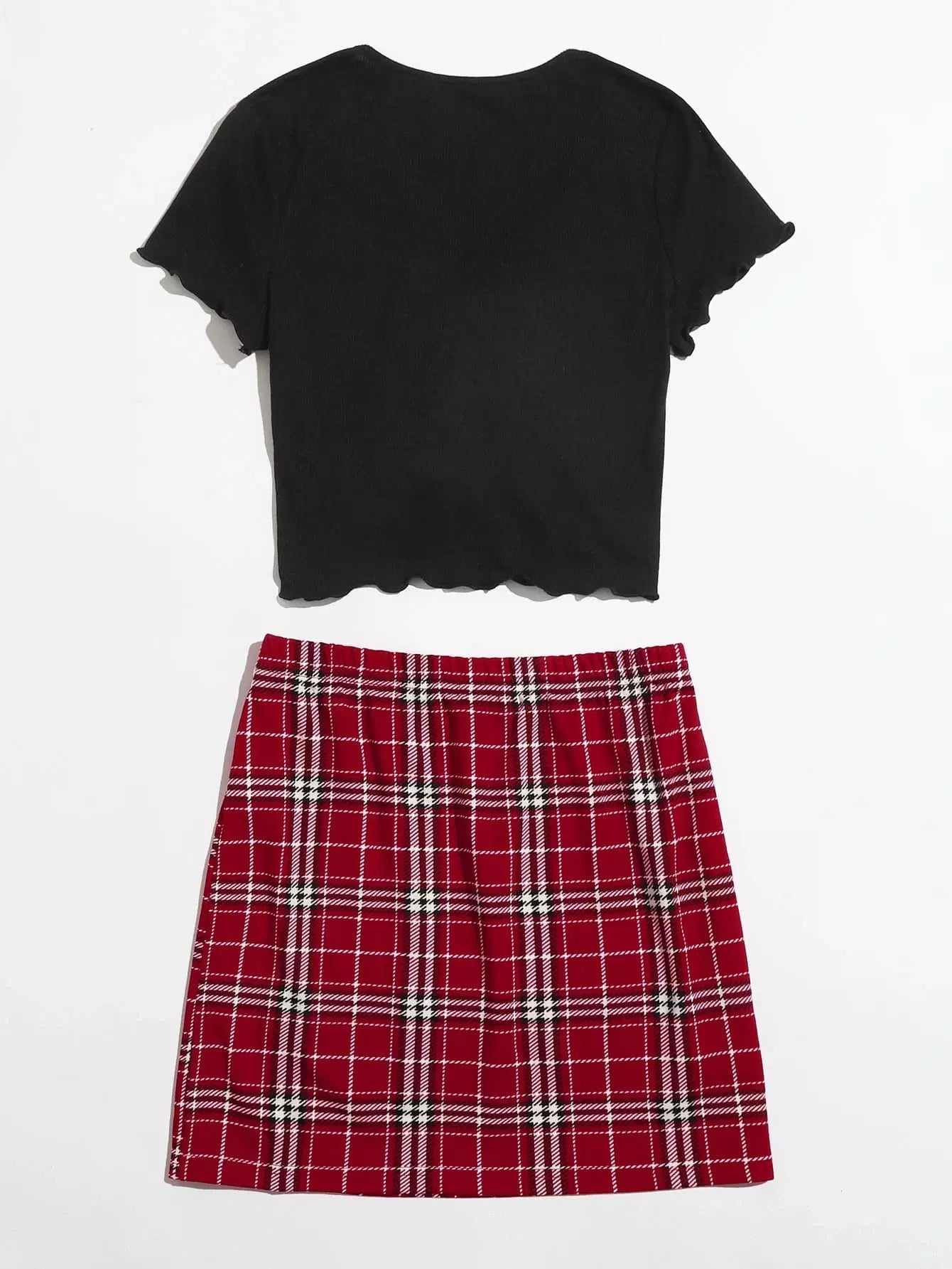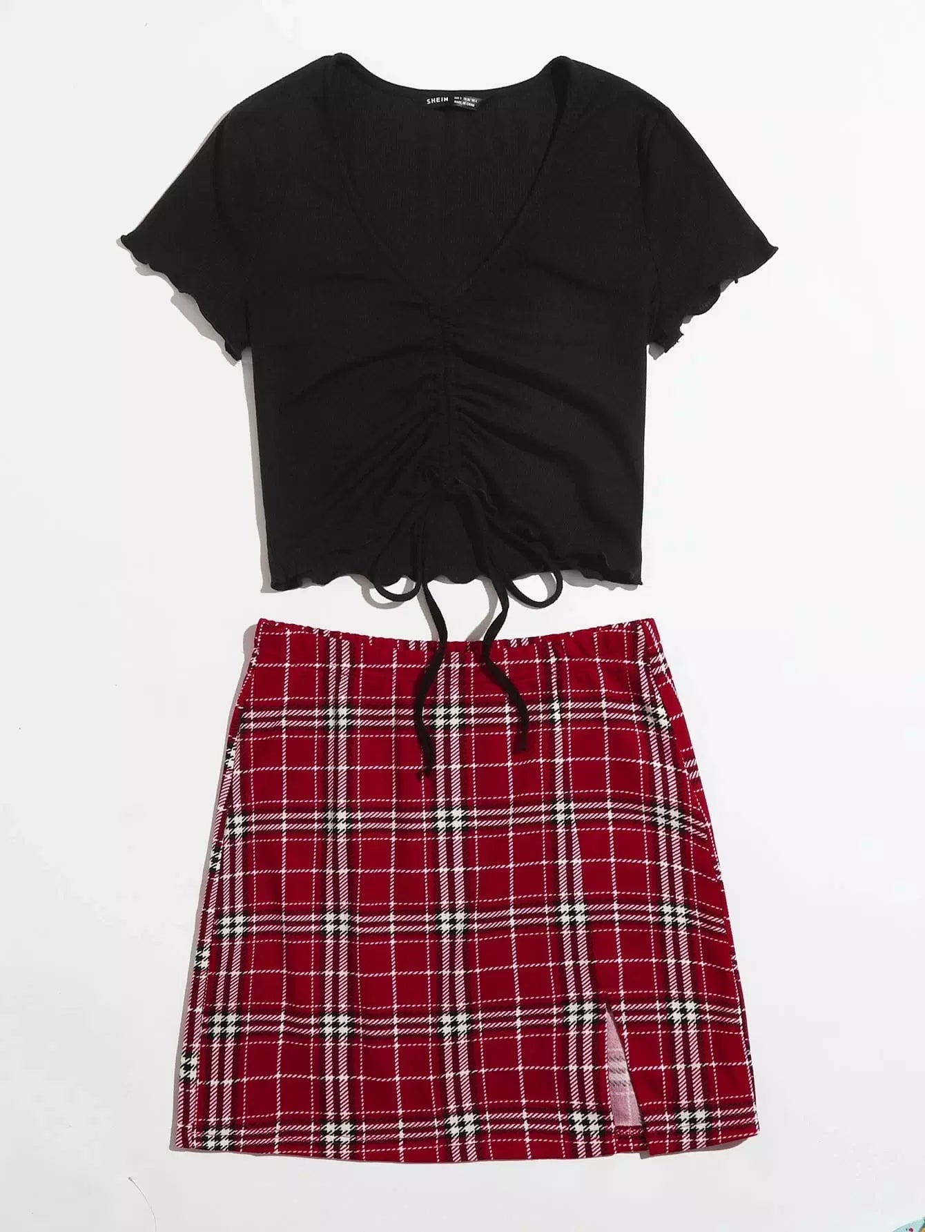 Drawstring Front Lettuce Trim Solid Top & Split Hem Plaid Skirt Set