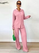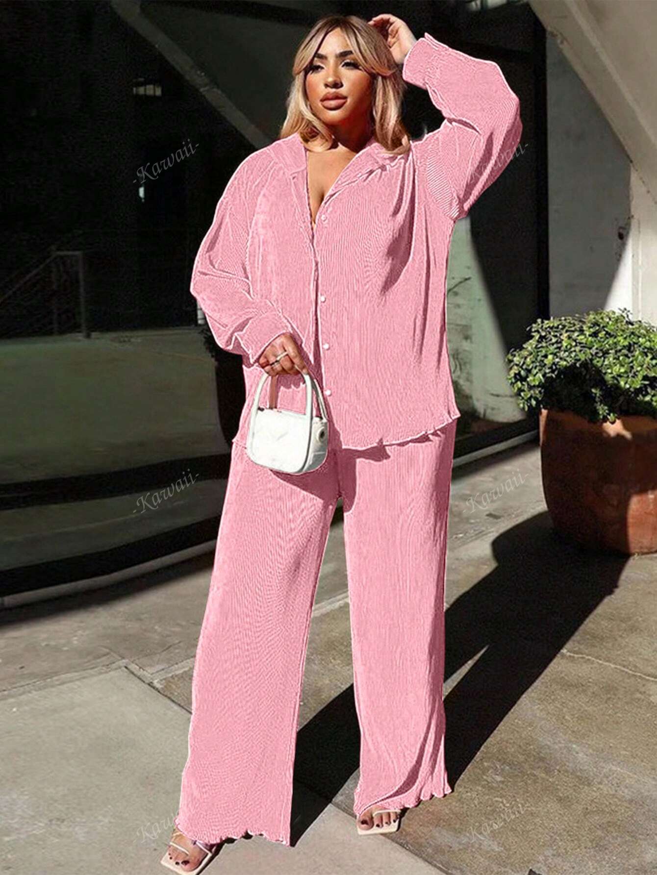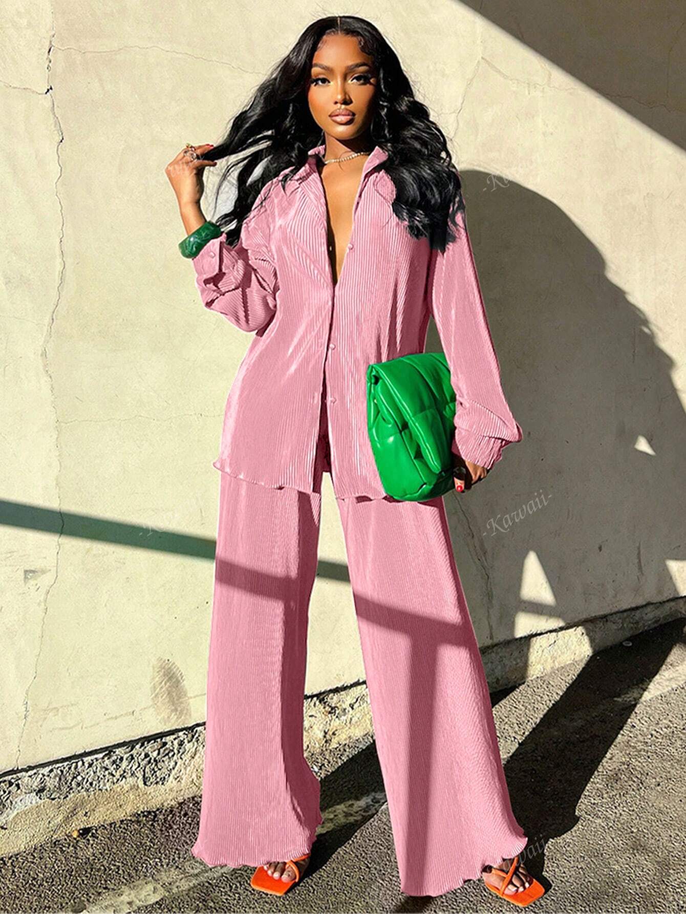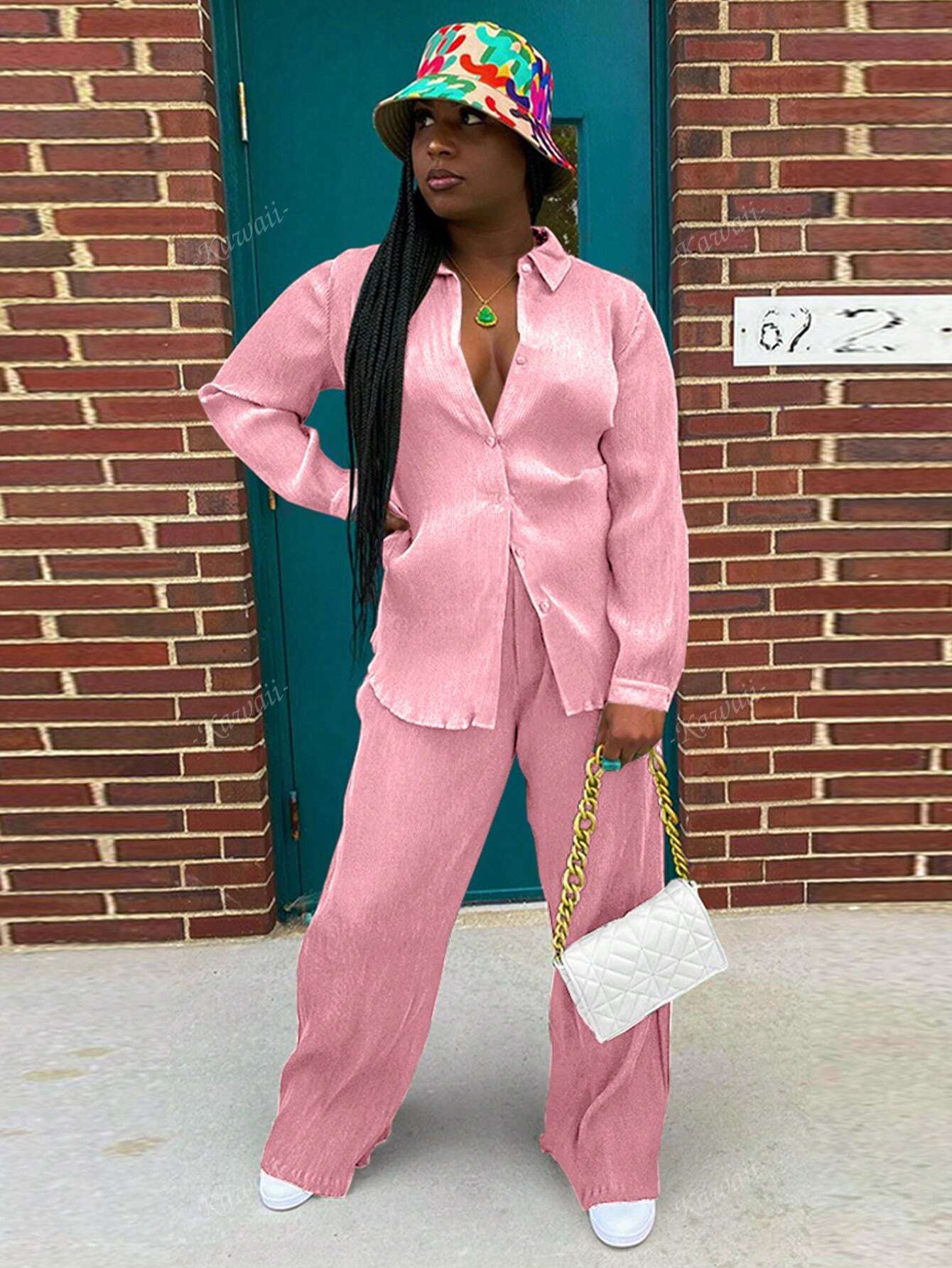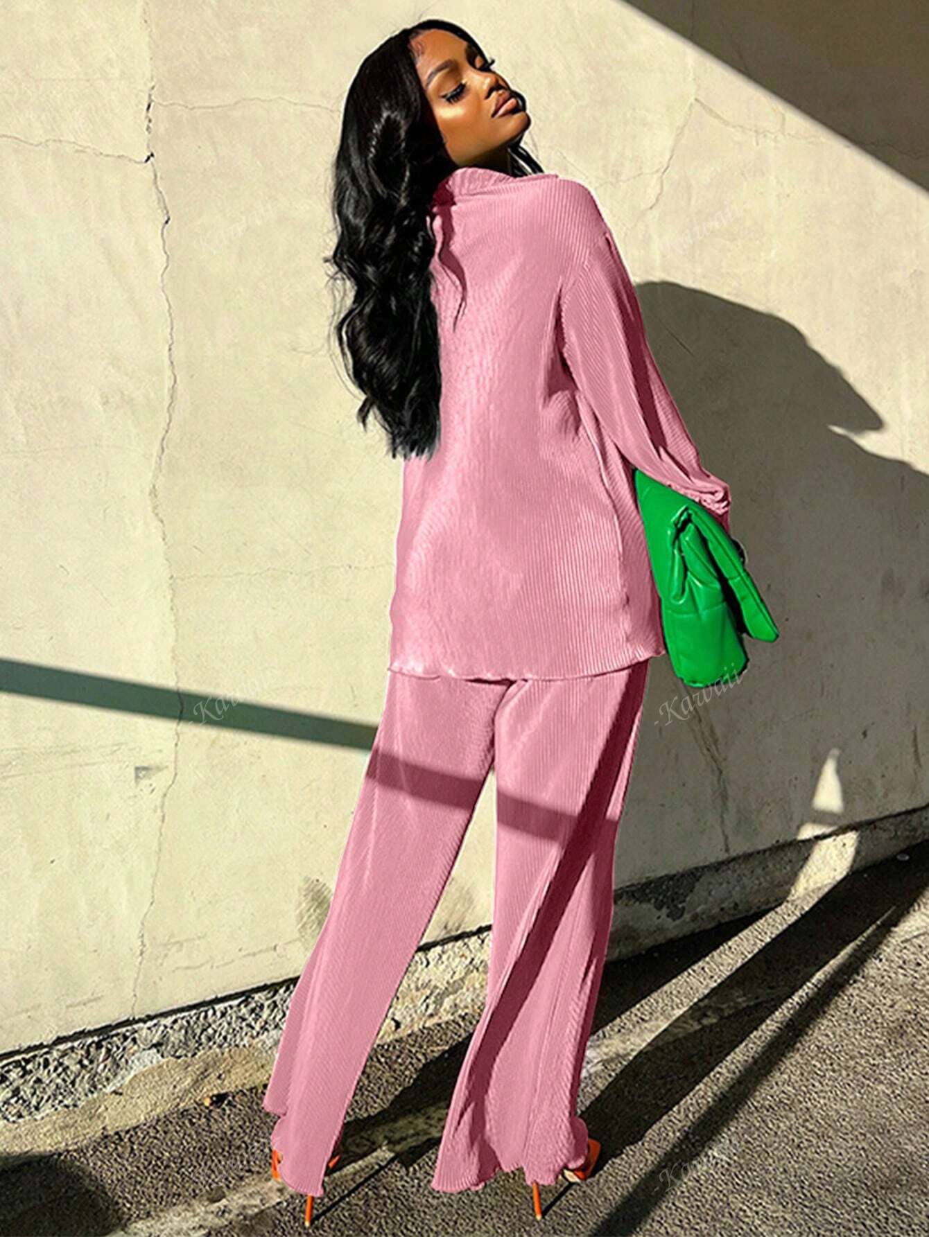 Fashionable Casual Pleated Shirt & Wide Leg Pants Set For Women, Comfortable And Stylish