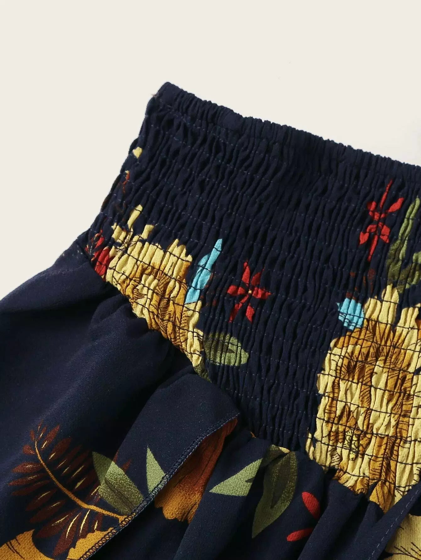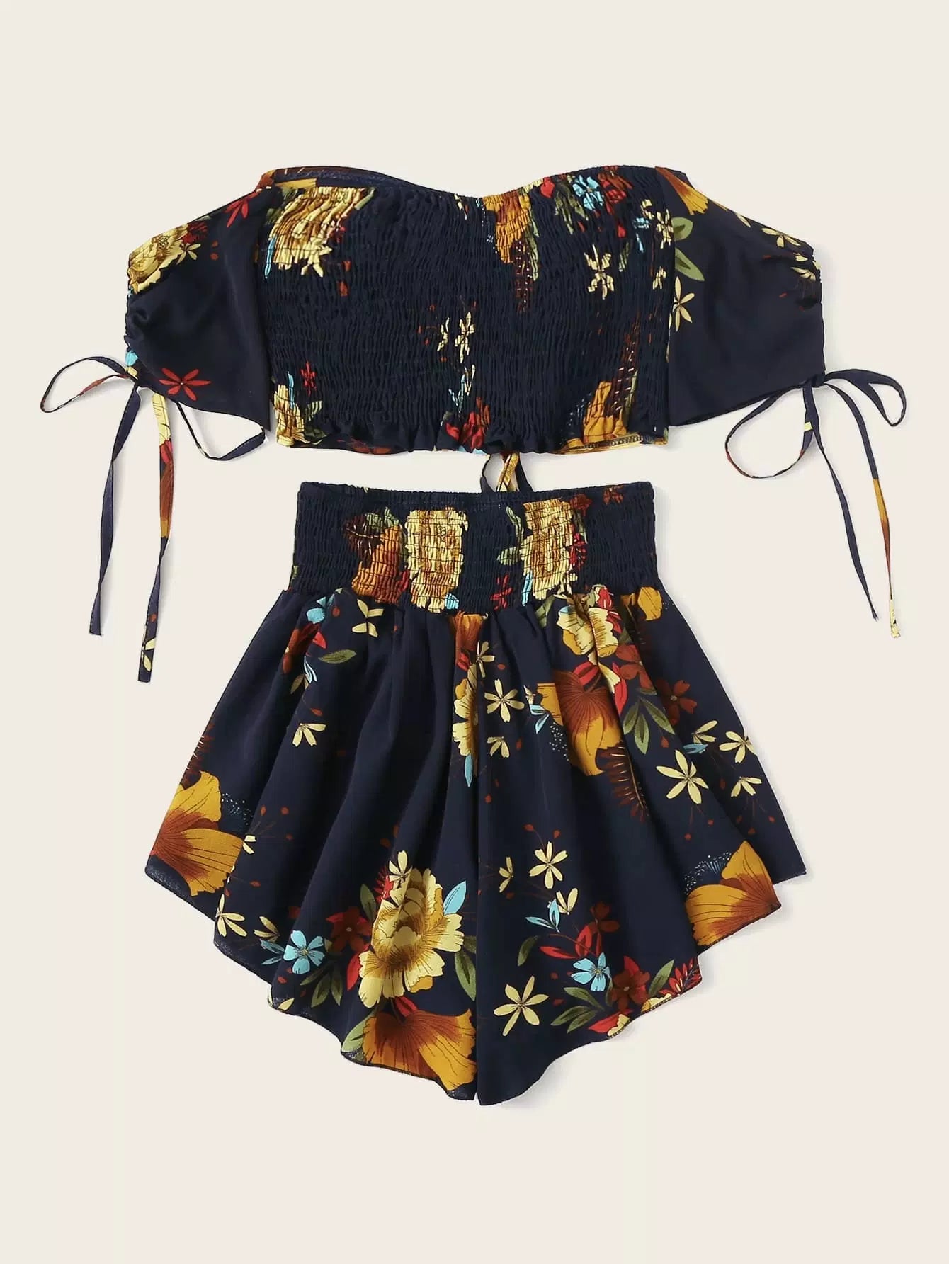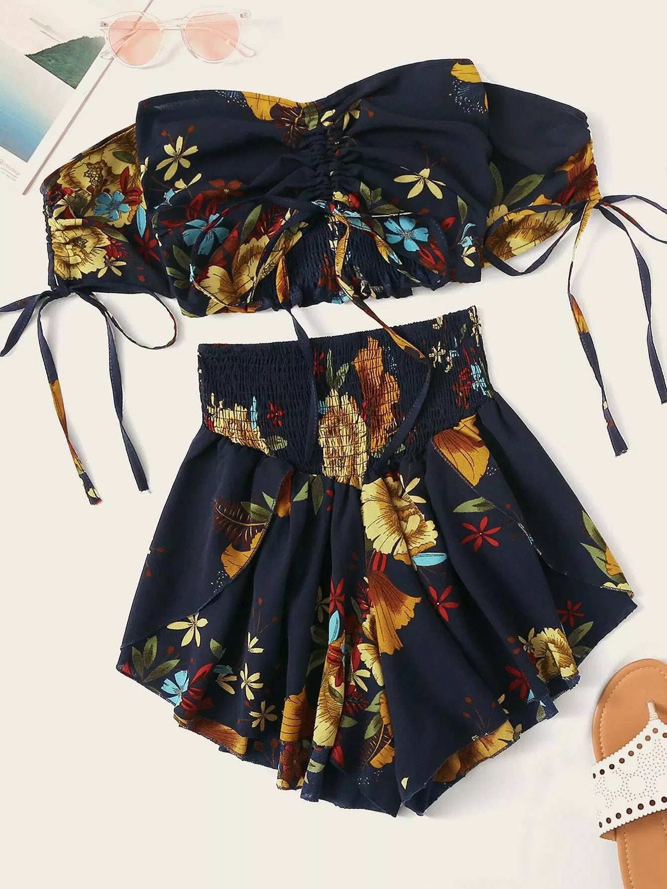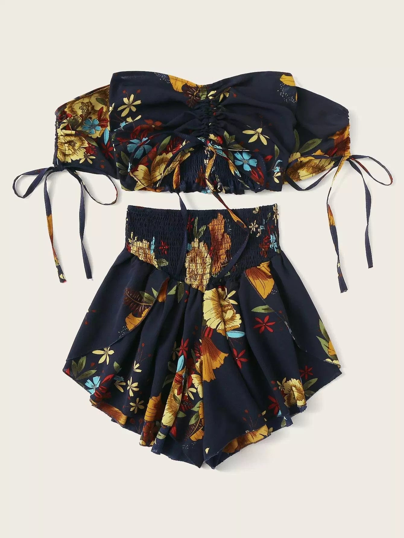 Floral Drawstring Ruched Top & Smocked Shorts Set