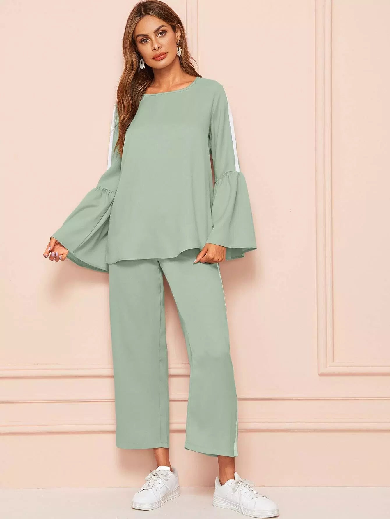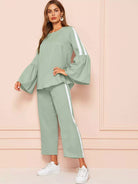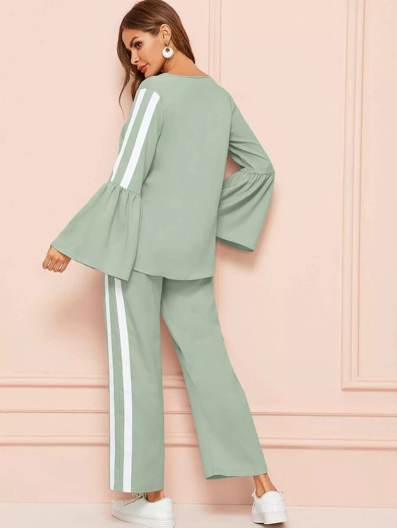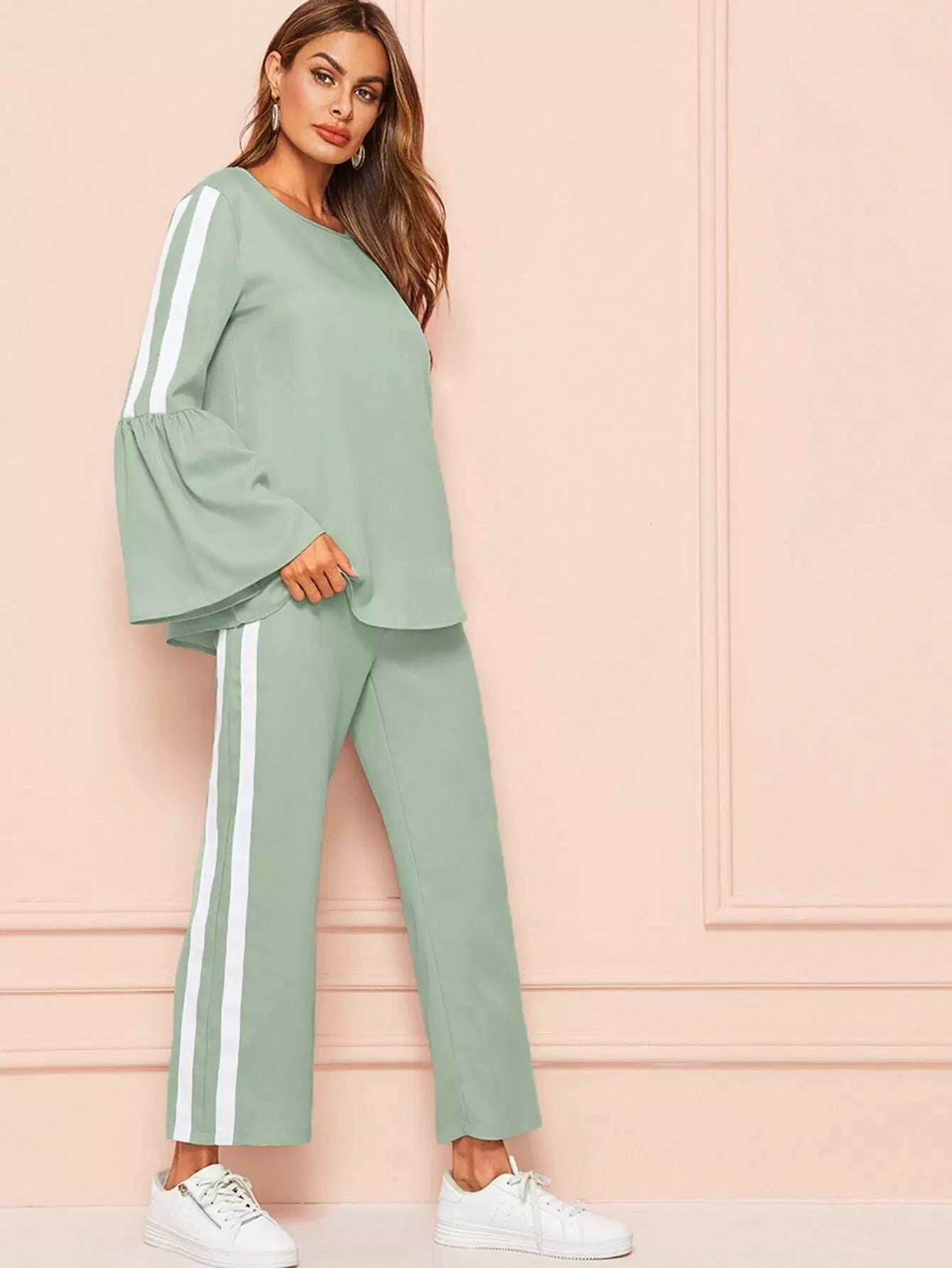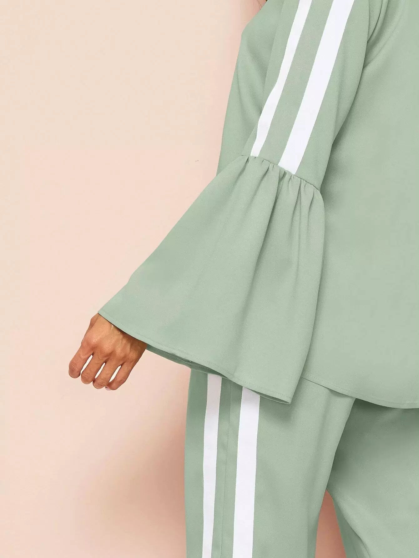 Flounce Sleeve Blouse & Tuxedo Stripe Side Pants