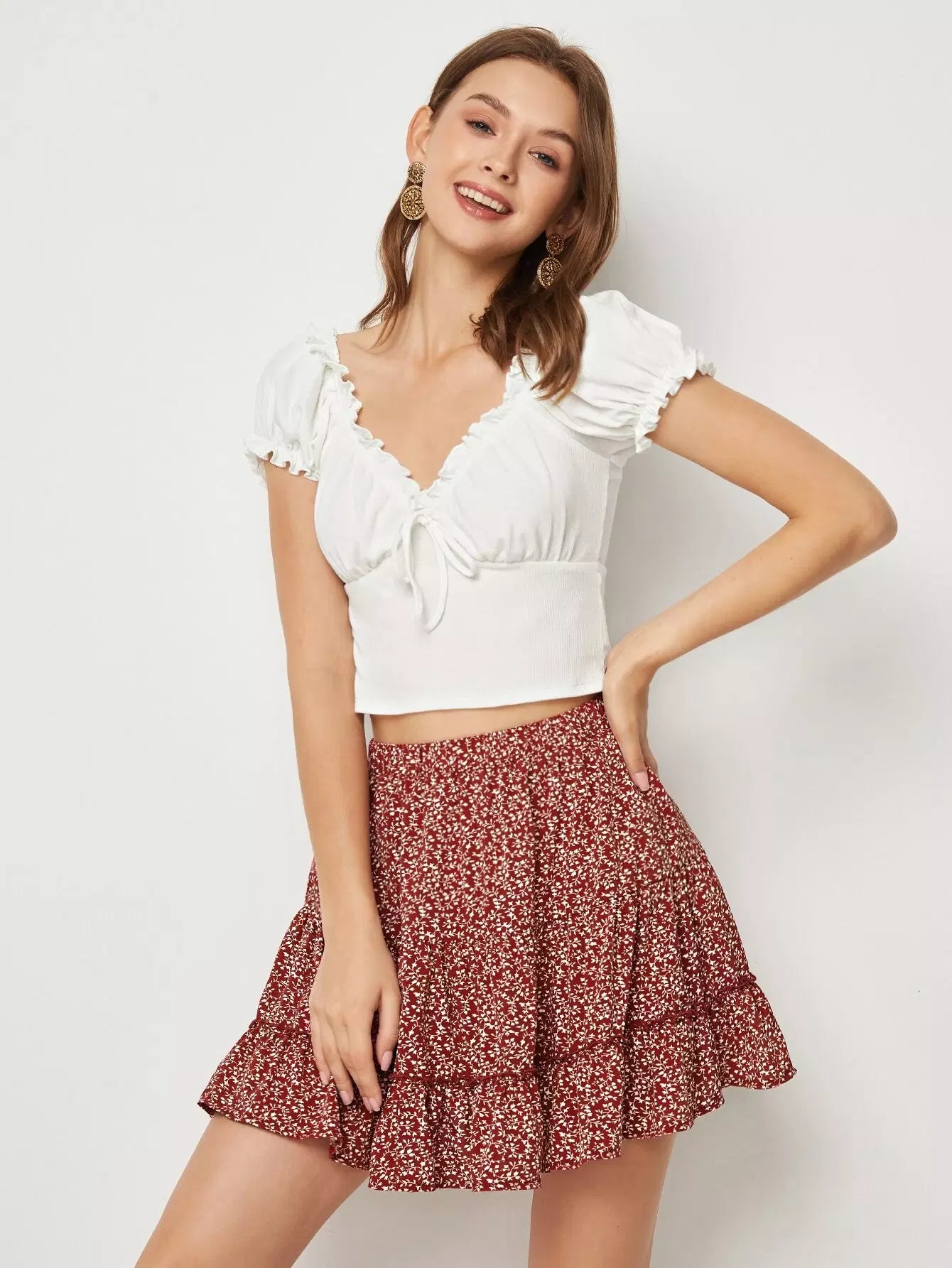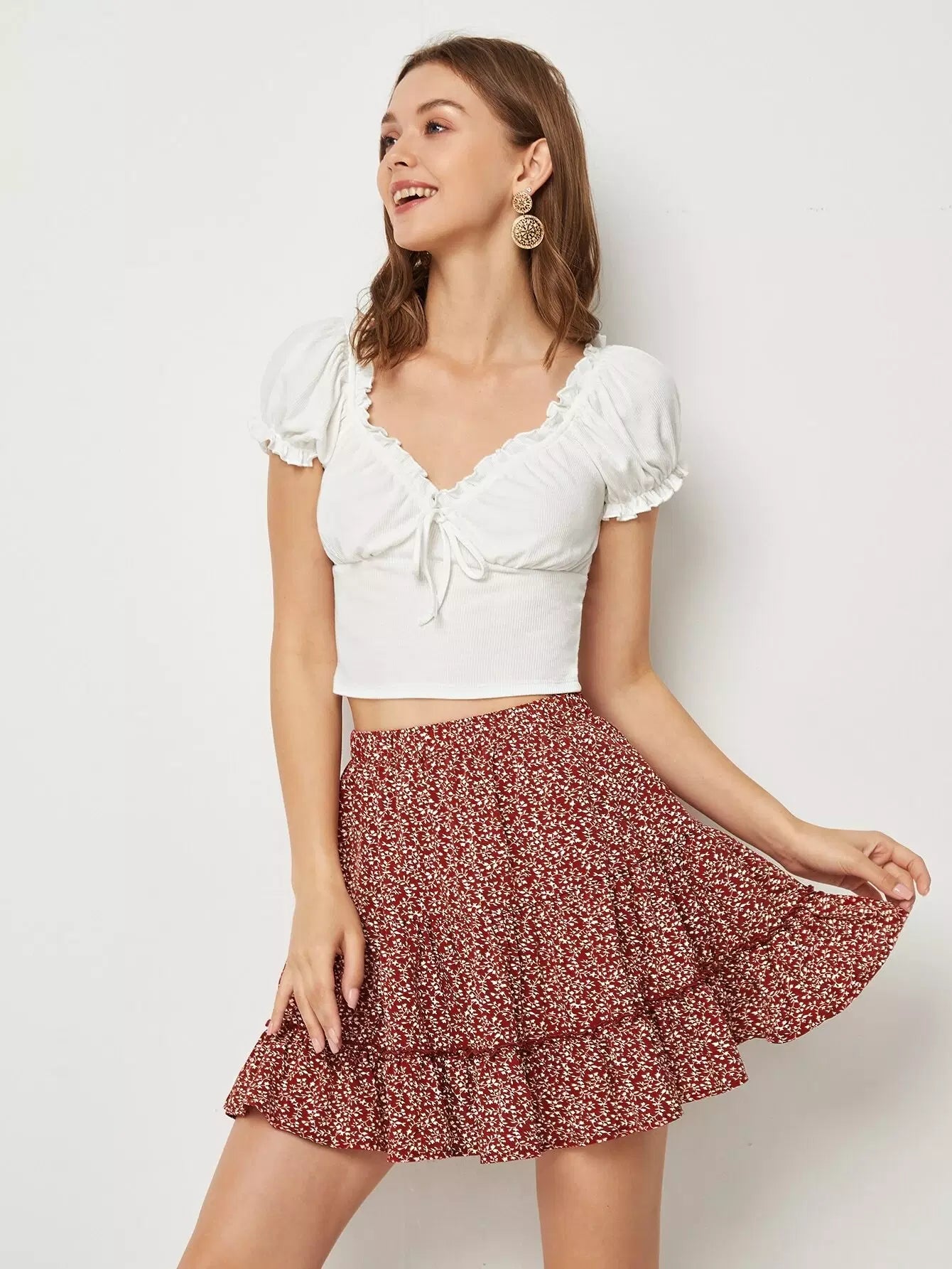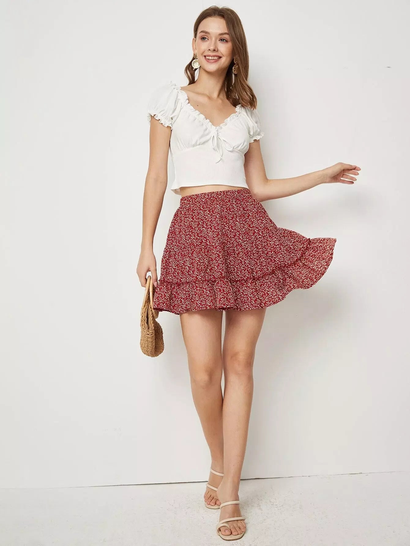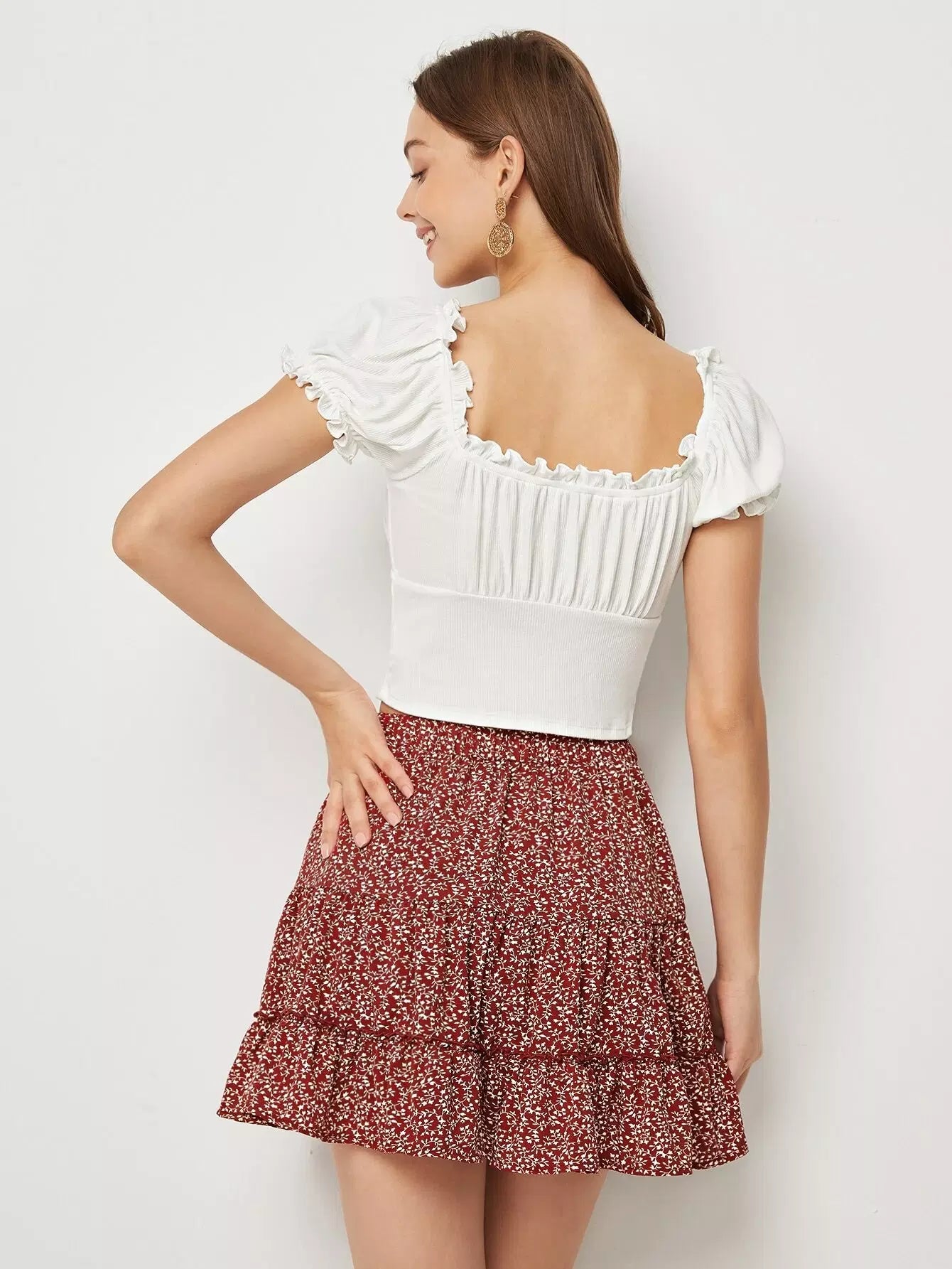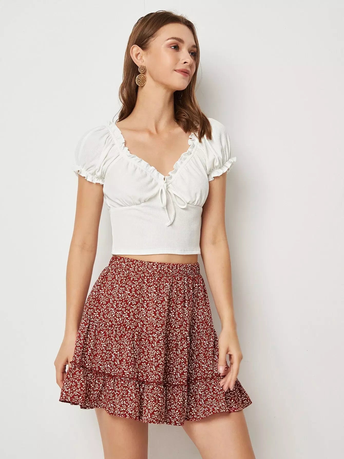 Frill Trim Bustier Crop Top & Ditsy Floral Skirt Set