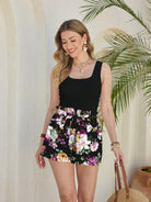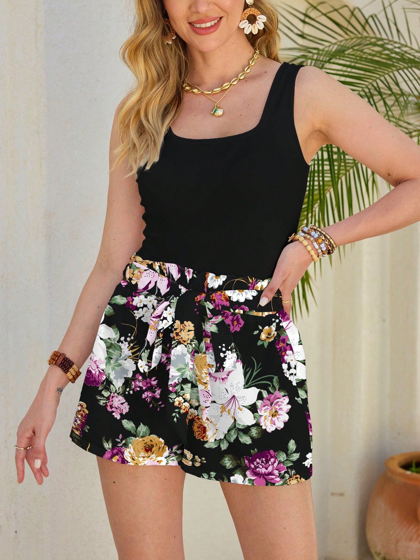 Glamance Vecteezy 2pcs/Set Women Floral Print Vacation Style Black Suit, Suitable For Summer Women Summer