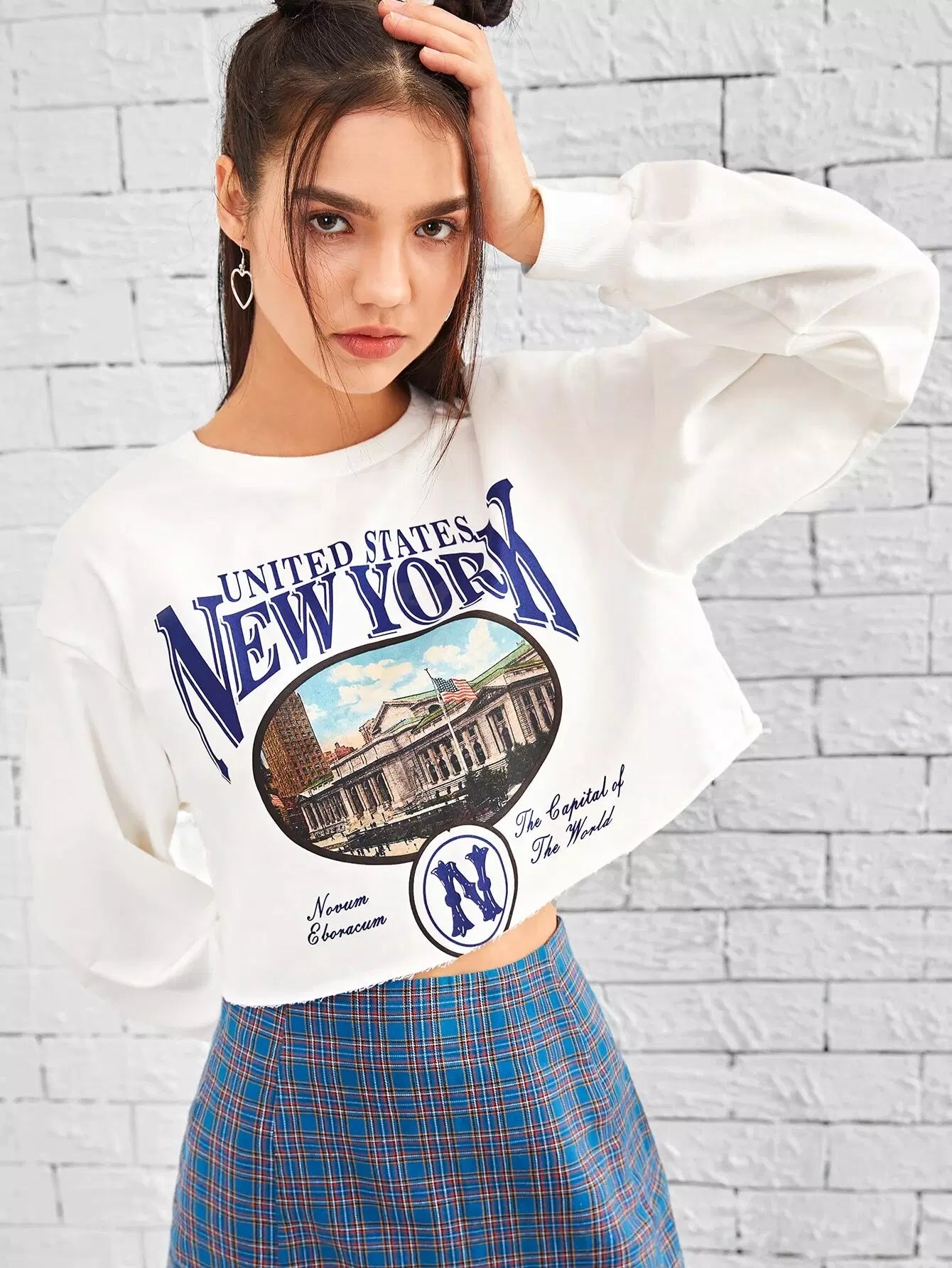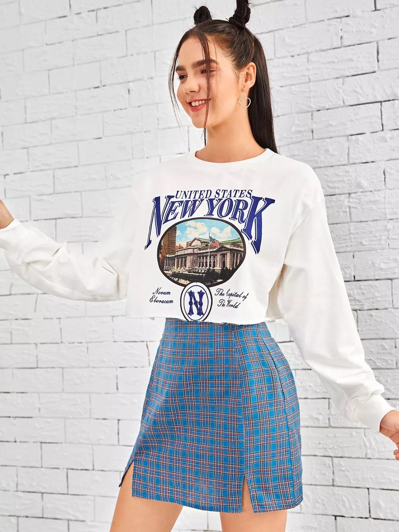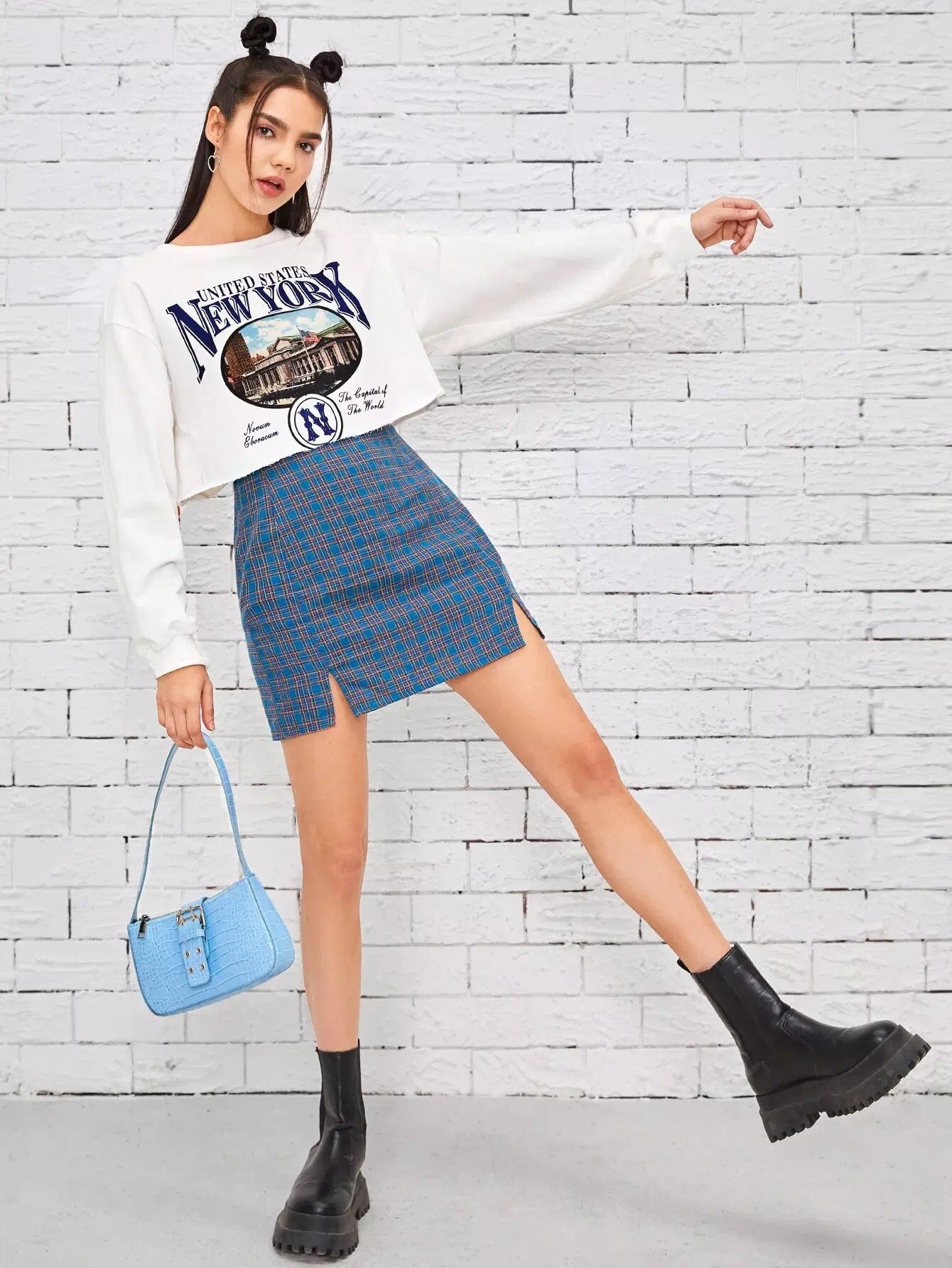 Graphic Print Crop Pullover & Plaid Print Skirt