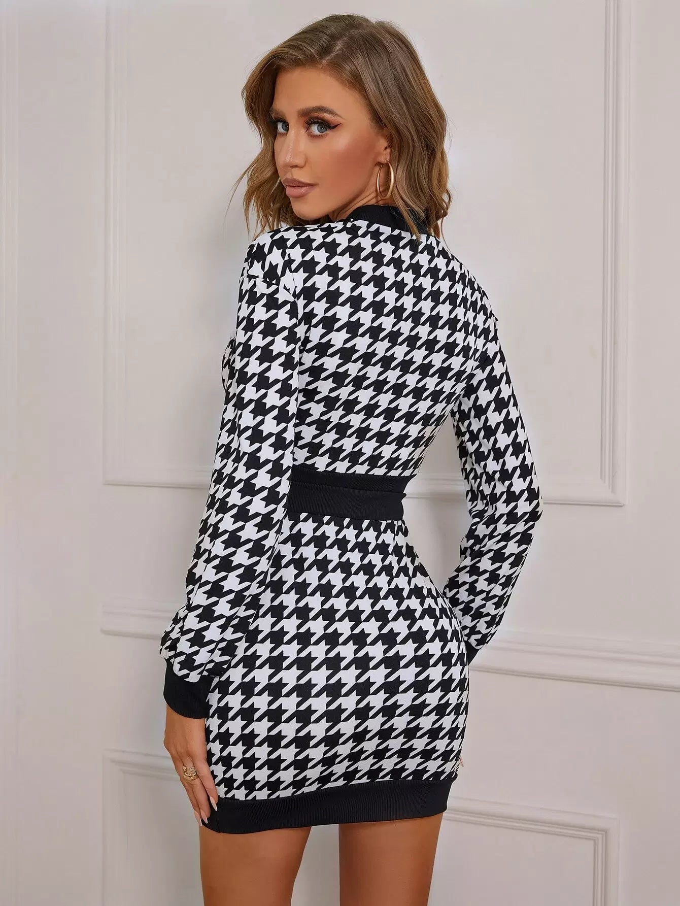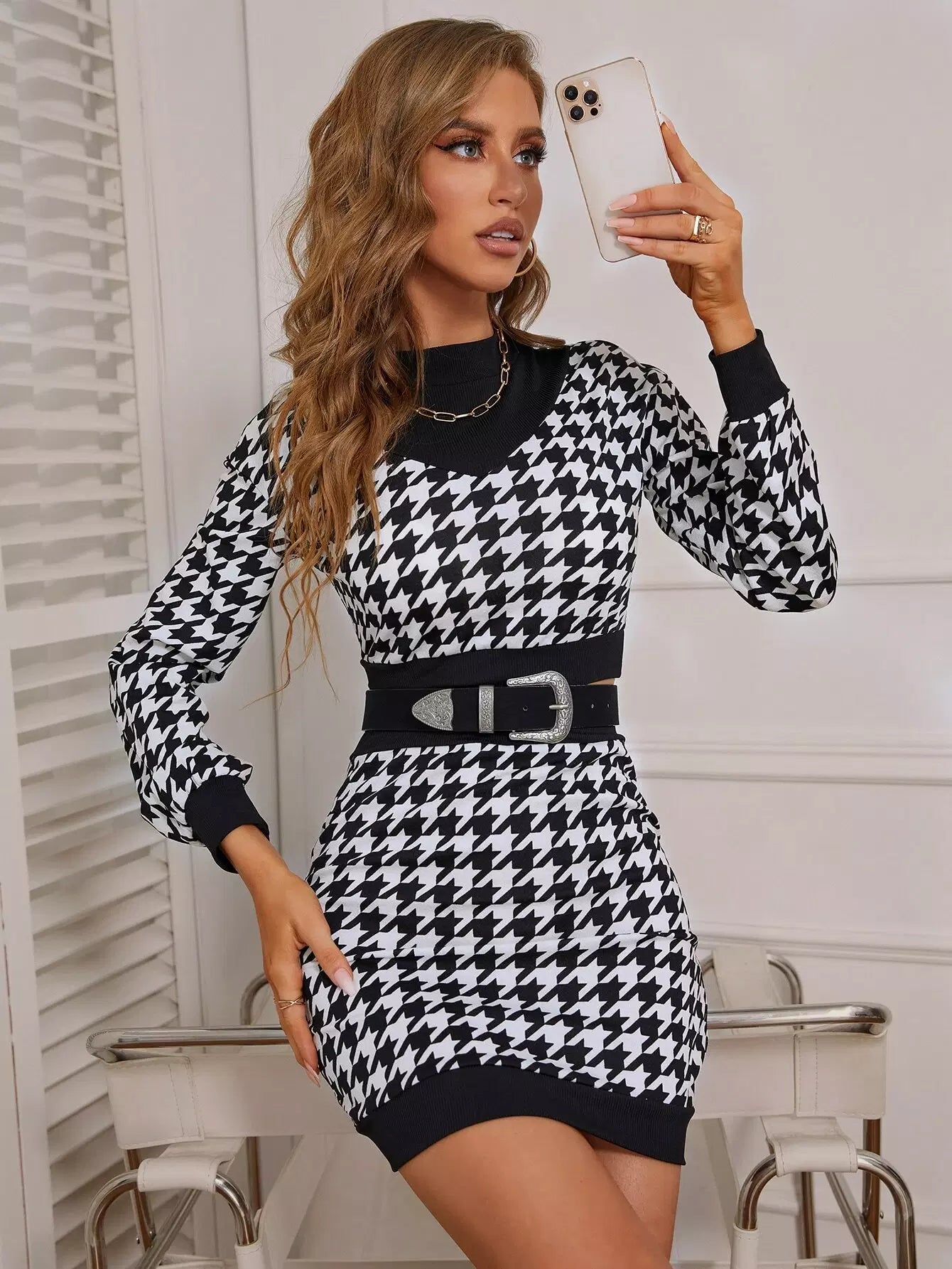 Houndstooth Print Stand Neck Crop Top & Bodycon Skirt Without Belt