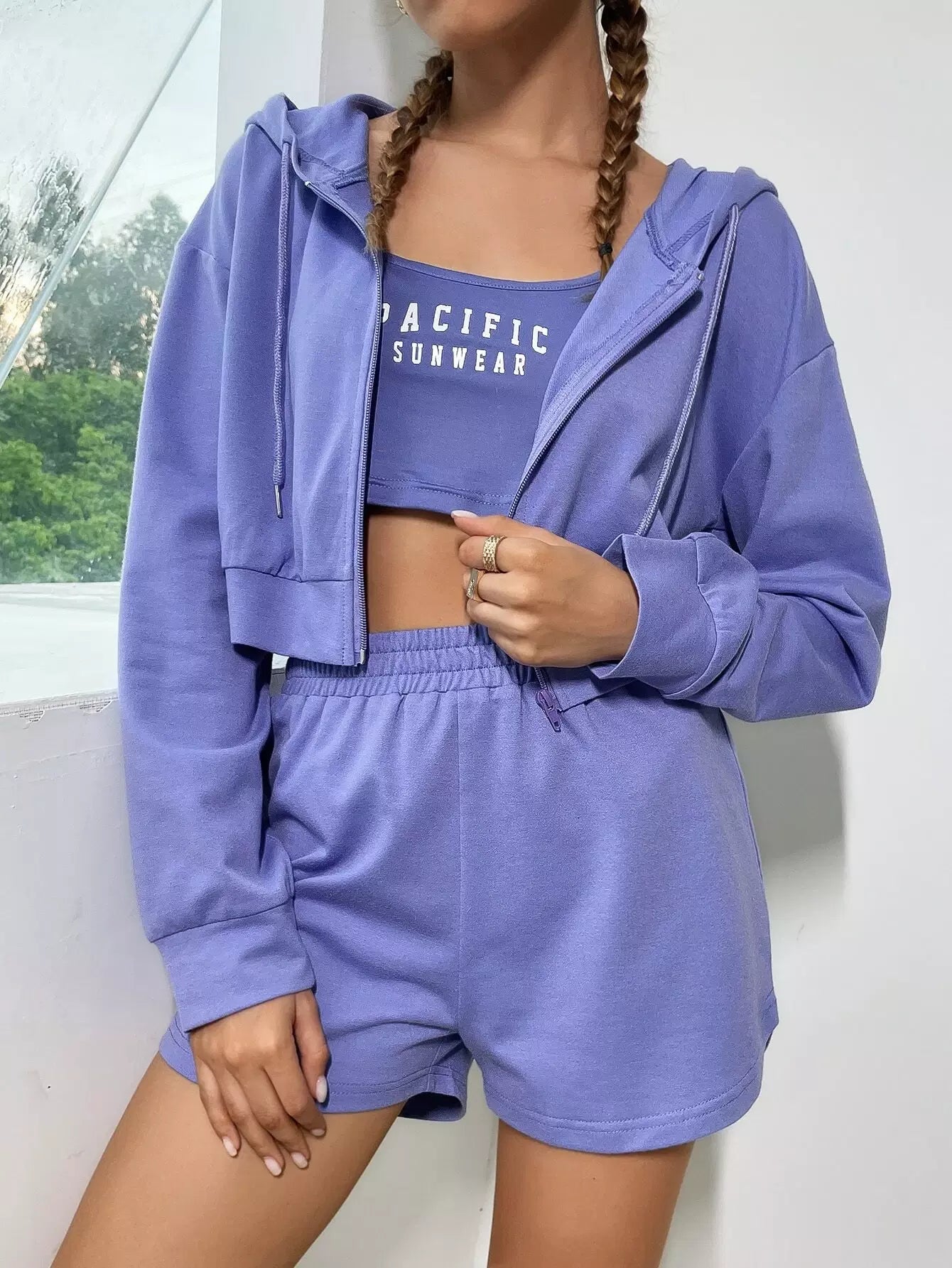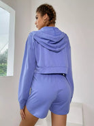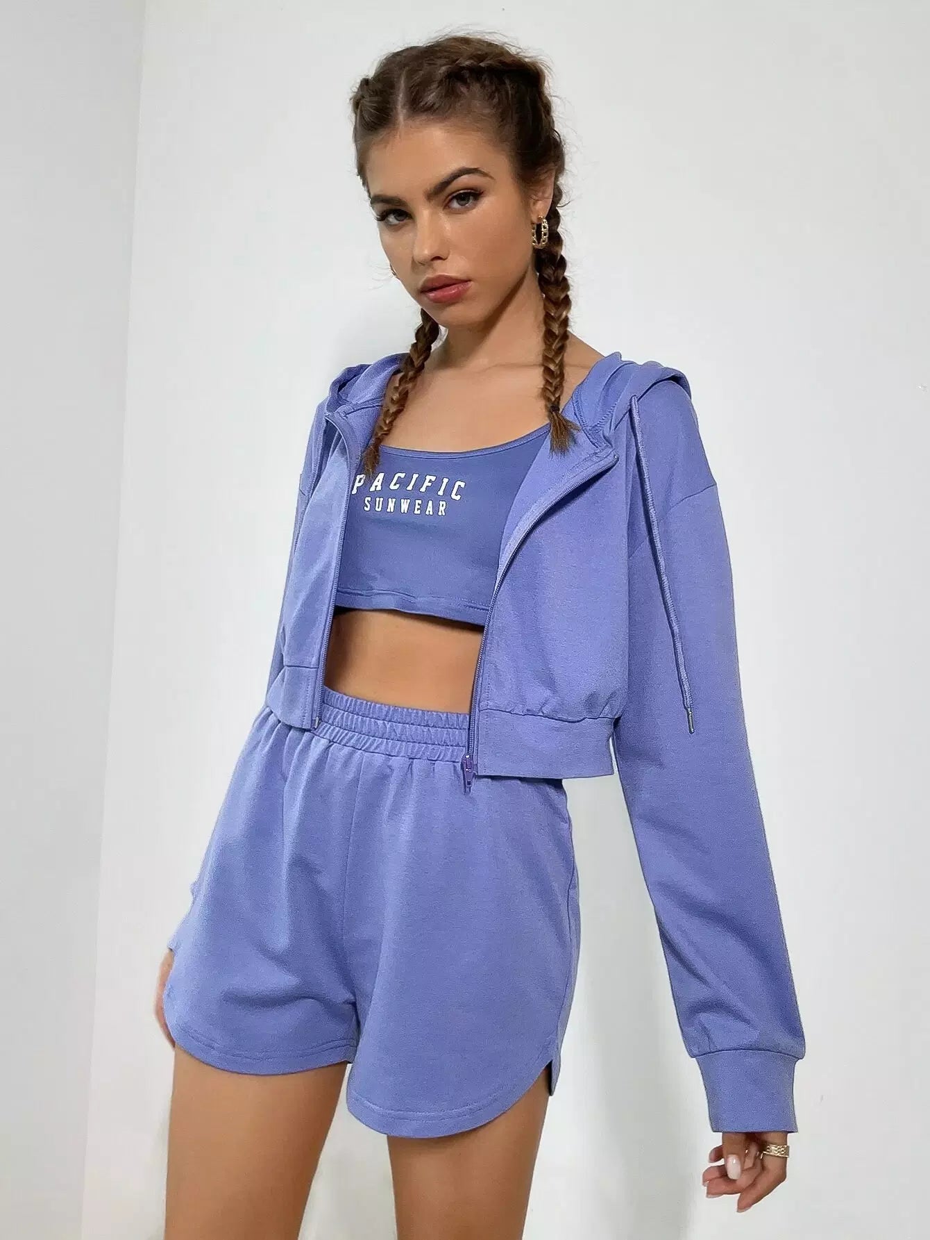 Letter Graphic Crop Tank Top & Track Shorts & Drop Shoulder Zip Up Drawstring Hoodie