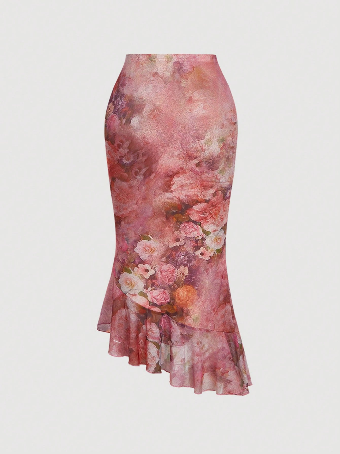 MOD Women's Boho Midi Dress Set: Brown Floral Print Mesh Fabric, Cowl Neck, Cap Sleeve, And Ruffle Hem